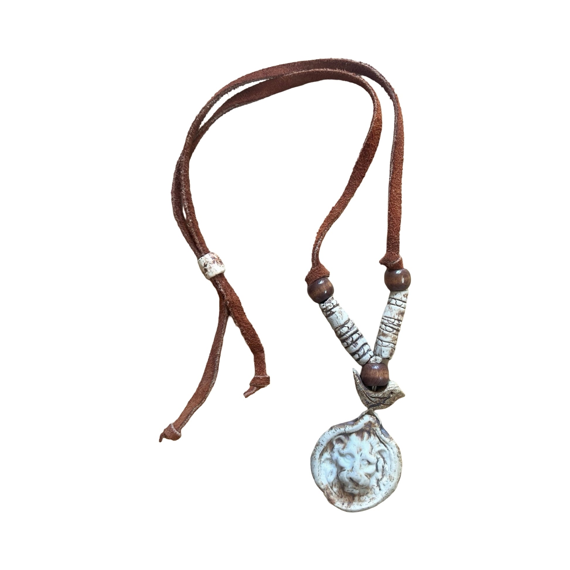 Vintage 70’s Handmade Pottery and Leather Adjustable Necklace w/ Lion & Bird