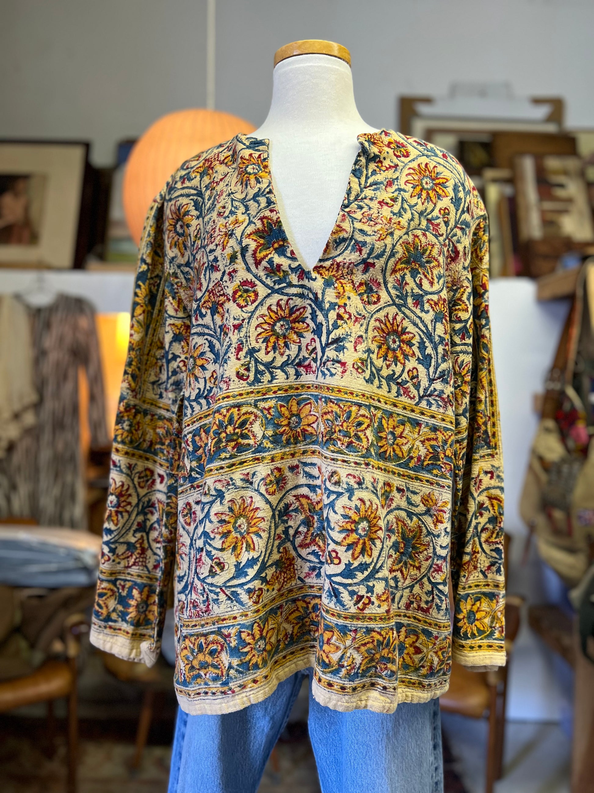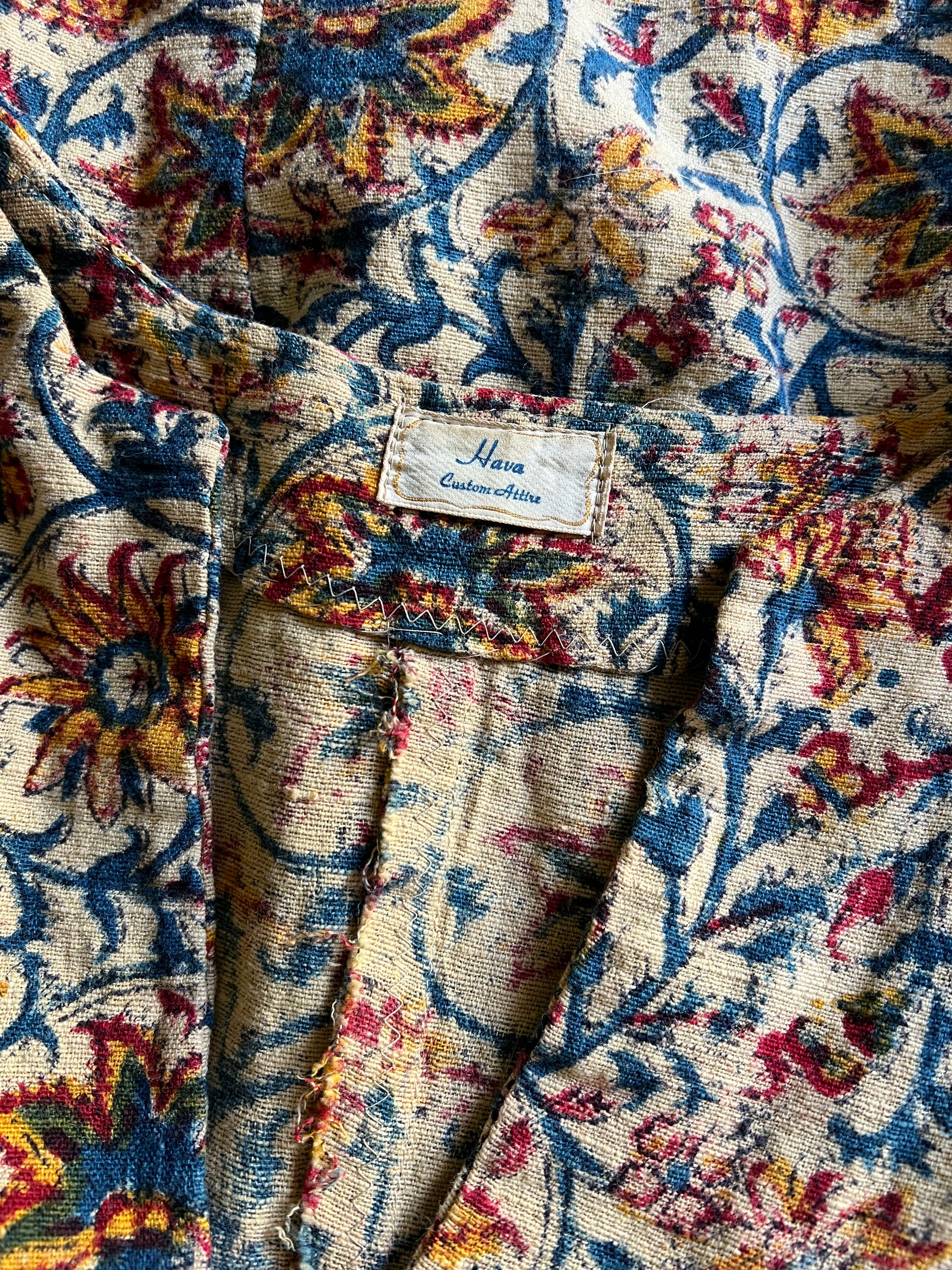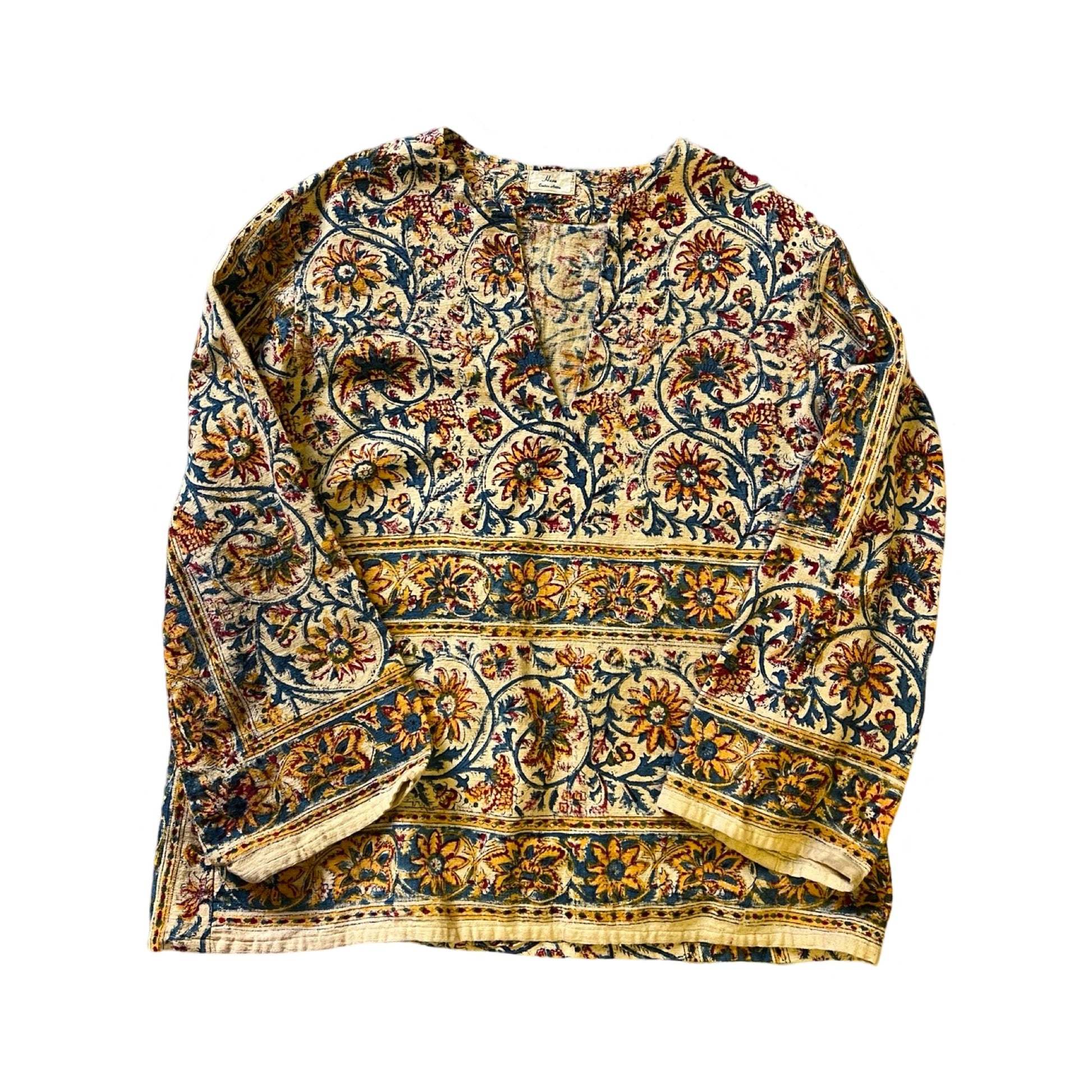 Very rare vintage 70’s mens block print tunic by Hava Custom Attire. Beautiful floral print on a creamy yellow background, sturdy cotton gauze with slight bell sleeves. Measures 23” pit to pit and 28” top to bottom. Rare to find a mens size in this great condition.