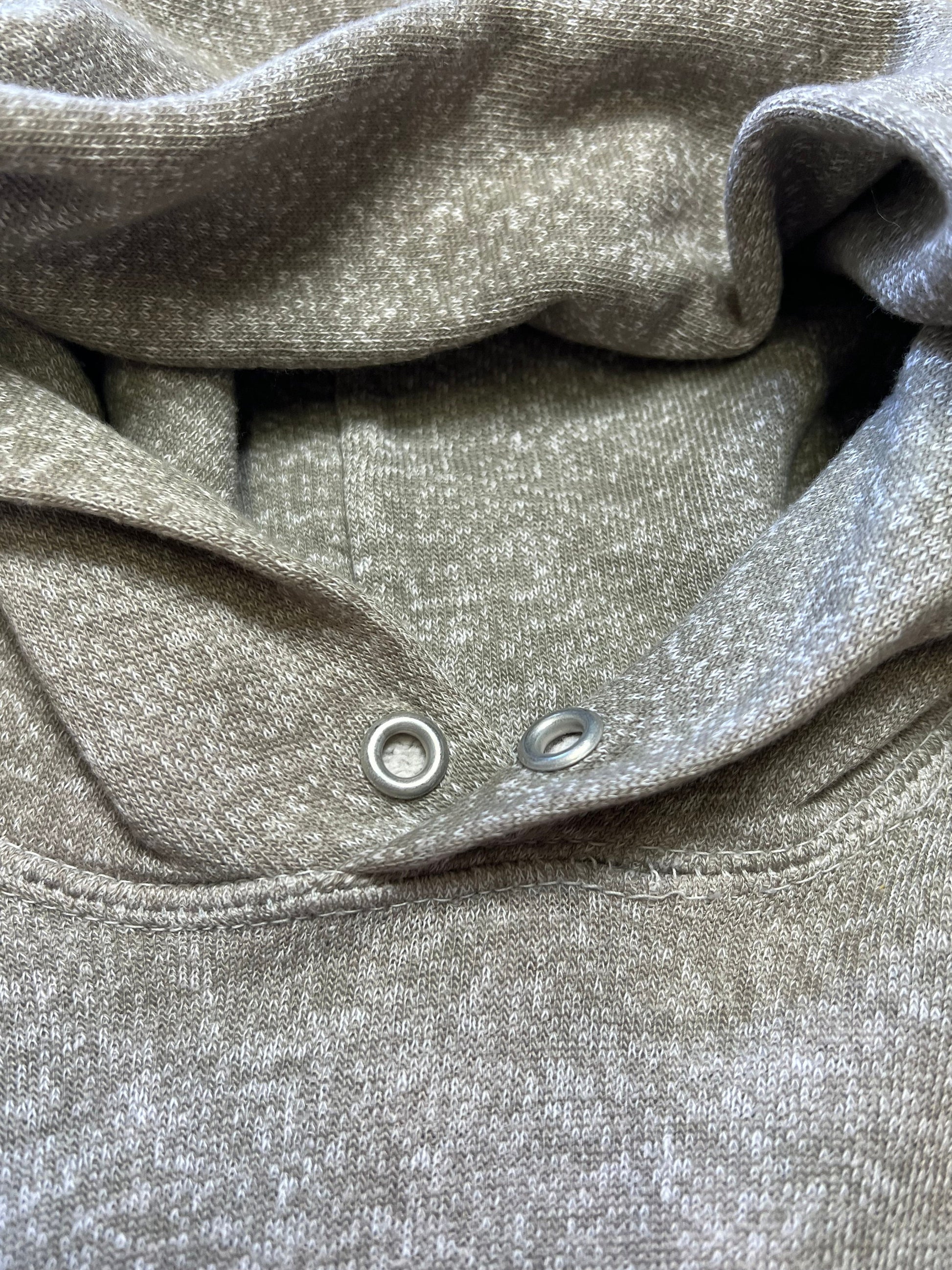 This hoodie is soooo soft and thin and beautifully broken in. Really nice brownish/grayish color and super cozy. Small separation at seam of front pouch pocket and no drawstring. Measures 21” pit to pit and 22” top to bottom.
