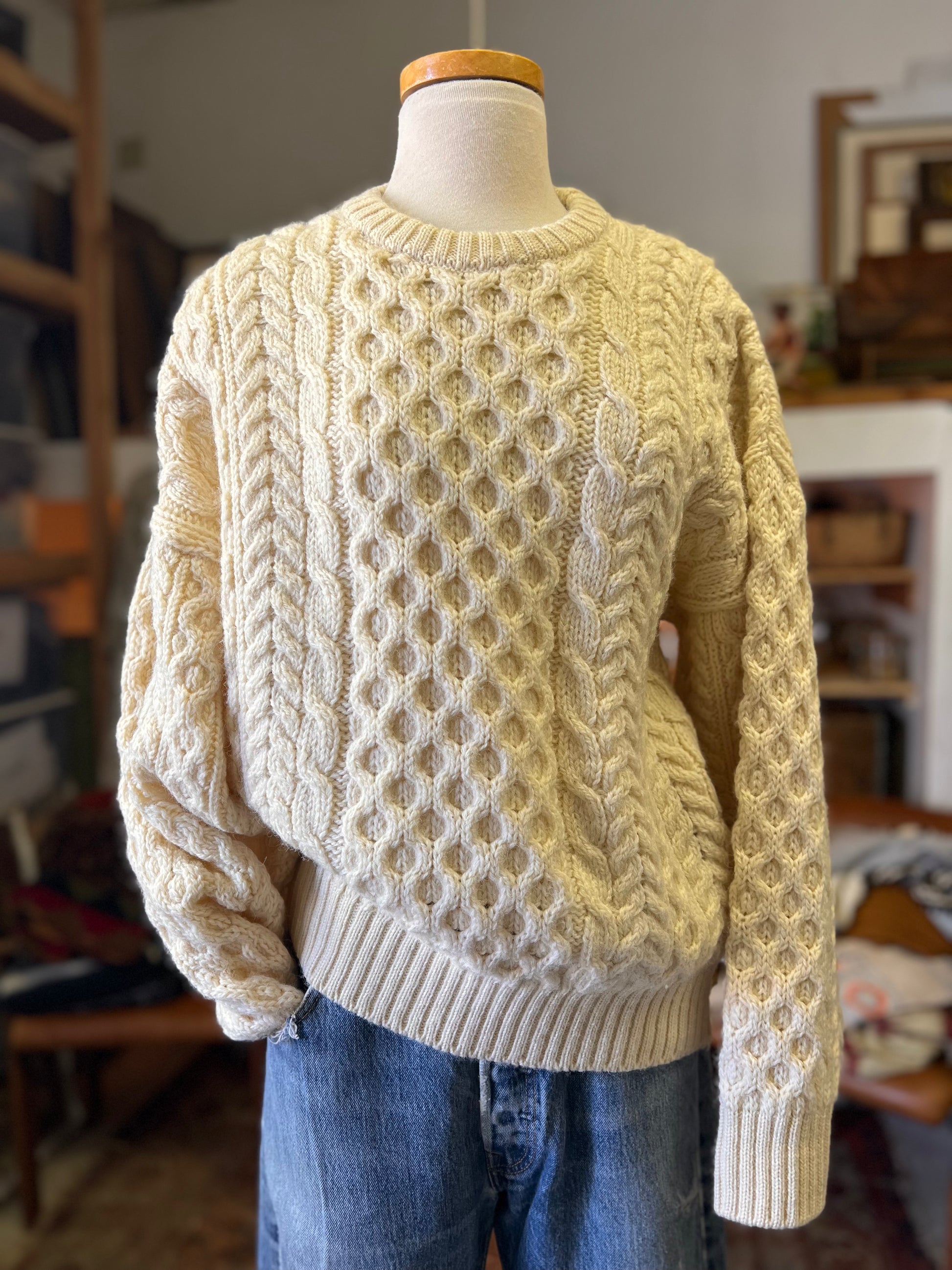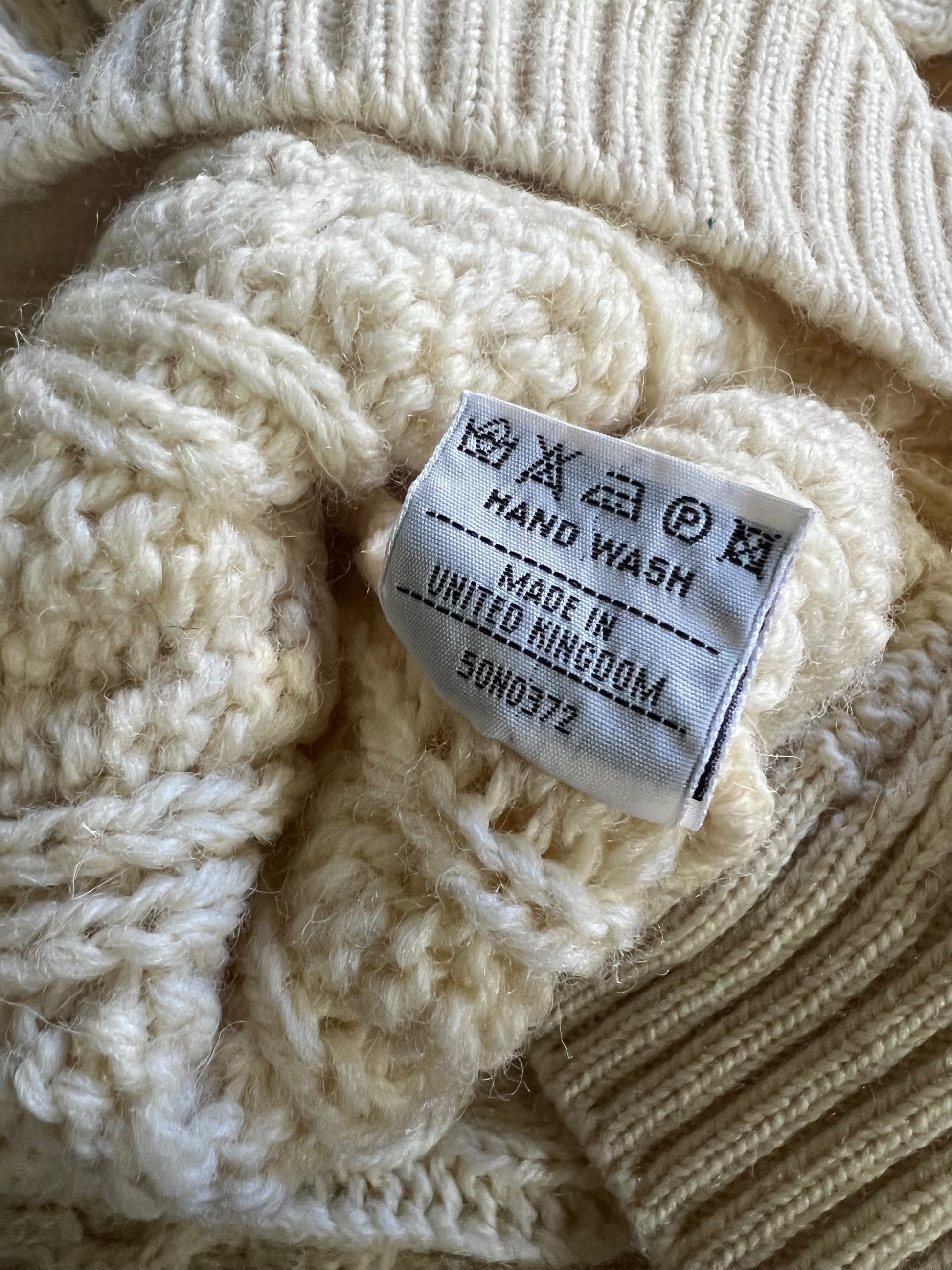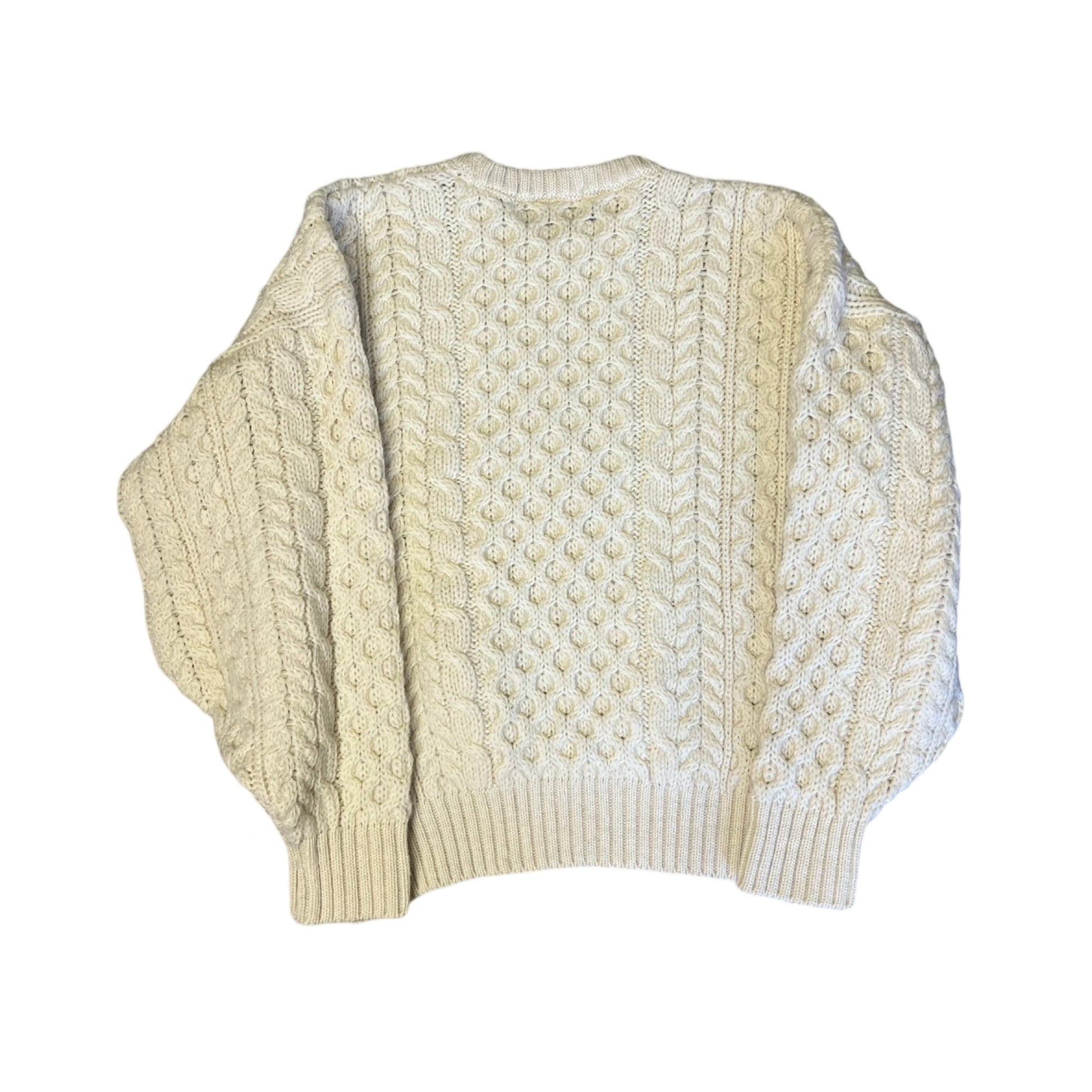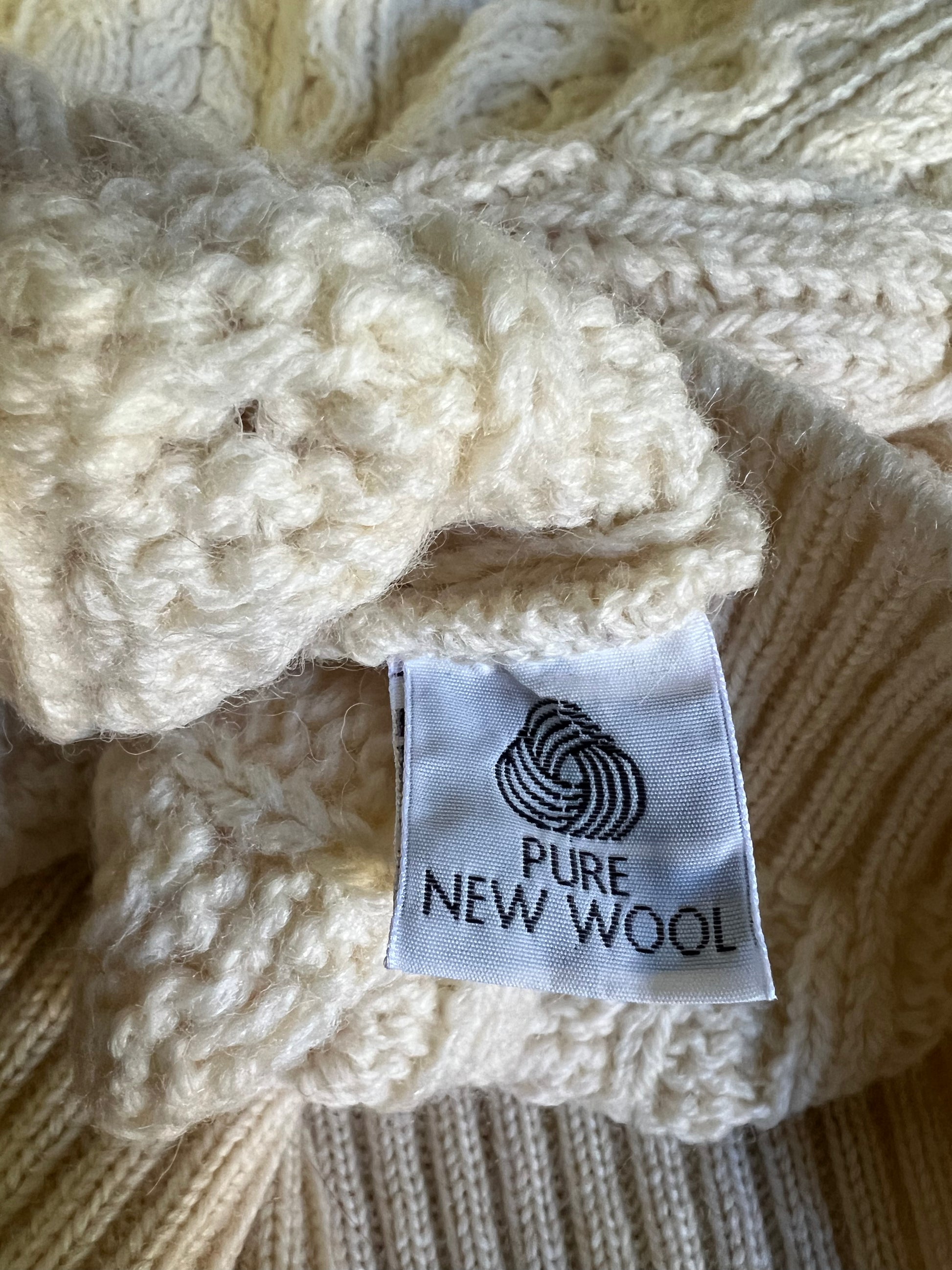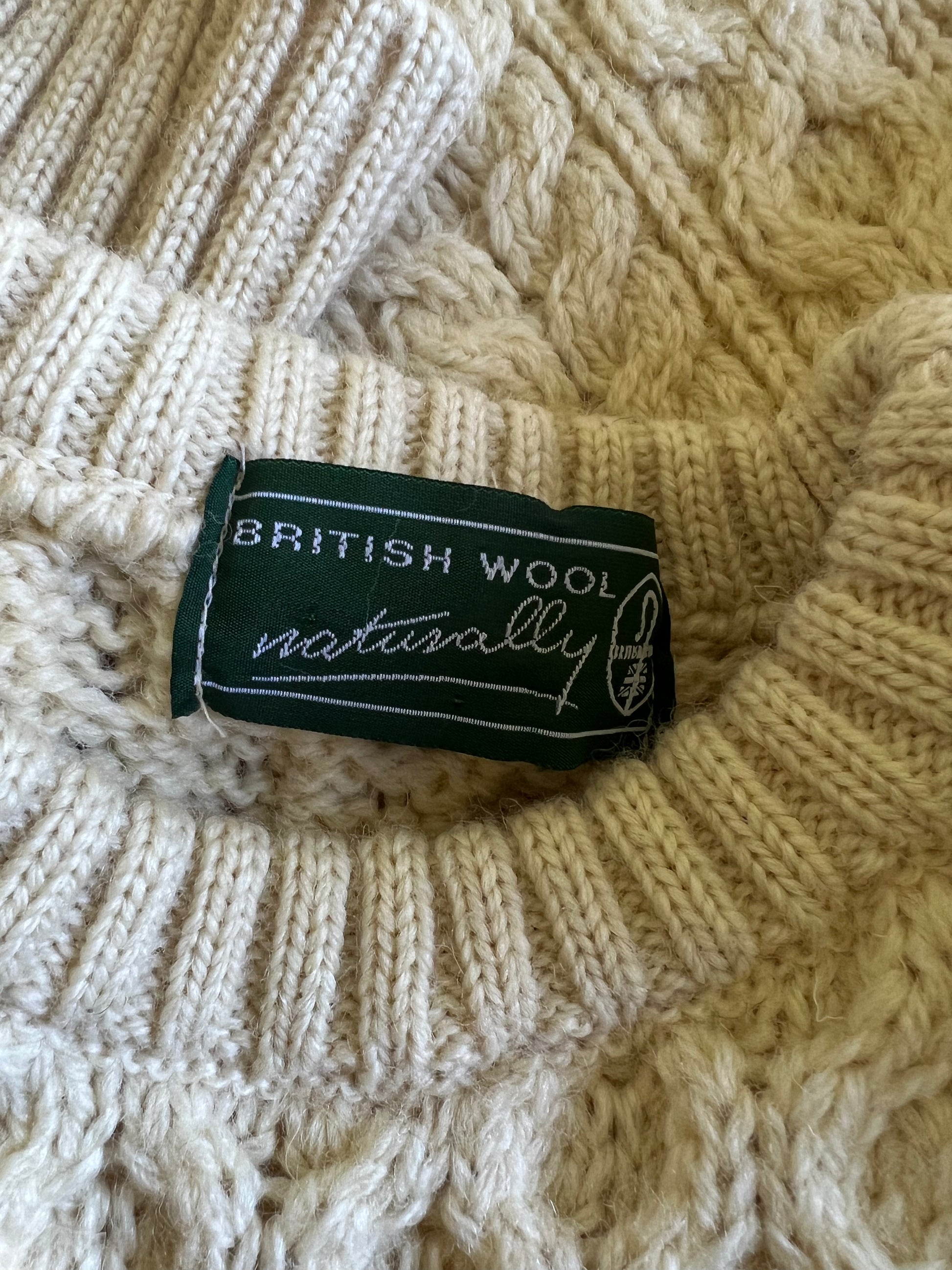 Beautiful vintage cable knit fisherman’s sweater by British Wool Naturally. 100% new wool, made in the United Kingdom. Looks never worn! Perfect fall/winter old school New England vibes. Measures 24” pit to pit and 25” top to bottom.