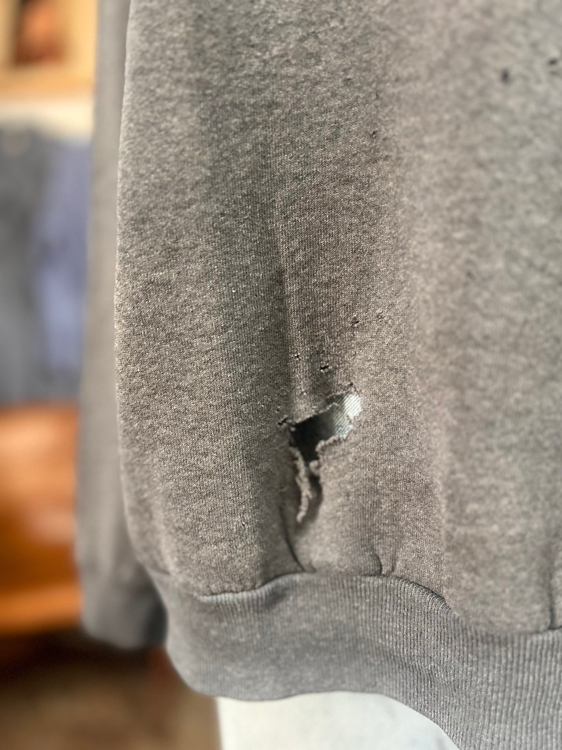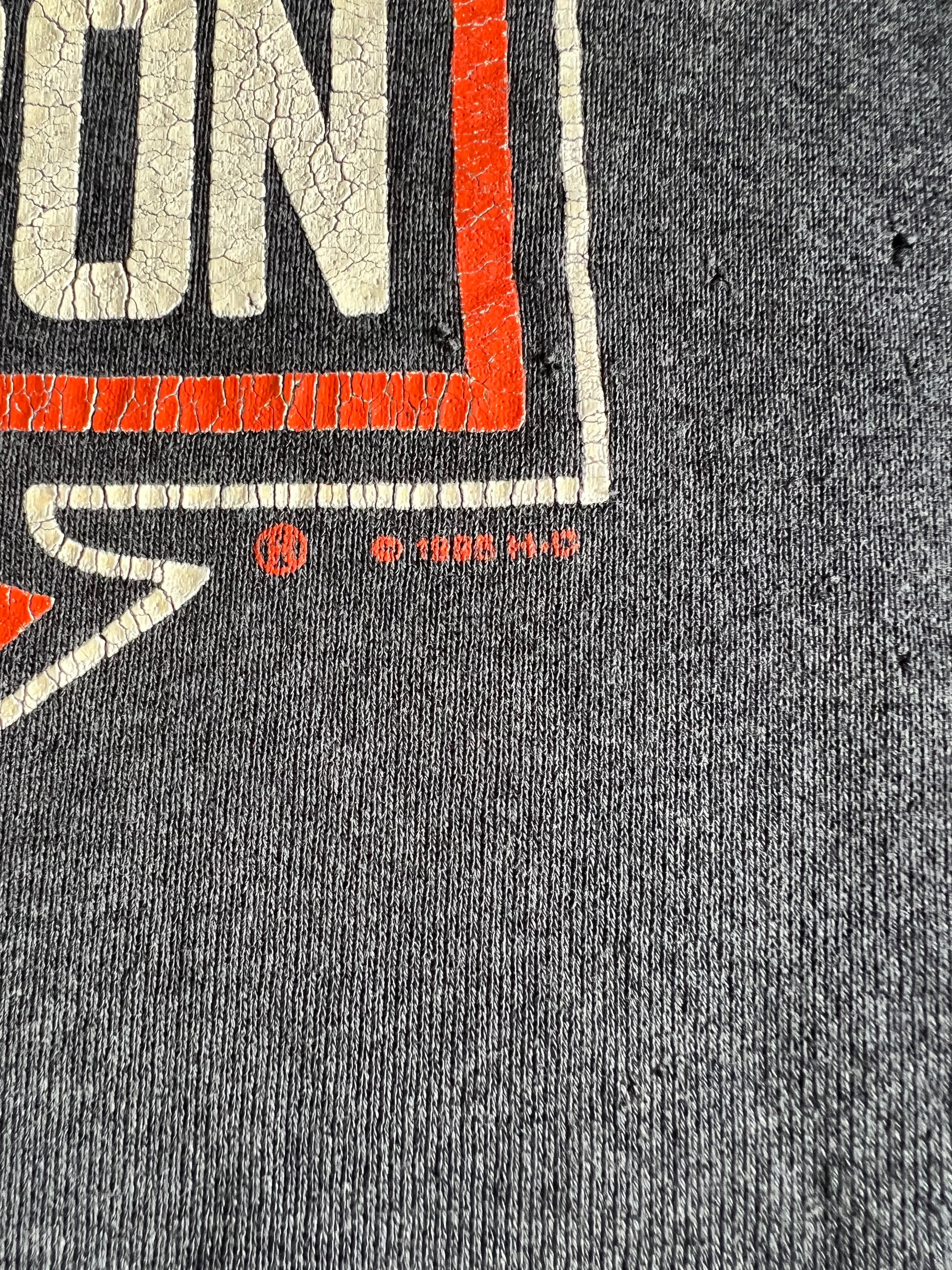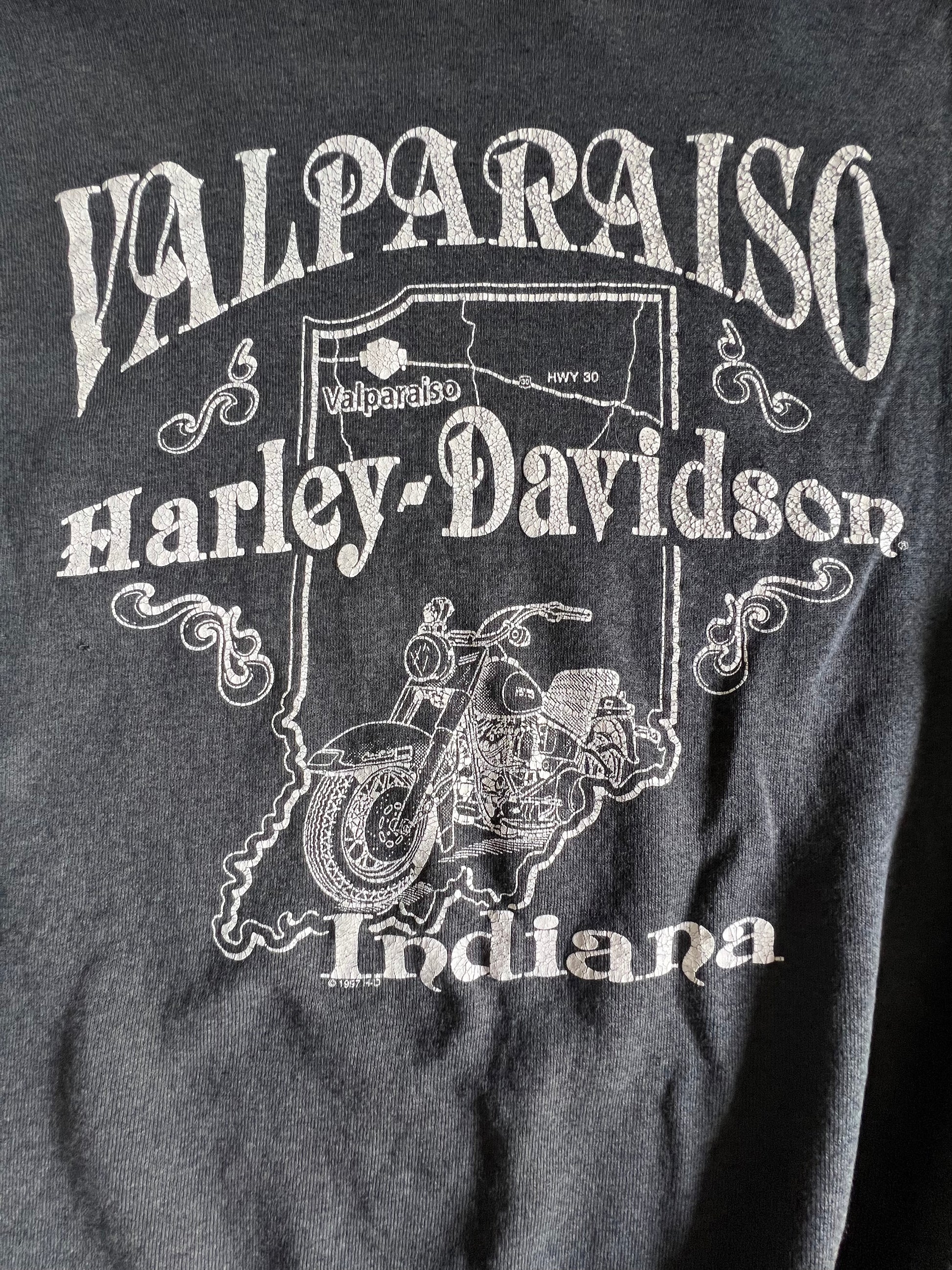 What an incredible vintage Harley sweatshirt!! Super distressed with faded cracked graphics, paint, and holes throughout (notably a big one in front bottom). Valparaiso Indiana on back. A 1985/95 (?) copyright mark with front graphic and a 1997 copyright with back graphic. Very soft and thin and cozy and lived in and amaaazing, this one is SO GOOD.