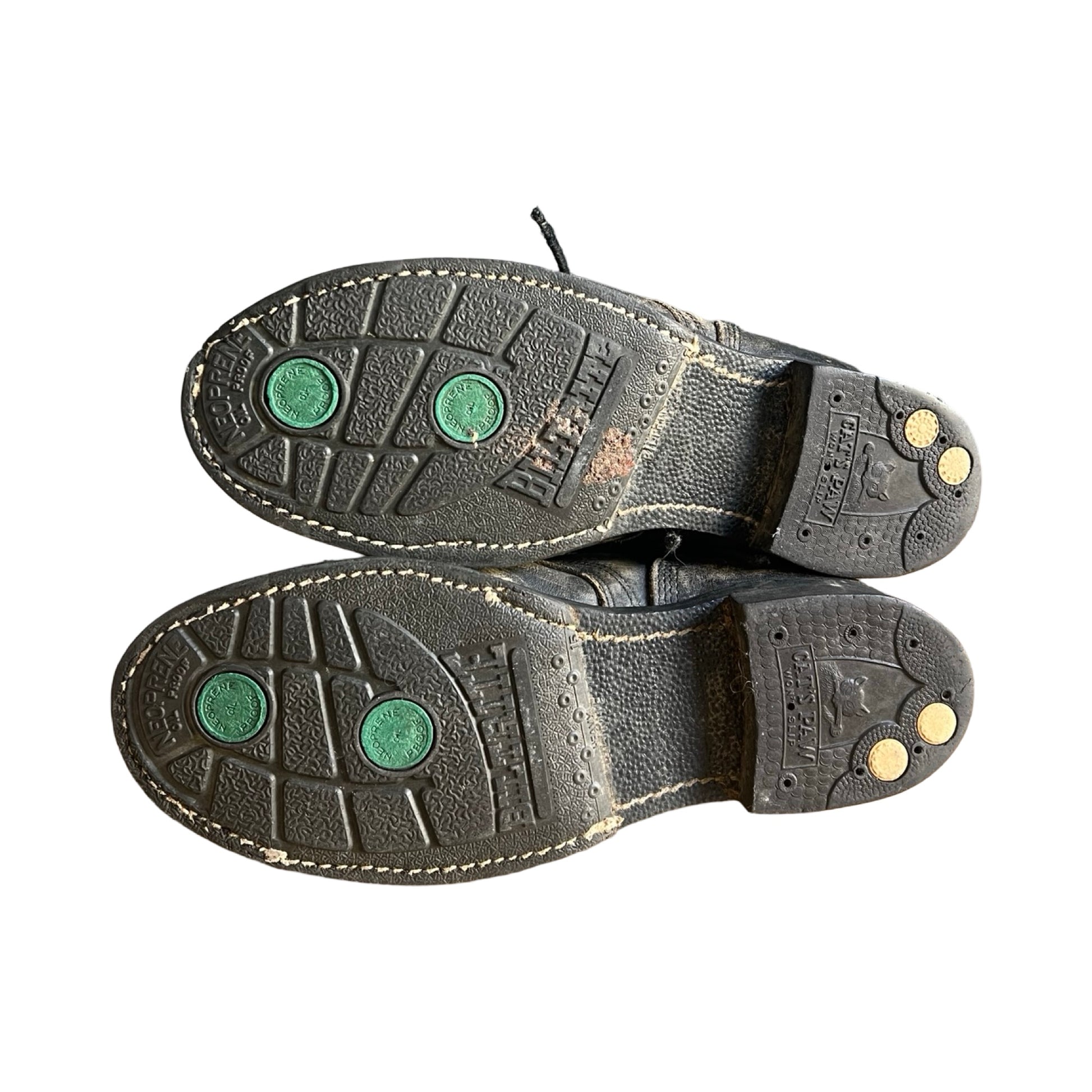 Amazing pair of vintage 80’s women’s Ansi steel toe combat boots beat to hell and worn to perfection. Scratches, scuffs, fading, discoloration throughout. Loose insole on left foot. Biltrite sole, Cats Paw heel, tons of life left in these! Name printed inside reads Ann Marie (can’t make out last name) with initials AMC. Fits women’s 8.5/9. Measures 11.25” tip to toe to back of heel. A really cool pair of boots!!