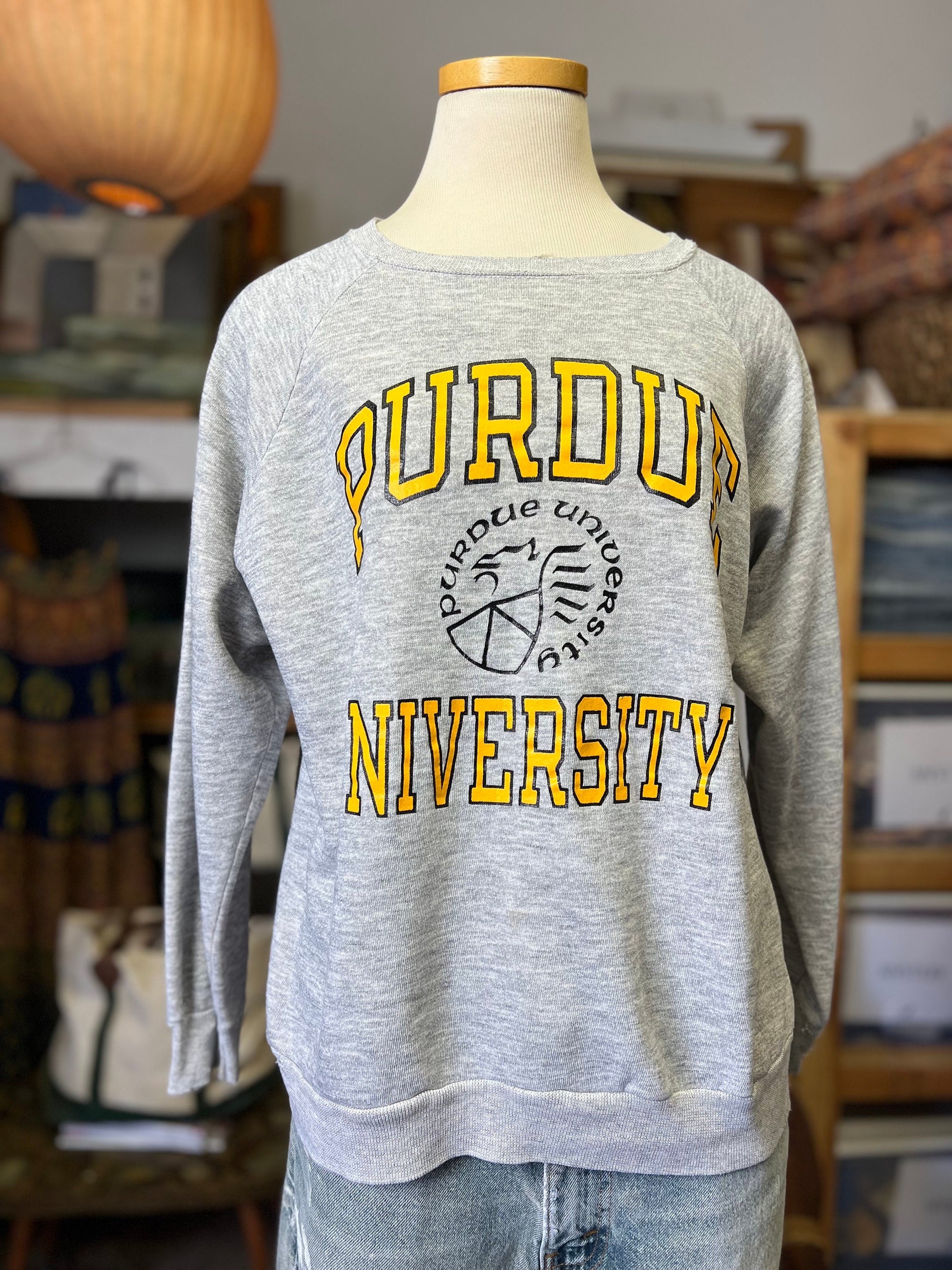 Vintage 80’s Purdue University paper thin super soft Champion reverse weave sweatshirt. Well worn with bright graphics. Tag size XL measures 22” pit to pit and 21” top to bottom.