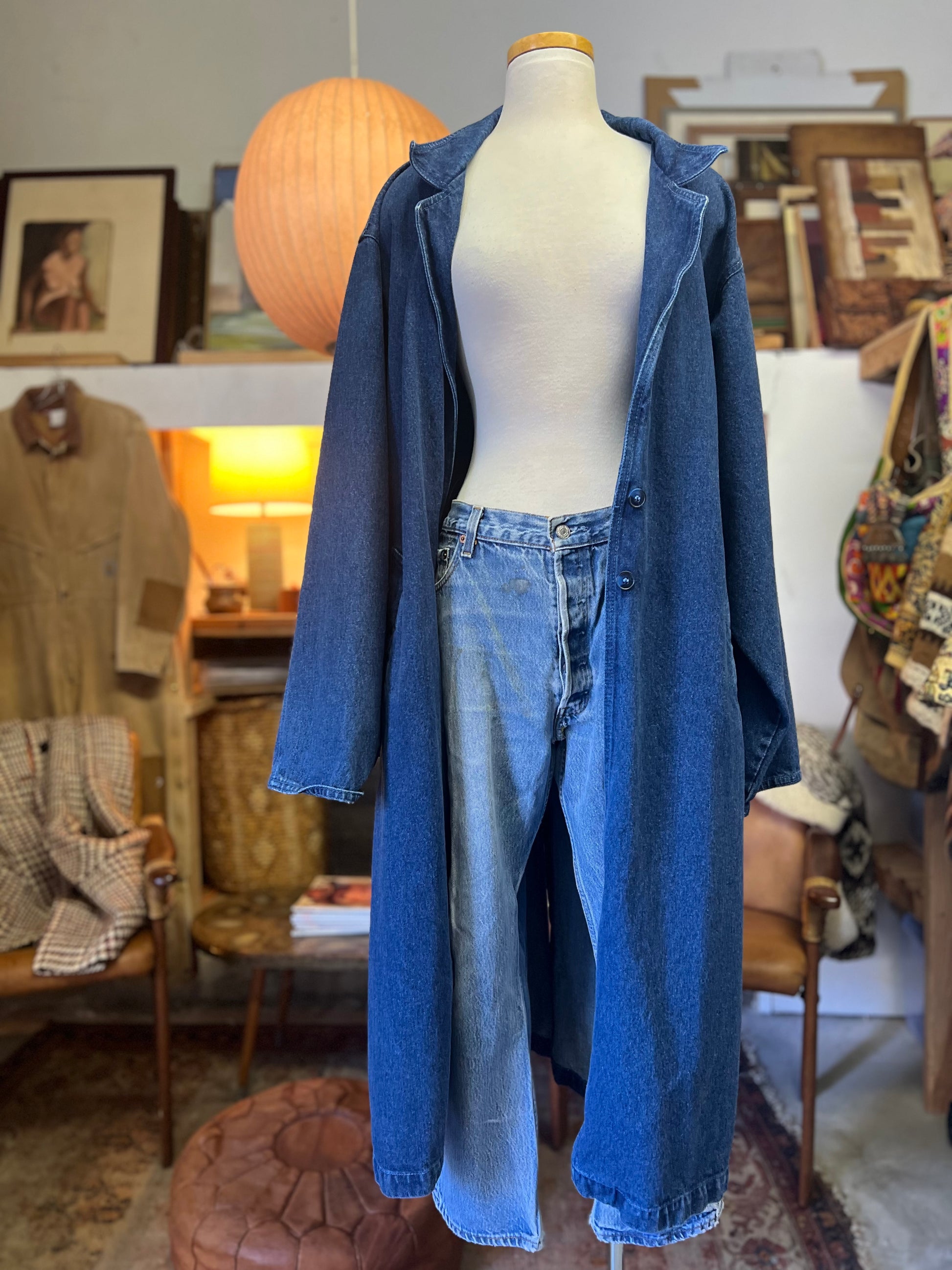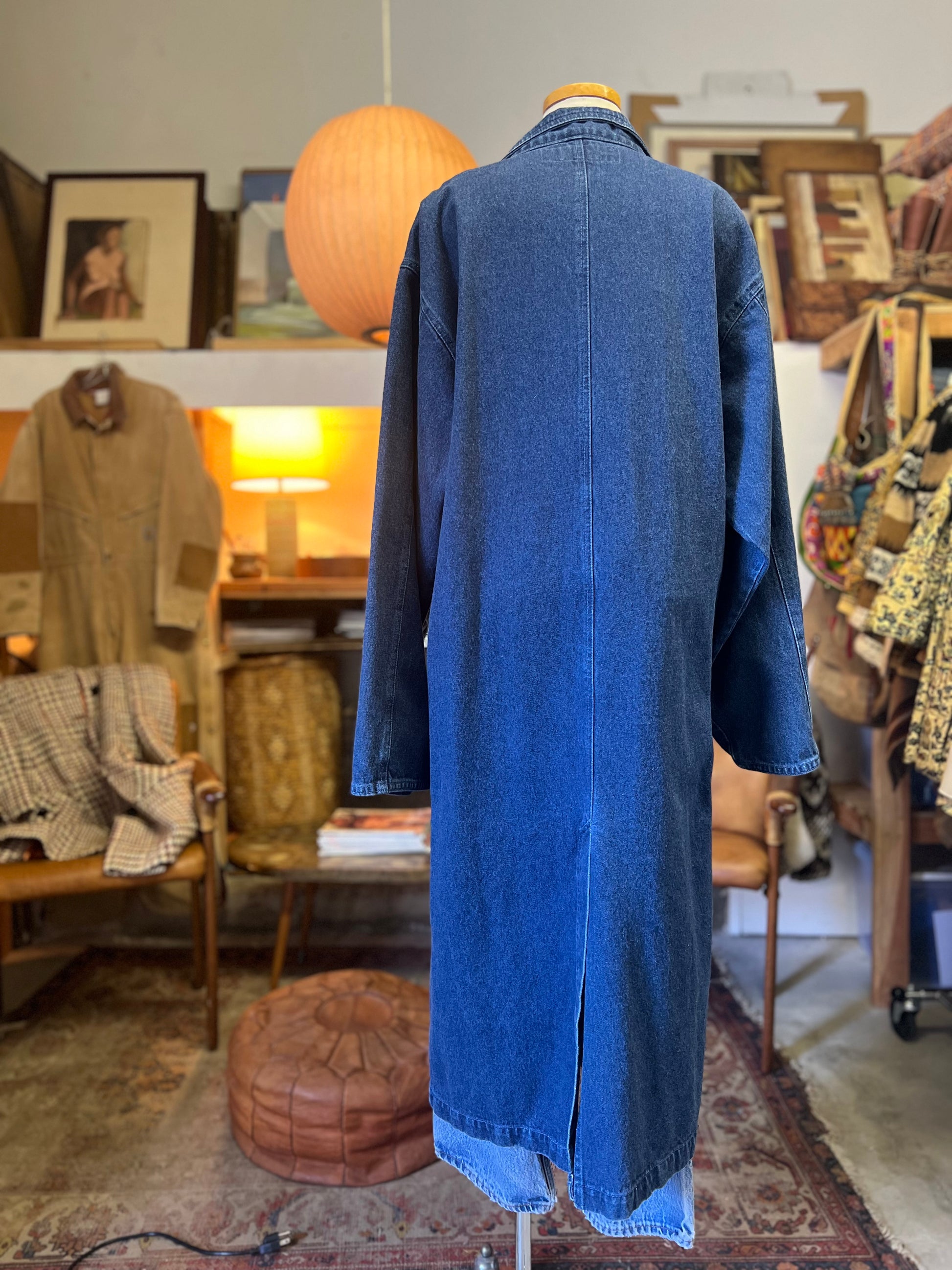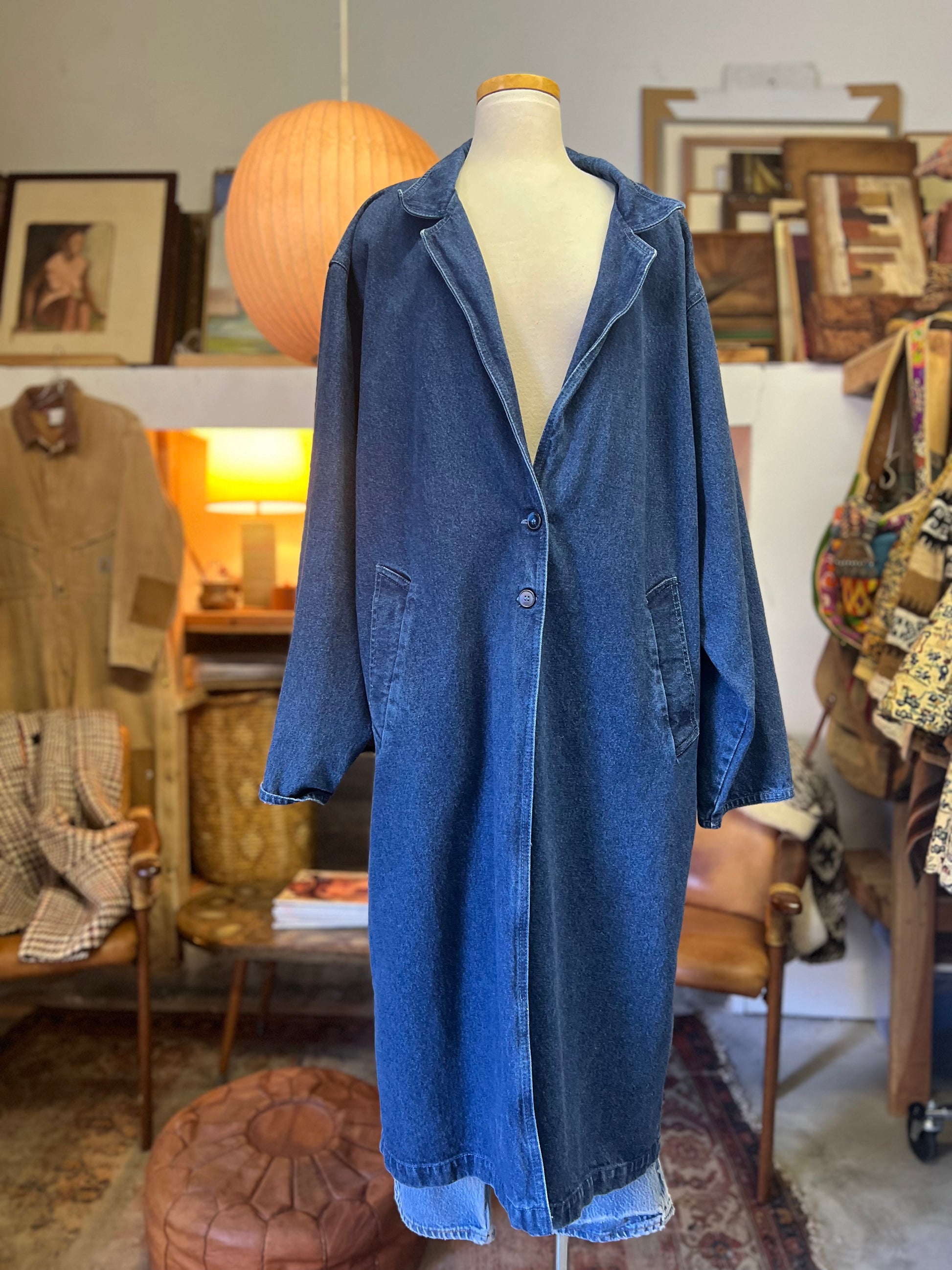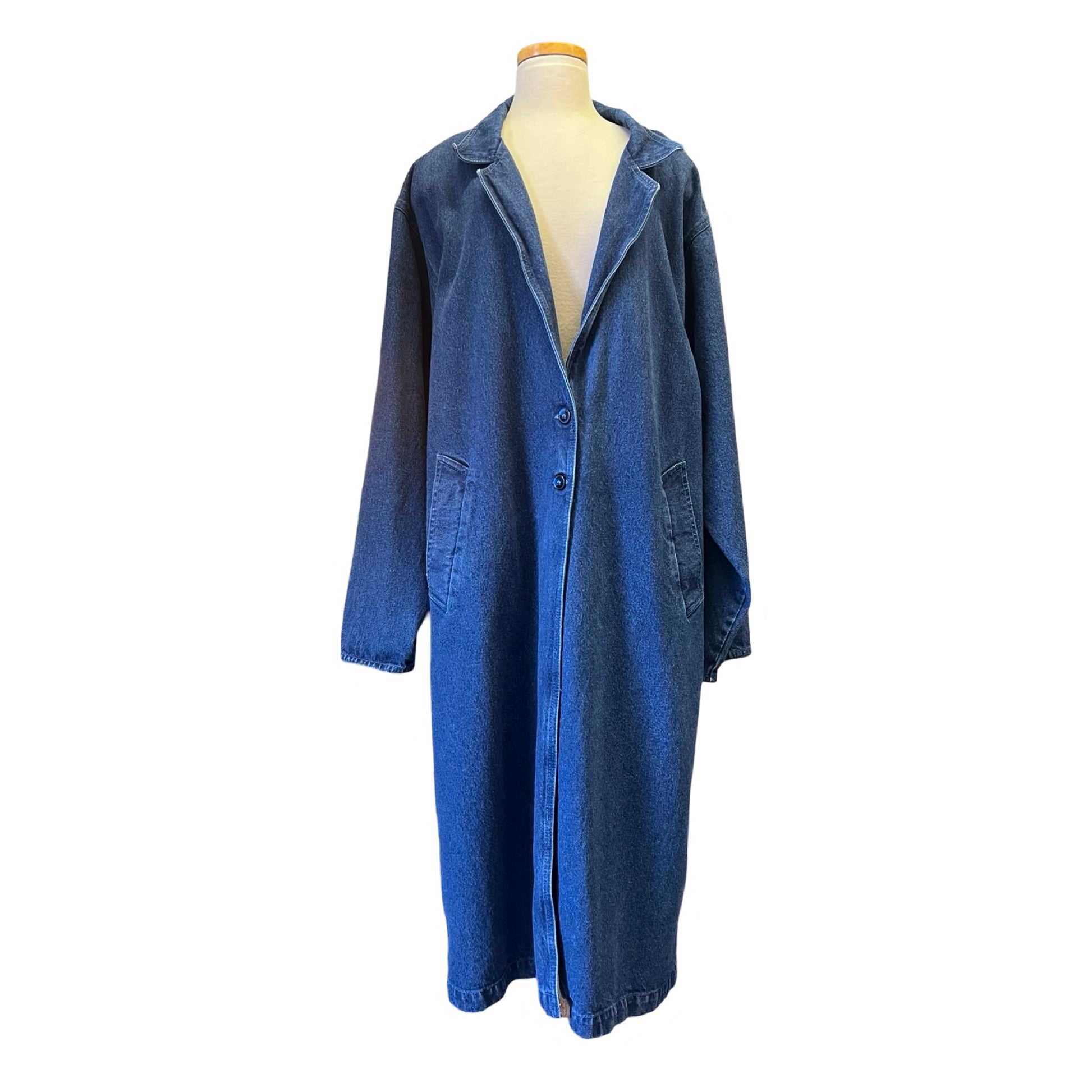 Vintage 80’s denim maxi trench coat/duster by Illusions. Great oversized fit, lapel collar, two front button closure, two big hip pockets. This denim duster is amazing!! Size large and definitely meant to be an oversized fit.