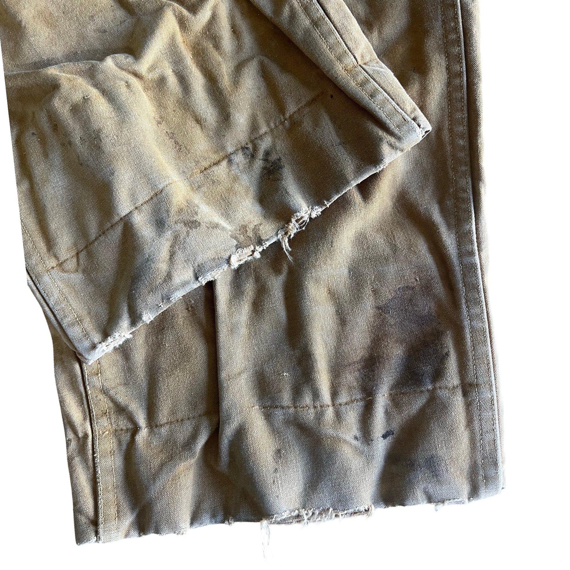 Vintage 80’s heavily distressed double knee thick canvas hunting pants by Red Head Brand. Allover stains and spots with frayed hems. Pants have been laundered and come out of the dryer wrinkled due to heavy canvas. Measures 38” waist with a 25” inseam and 25” across the hips (wide hips on these). *pinned on mannequin
