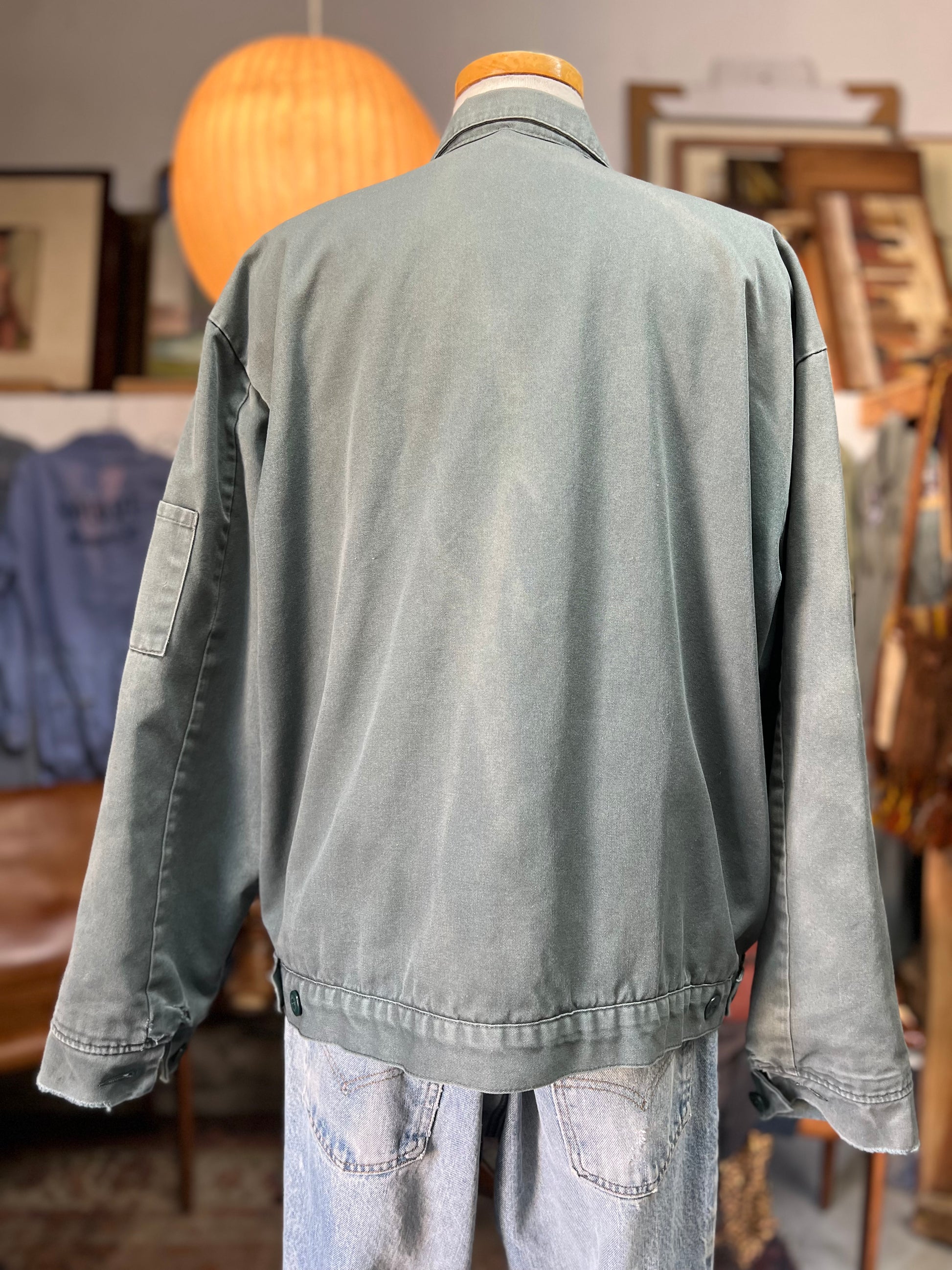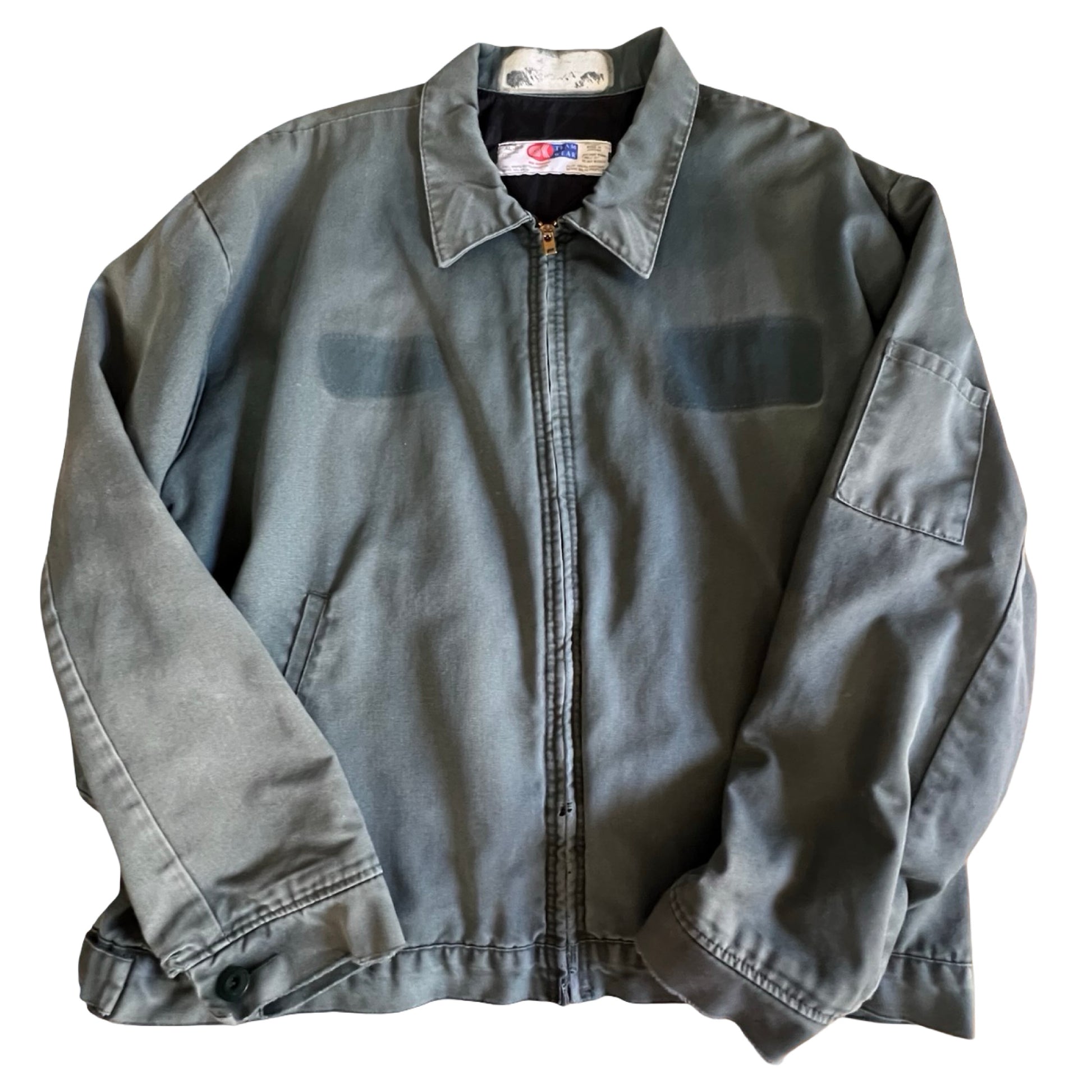 This fade and wear on this one is incredible! Vintage distressed G & K TeamWear workwear jacket has allover distressing, spots, marks, frayed collar and cuffs. Quilted lining and super soft. Tag size XL measures 27” pit to pit and 26” top to bottom.