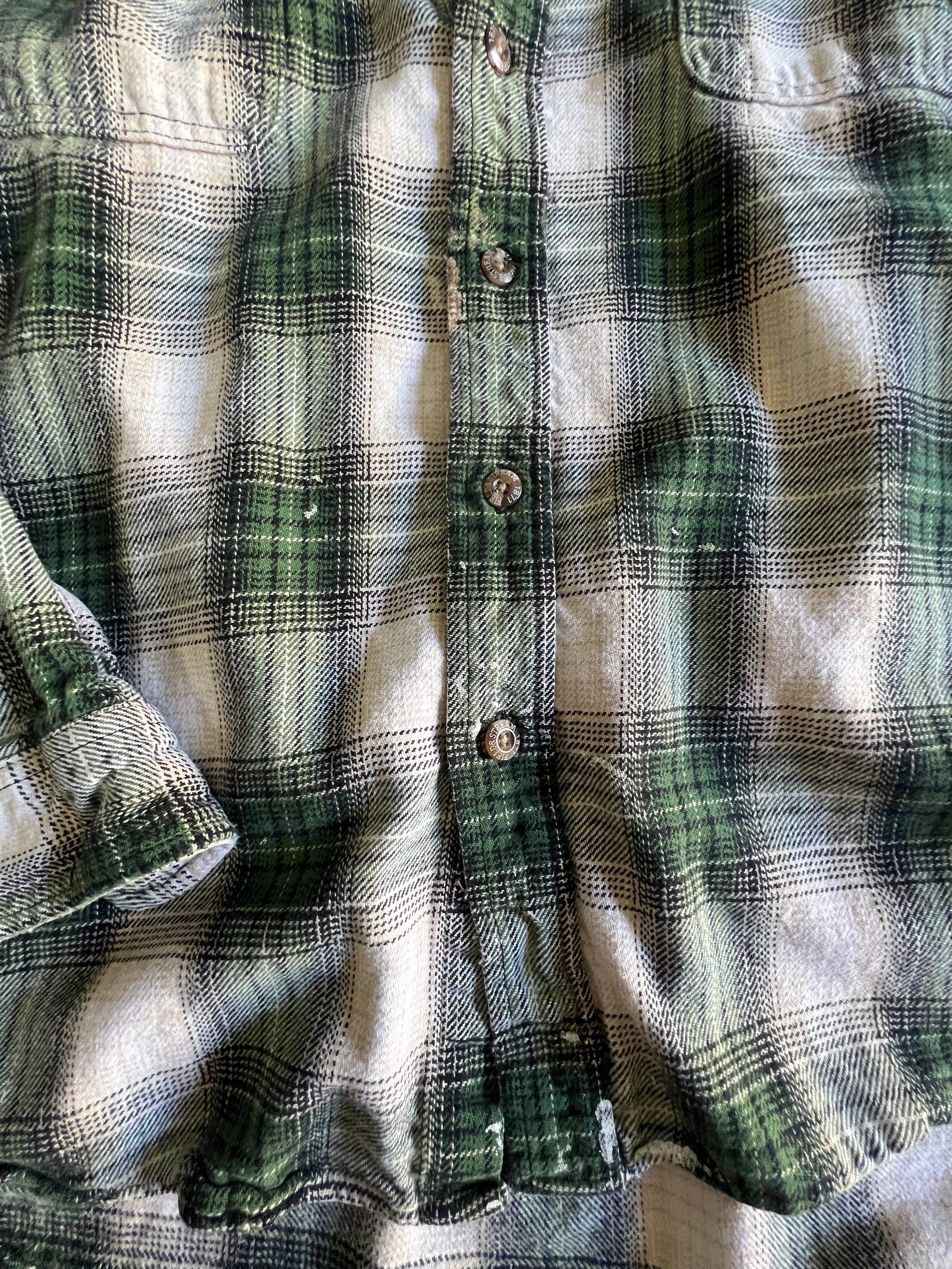 Vintage soft and thick Field & Stream flannel with distressing amd paint spots throughout. No size tag, measures 25” pit to pit and 29” top to bottom.