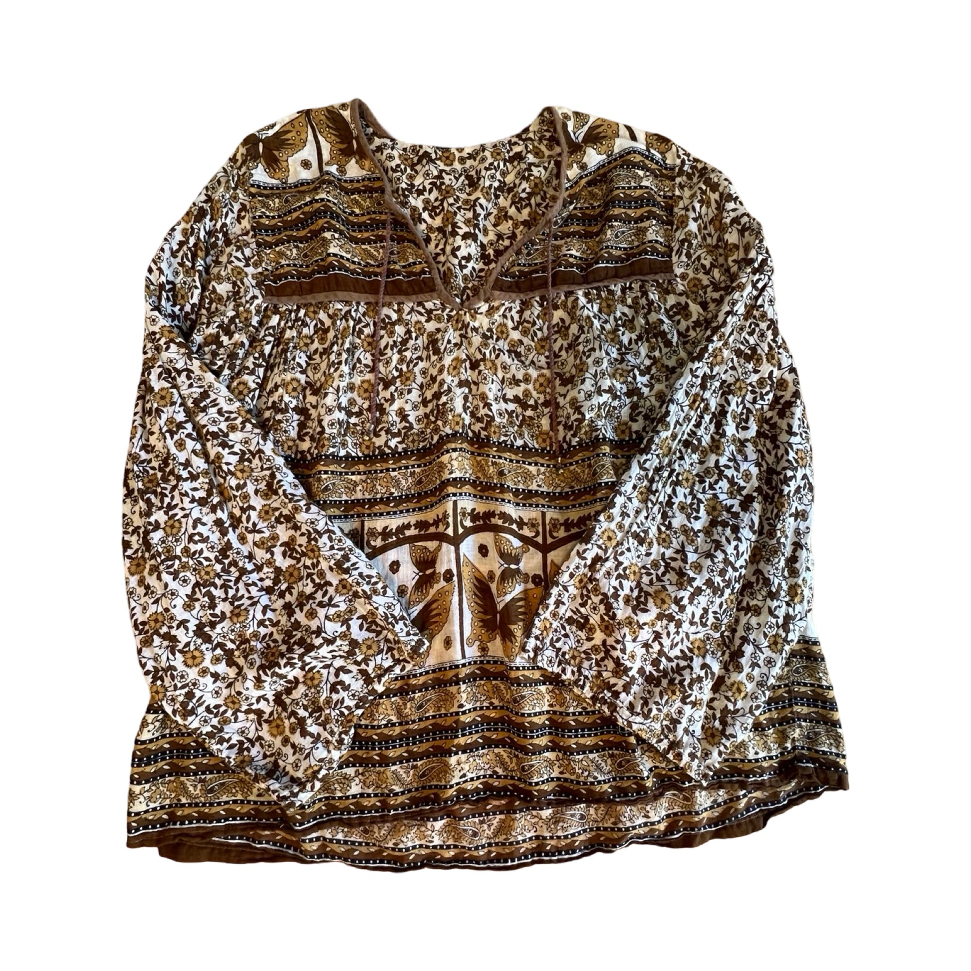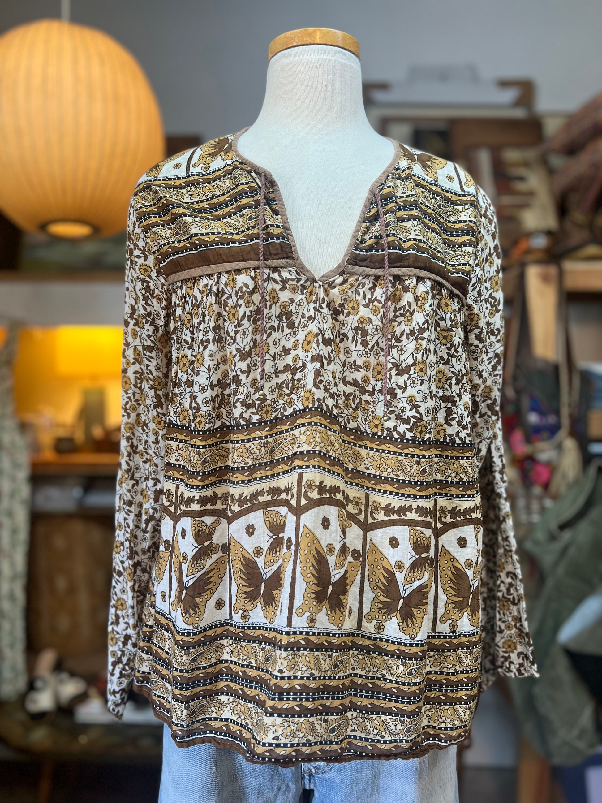 Vintage 80’s sheer cotton gauze India block print blouse in a rare brown colorway. Features a butterfly and floral print and is super soft and a little sheer. Measures 19.5” pit to pit and 26” top to bottom. Small tear under arm in one side, not noticeable when wearing.