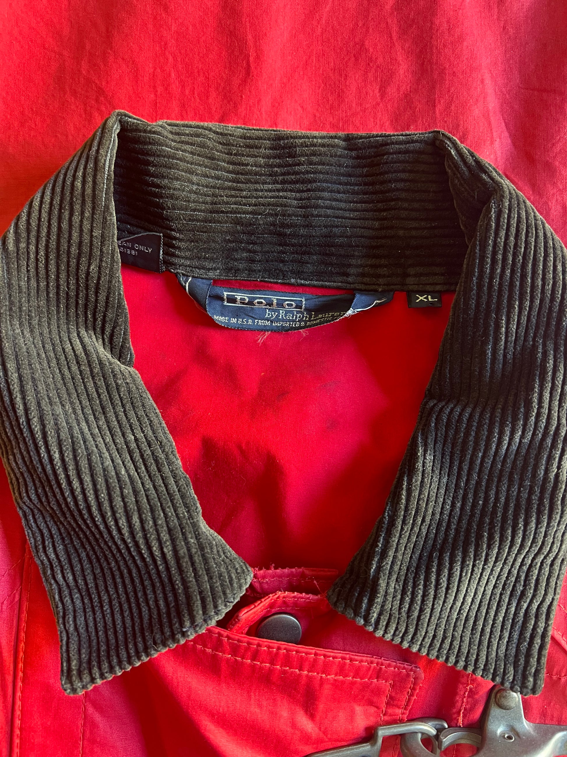 Rare vintage 80’s Polo Ralph Lauren fireman jacket with patch pockets and corduroy trim collar and cuffs. Features snaps and metal lobster clasp closures. Some discoloration on back (barely noticeable when worn, see photos). Nice and roomy size XL, this jacket is amazing!! East coast fisherman core vibes. Measures 24” pit to pit and 31” top to bottom.