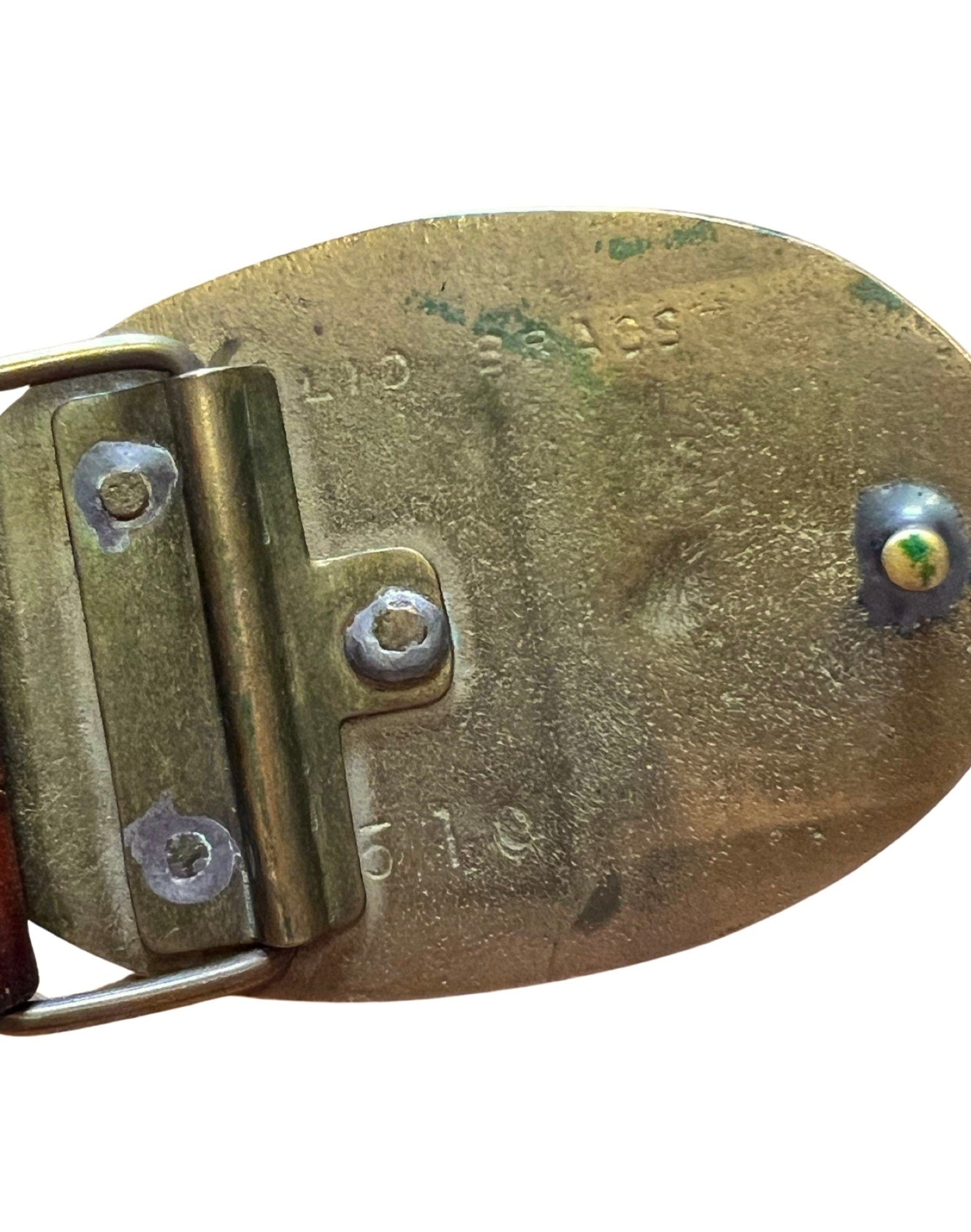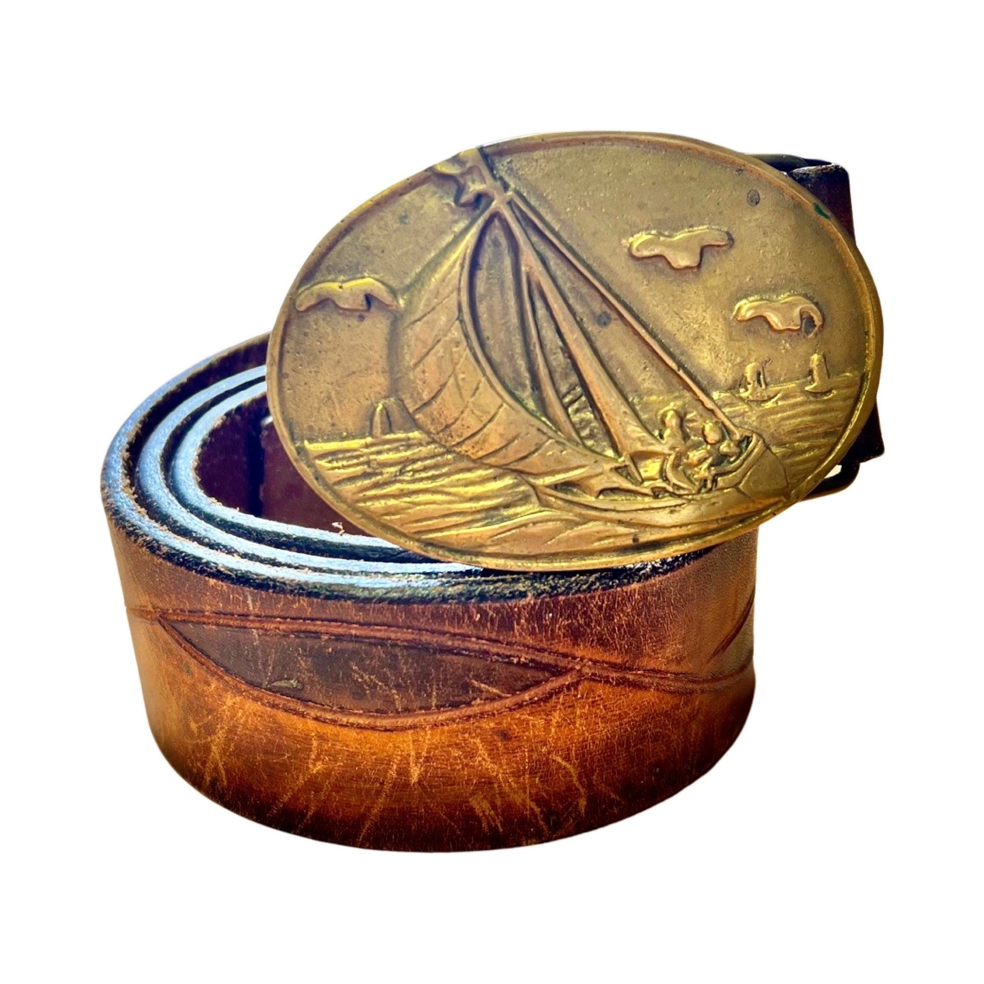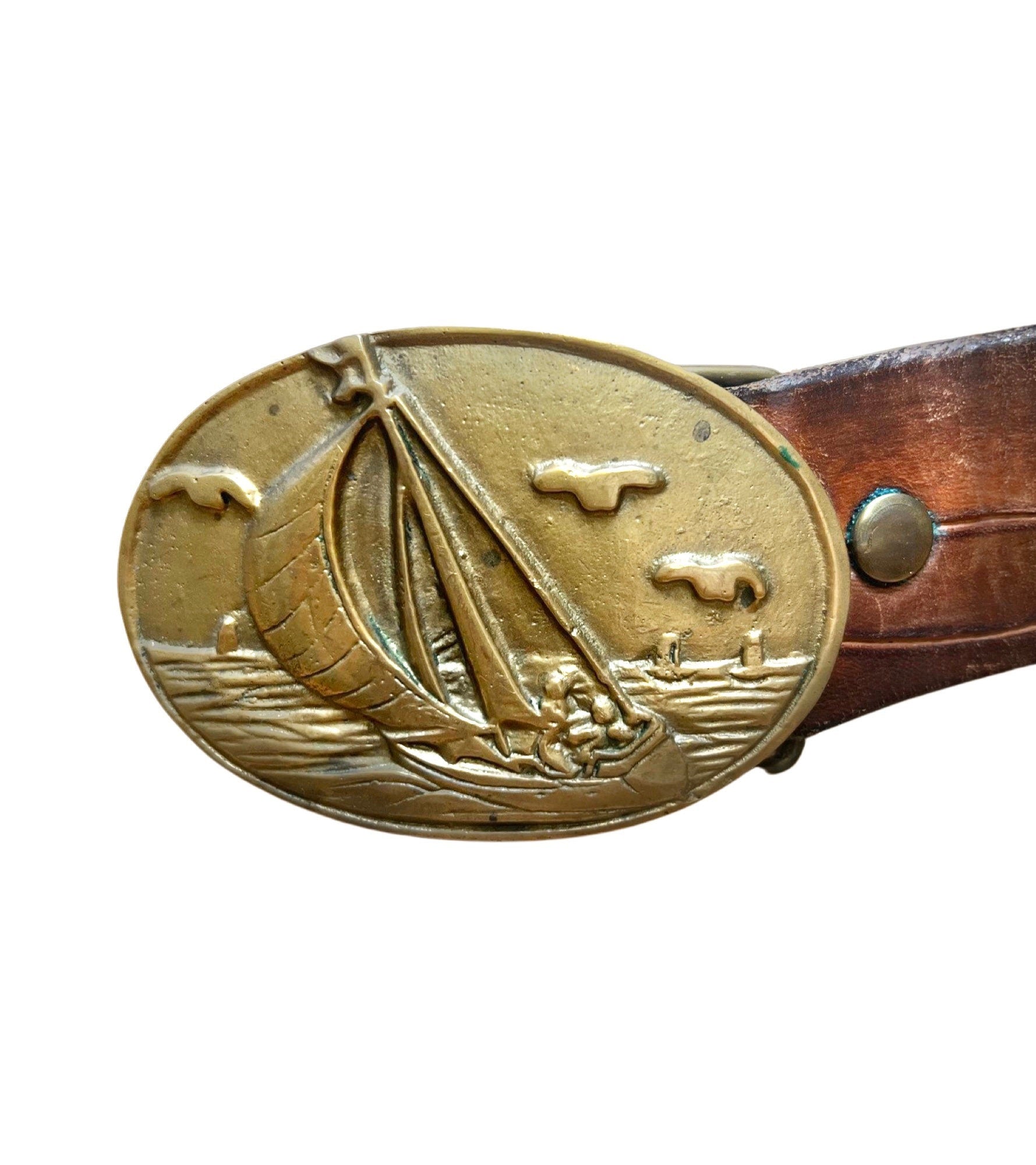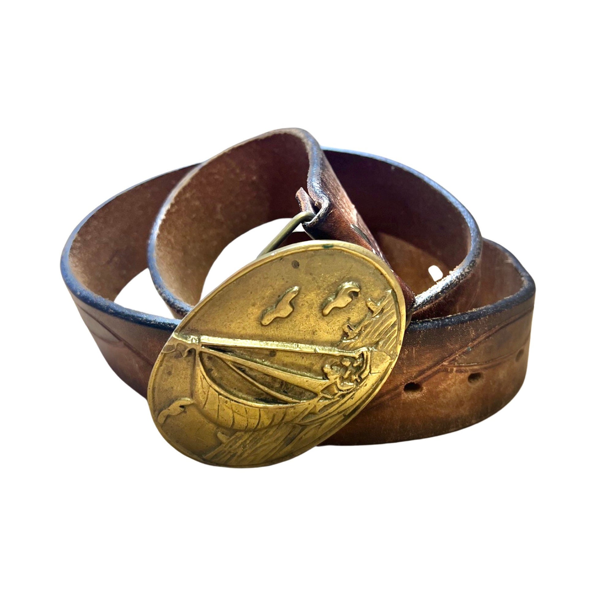 Vintage 80’s Sailing Sailboat Nautical Solid Brass Belt Buckle with Vintage Hand Tooled Leather Belt