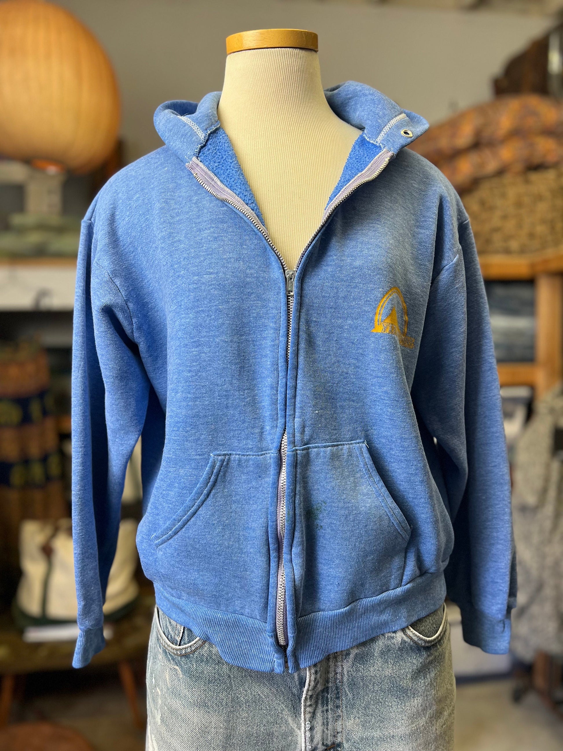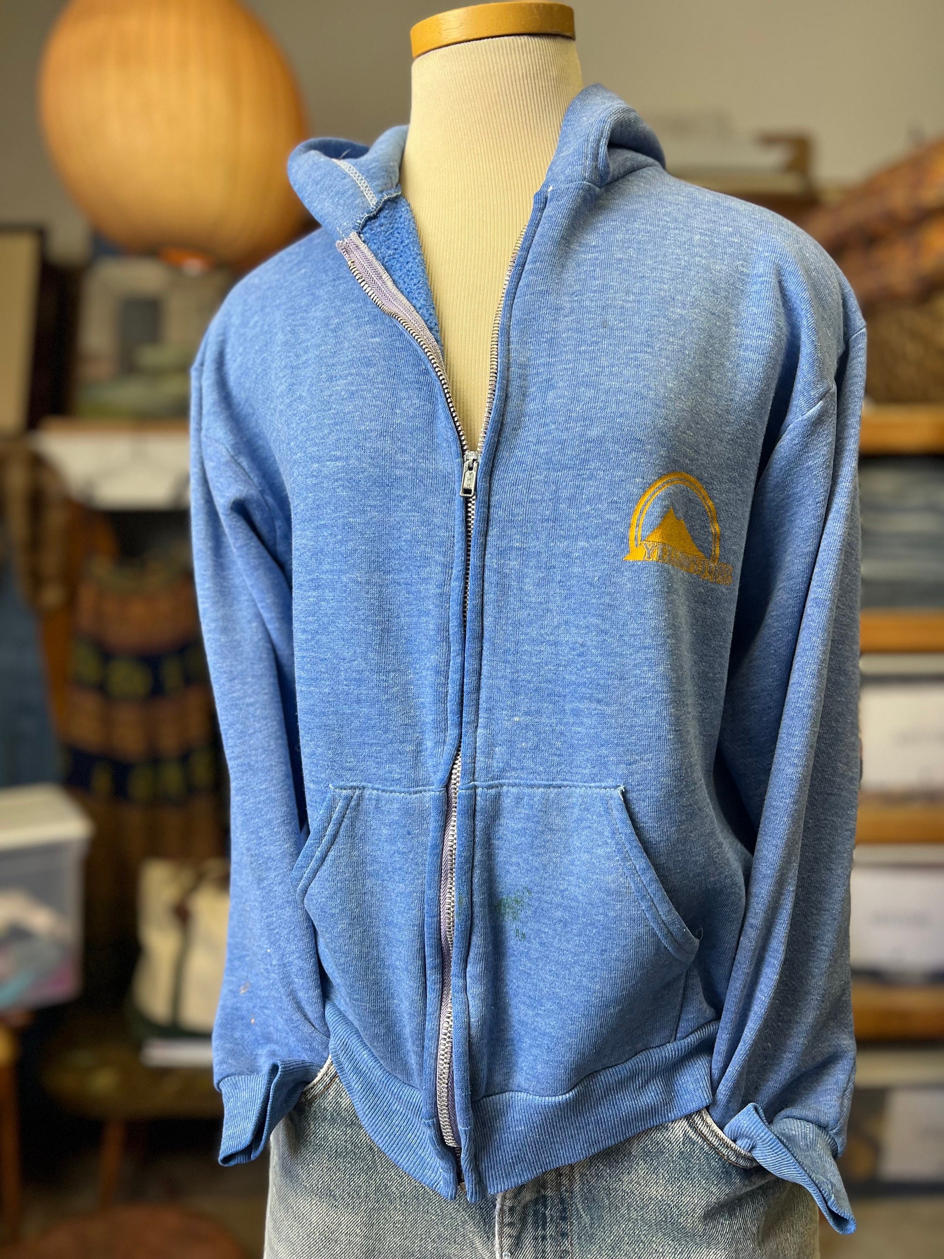 Vintage 80’s Yellowstone zip front hoodie. Well worn, soft and faded with small paint spots throughout. Sportwear tag L measures 22” pit to pit and 20” top to bottom. Please check measurements because this looks much smaller than a large (on tag).