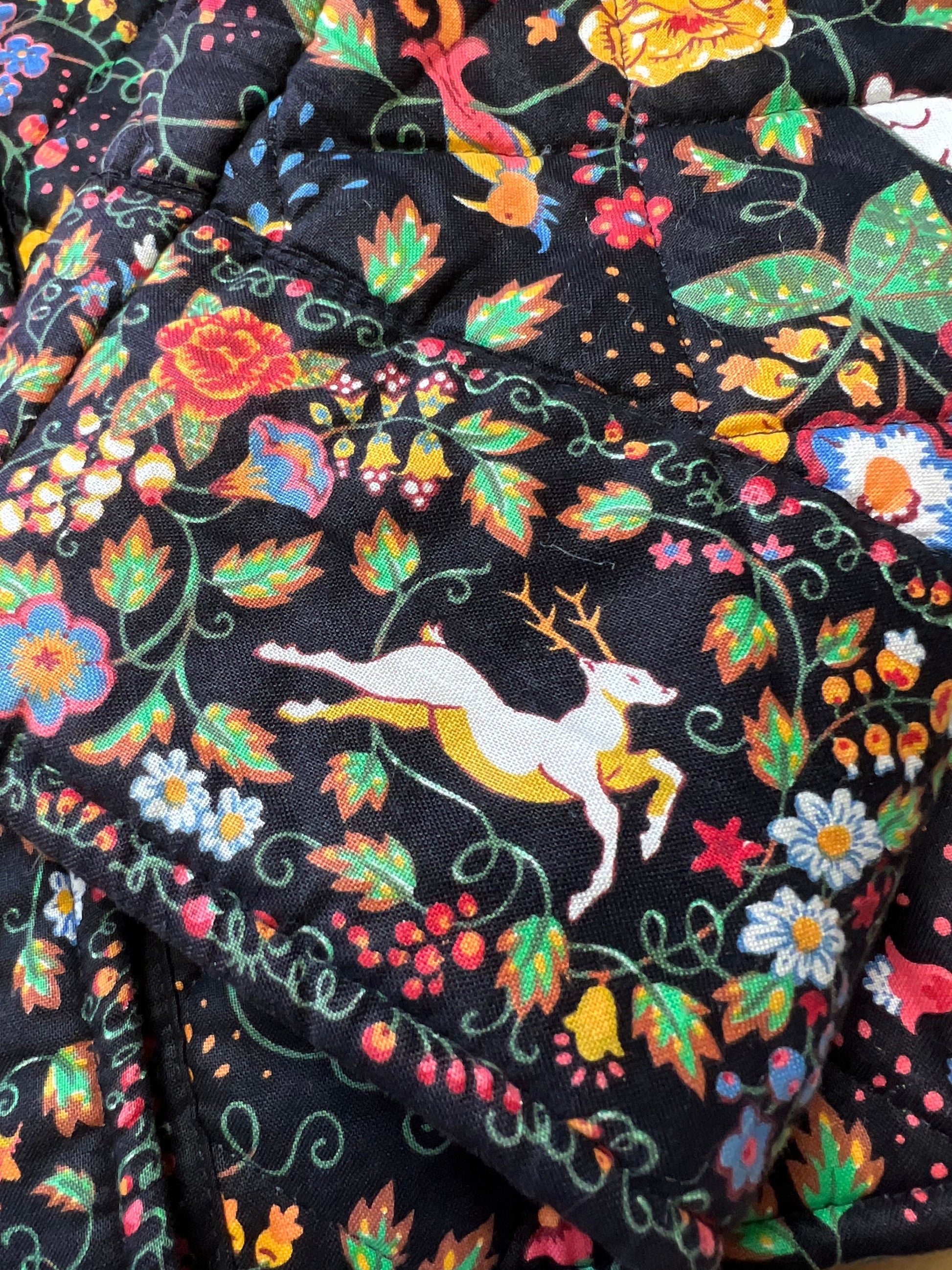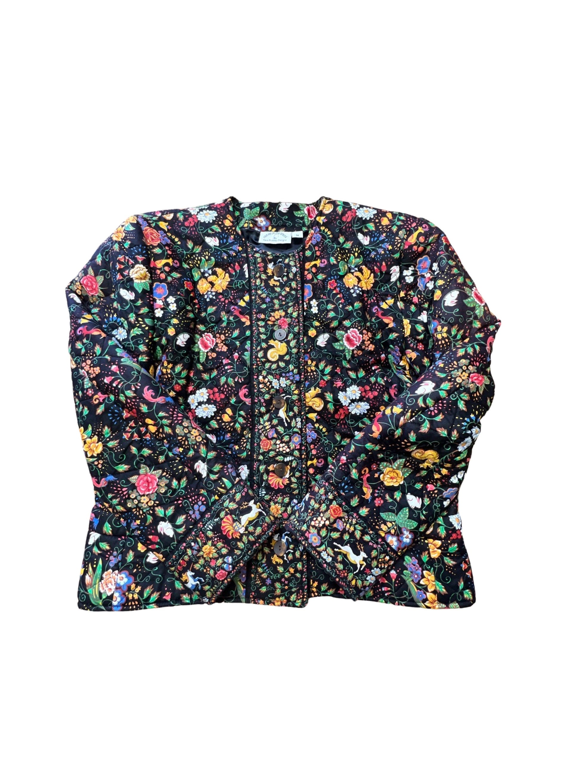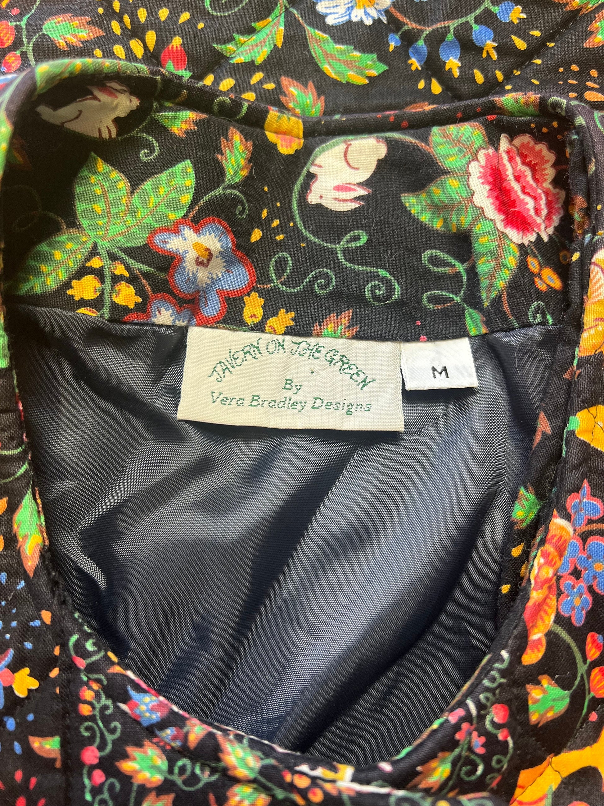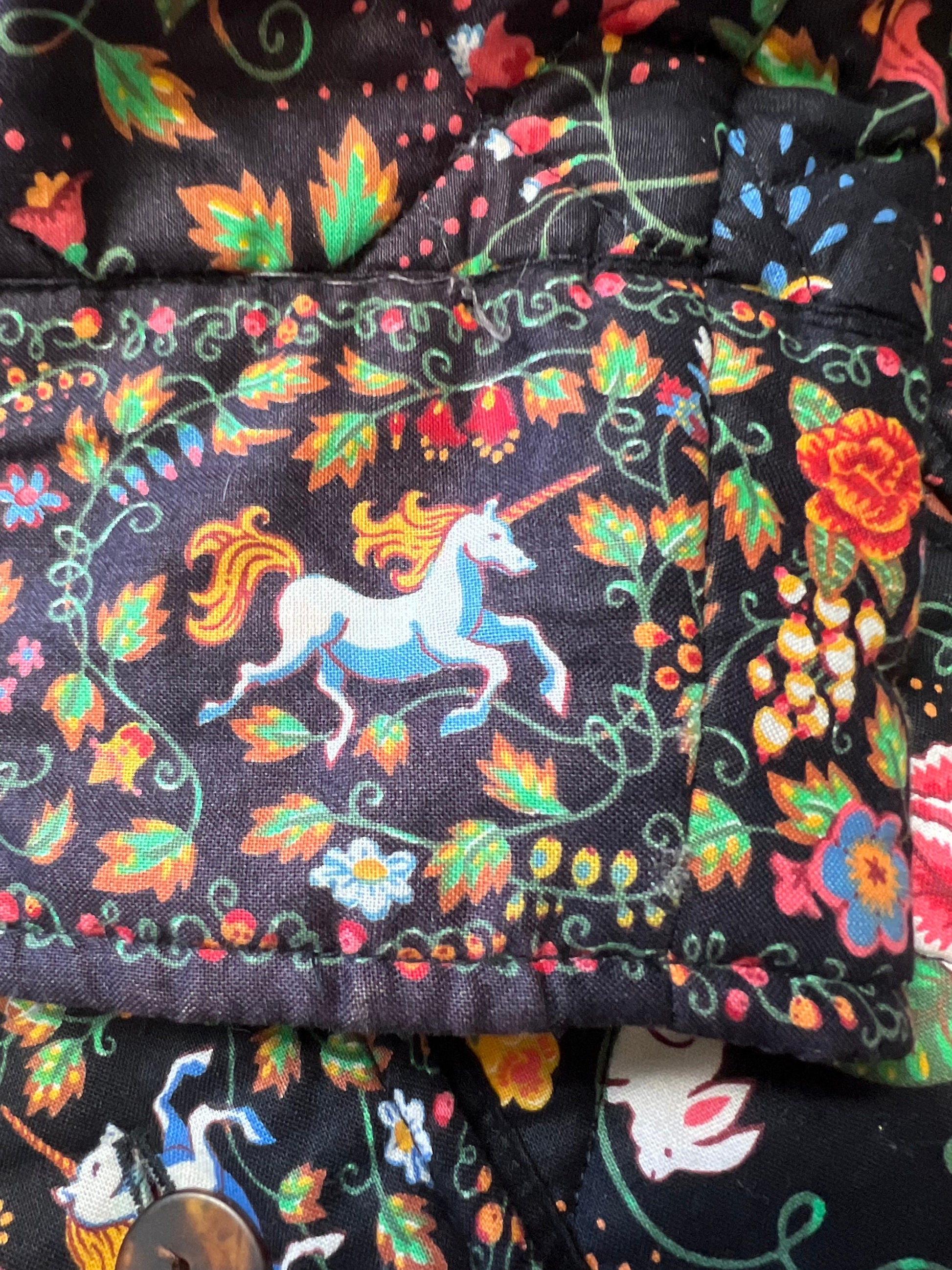 This vintage Tavern On The Green by Vera Bradley jacket is incredible!! Looks like it’s never been worn and features the most magical print ever!! Unicorns, deer, bunny rabbits, squirrels, and flowers…straight out of Narnia! Front patch pockets and button front. Tag size M, measures 21” across the chest, 18”shoulder to shoulder, and 22” top to bottom.