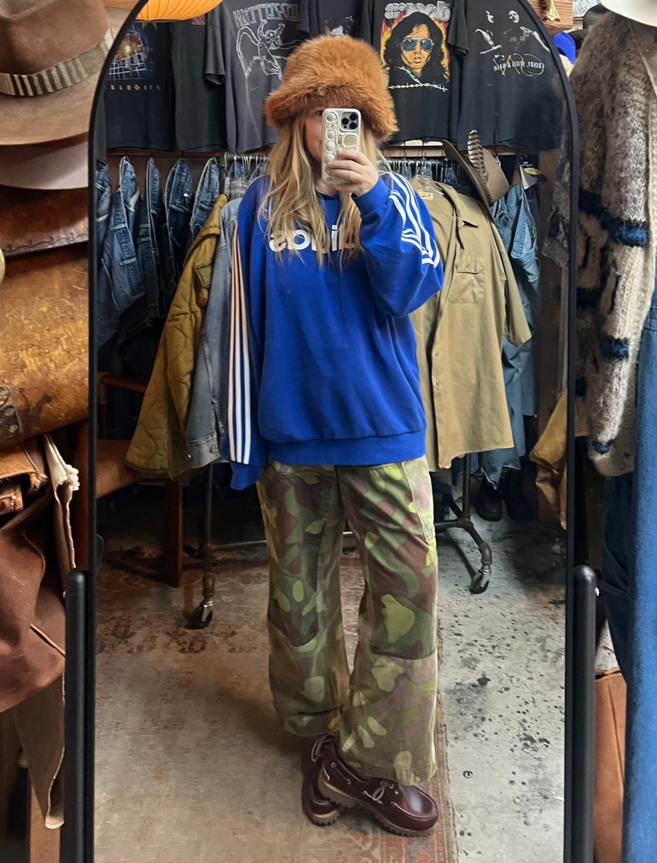 A Motley Vintage wardrobe staple, the oversized Addias sweatshirt. Vintage 90’s three stripe oversized crewneck, tag size 2XL, measures 29” pit to pit and 29” top to bottom. It’s a go-with-everything neutral as far as I’m concerned ;)