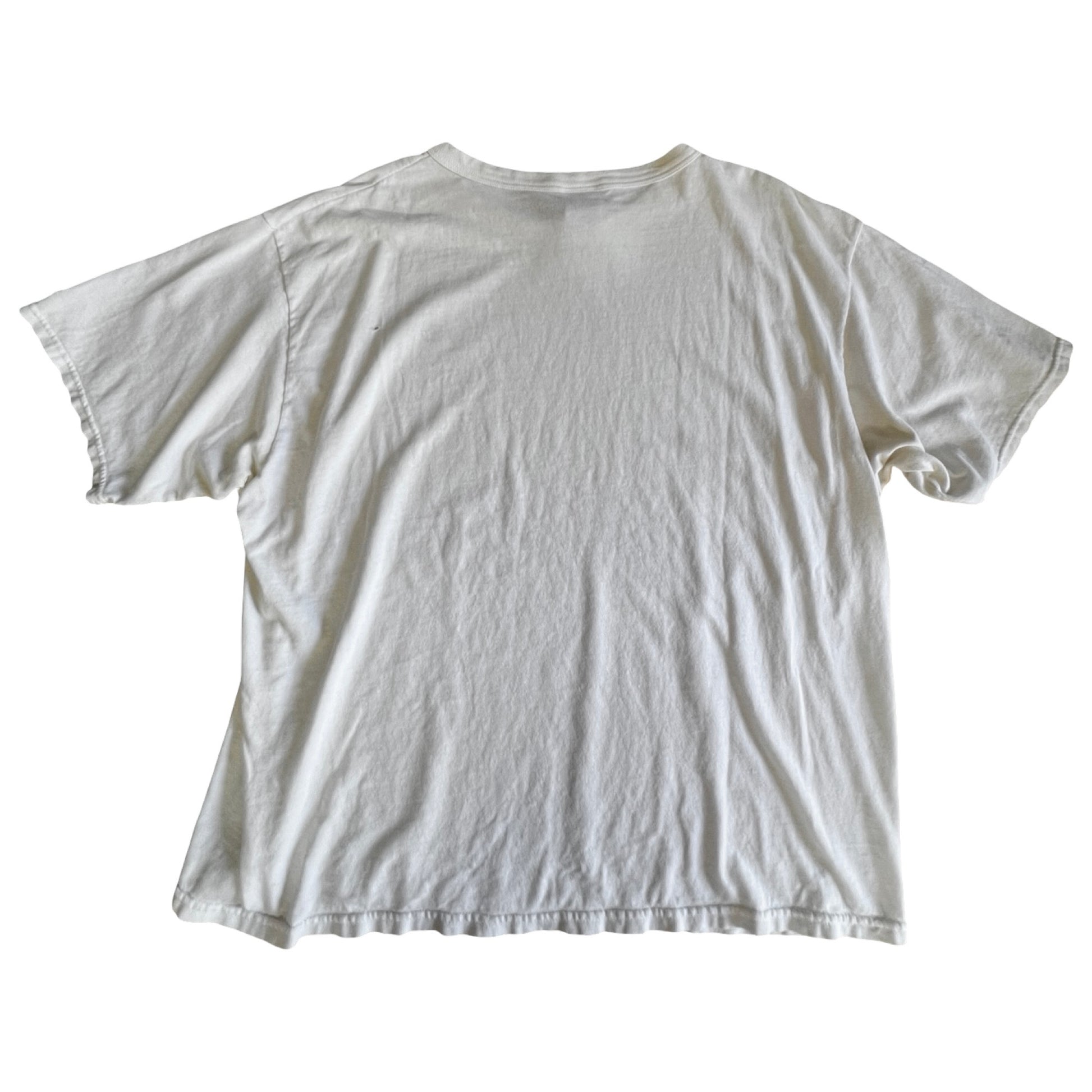 Such a great basic oversized tee, this 90’s Champion logo tee is soft and worn with distressing throughout. Slight yellowing under the arms, a couple small holes and fraying around thre collar. Tag size 2XL measures 26” pit to pit and 27” top to bottom. Boxy fit.
