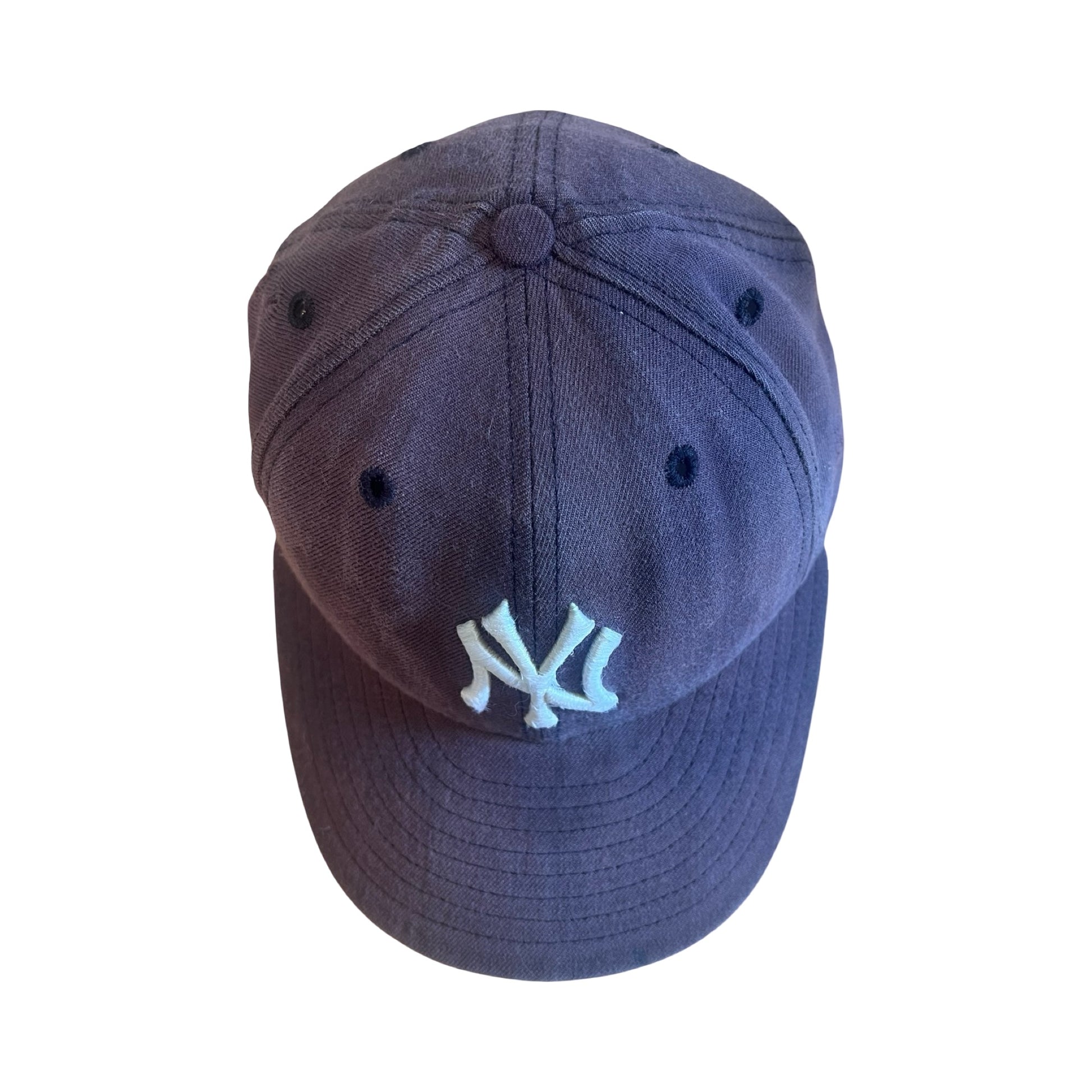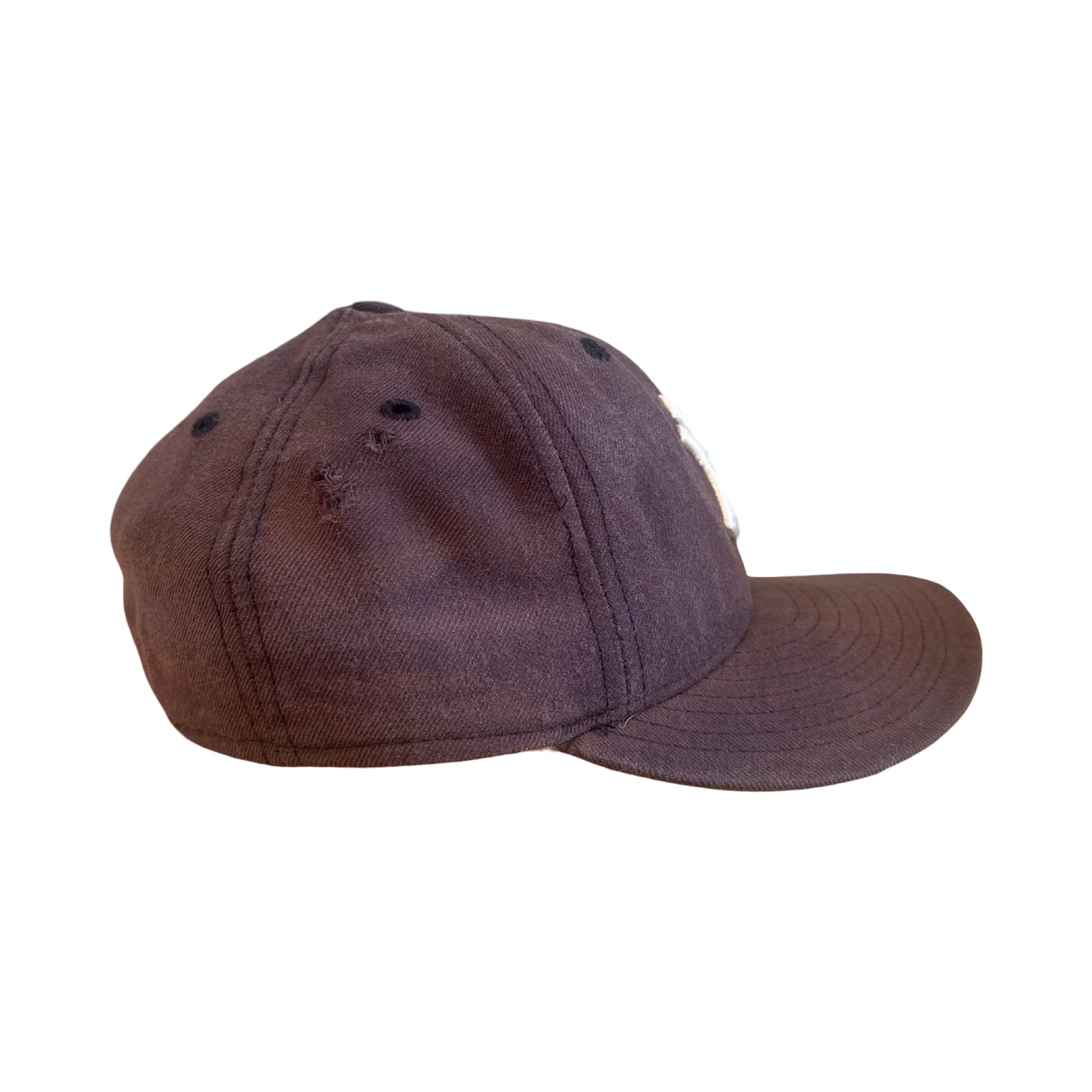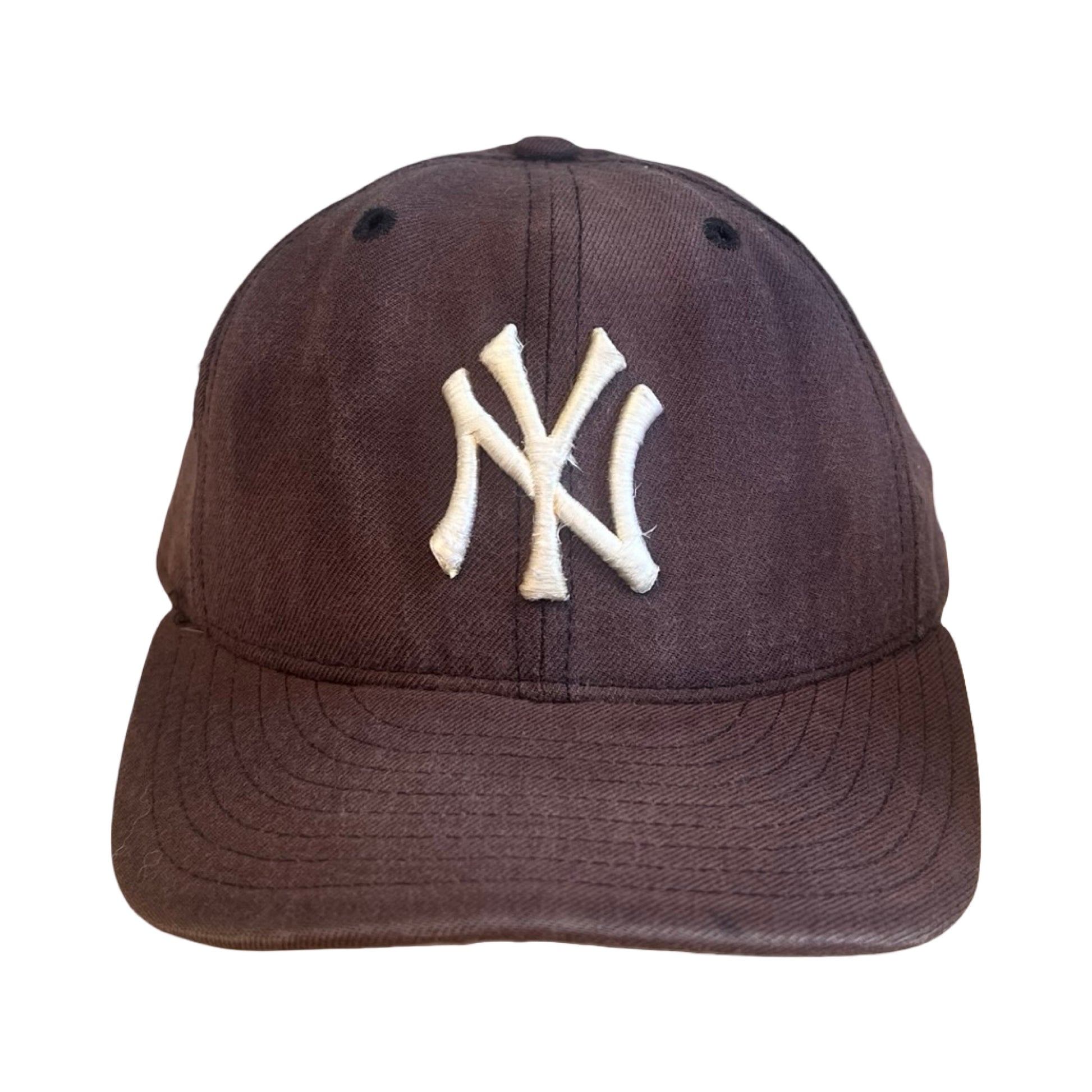 One of the best vintage Yankees hats I’ve ever had! The fade on this vintage 90’s wool hat is beautiful…sun faded to an almost purpley-blue from navy. Some distressing throughout, a couple small holes on the right side and some fraying to the embroidery. This one is fitted, size 7 1/4 (if it fit me, I’d keep it!). 59Fifty, New Era, Diamond Collection.
