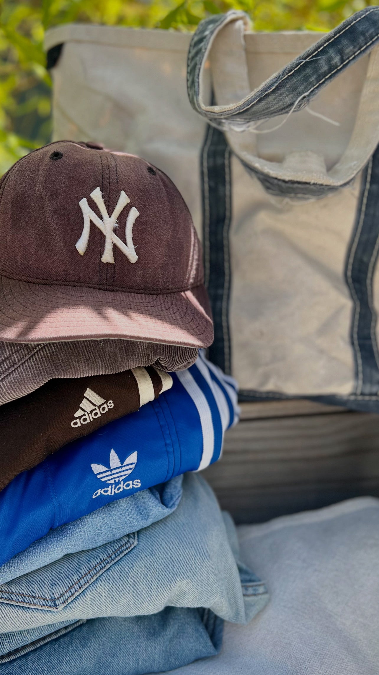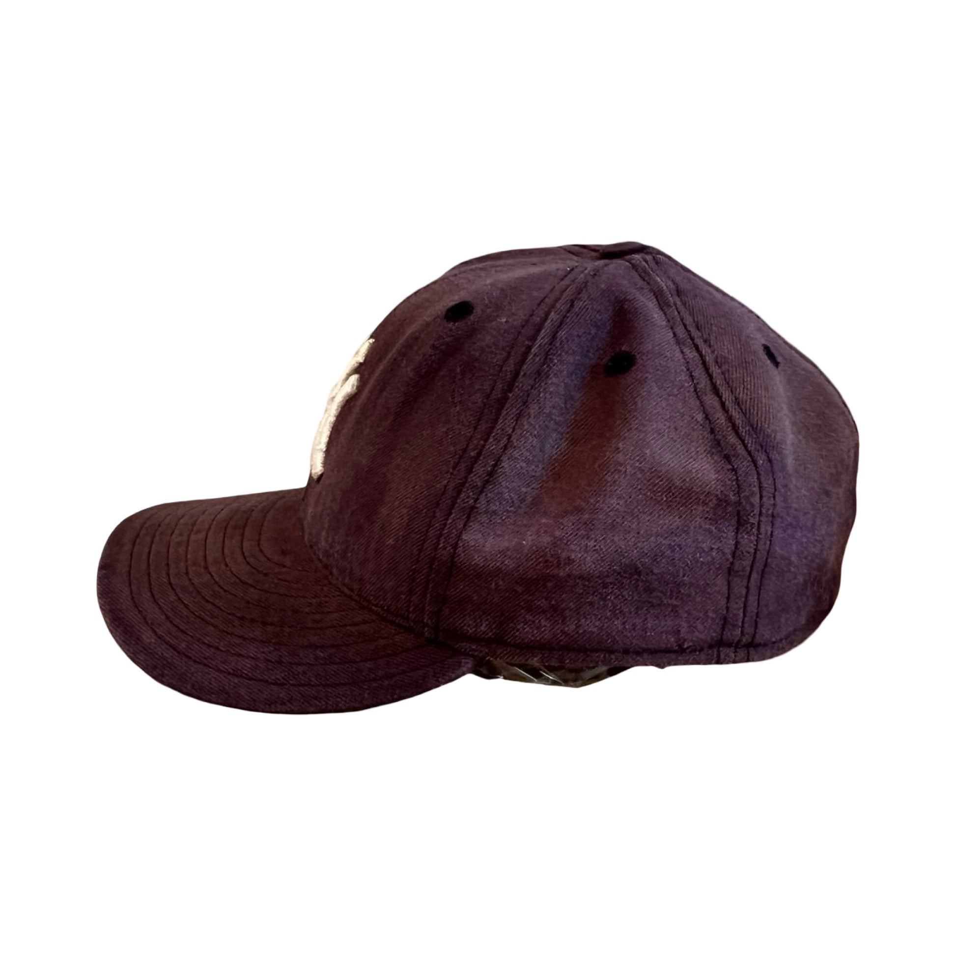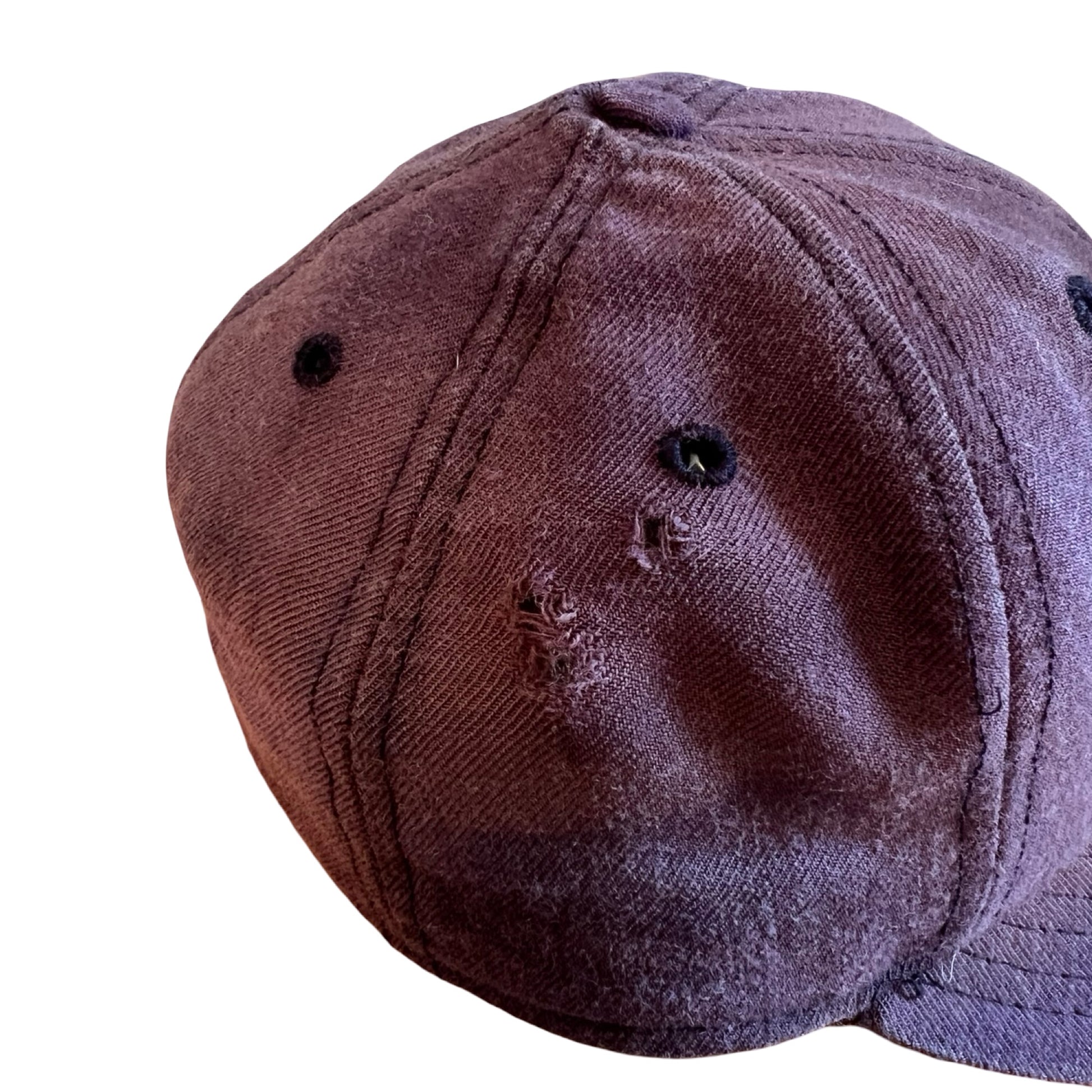 One of the best vintage Yankees hats I’ve ever had! The fade on this vintage 90’s wool hat is beautiful…sun faded to an almost purpley-blue from navy. Some distressing throughout, a couple small holes on the right side and some fraying to the embroidery. This one is fitted, size 7 1/4 (if it fit me, I’d keep it!). 59Fifty, New Era, Diamond Collection.