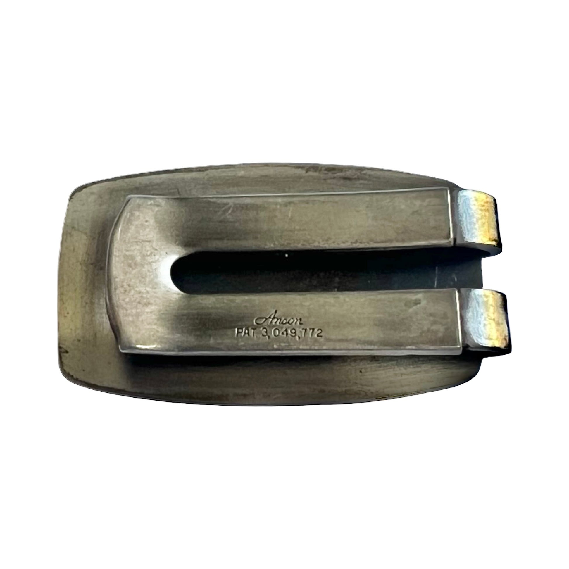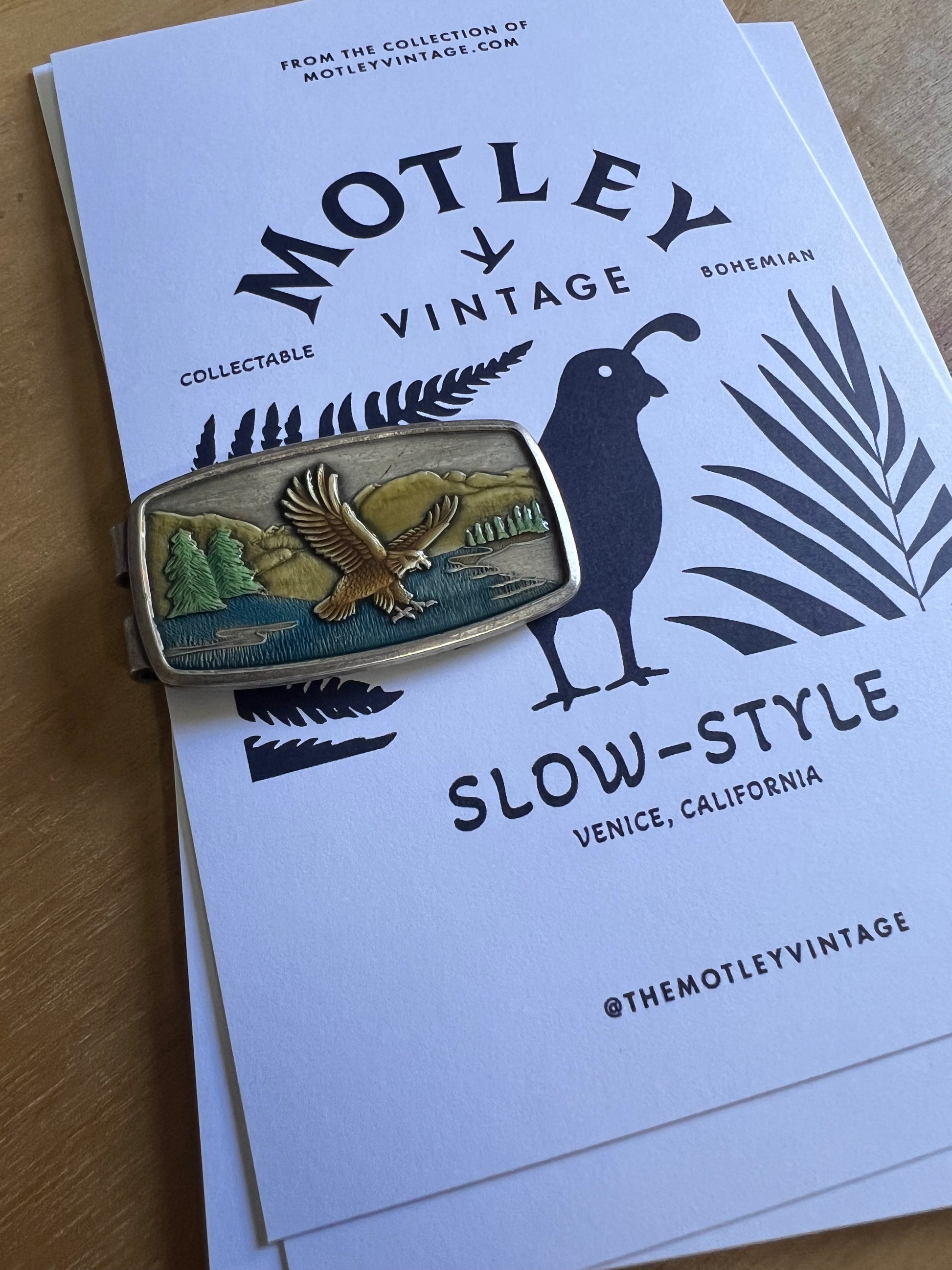 Vintage Anson silver tone money clip with eagle, trees and mountain scene. Measures 1” x 2”.