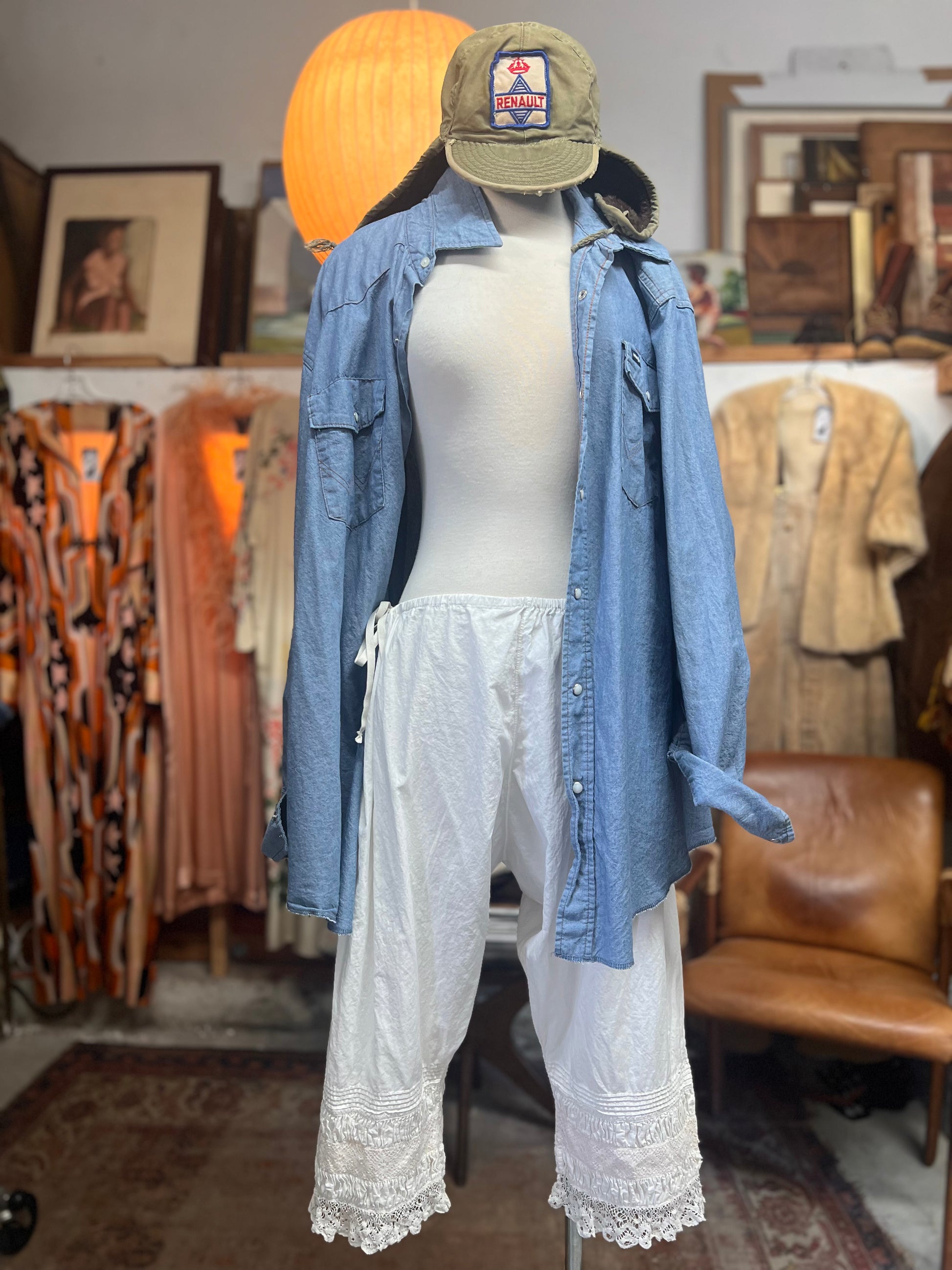 The sweetest sheer soft cotton antique bloomers :) A recently added piece of elastic to the waist makes these adjustable and what I would consider one size (elastic ribbon is unfinished and hangs low on the side to adjust fit). There are a couple repairs (along the seam and in the lace) and a couple small holes in the lace (not noticeable). Looks like they’ve been taken in in the back, so could be let back out. A beautiful pair of vintage bloomers to wear with everything!