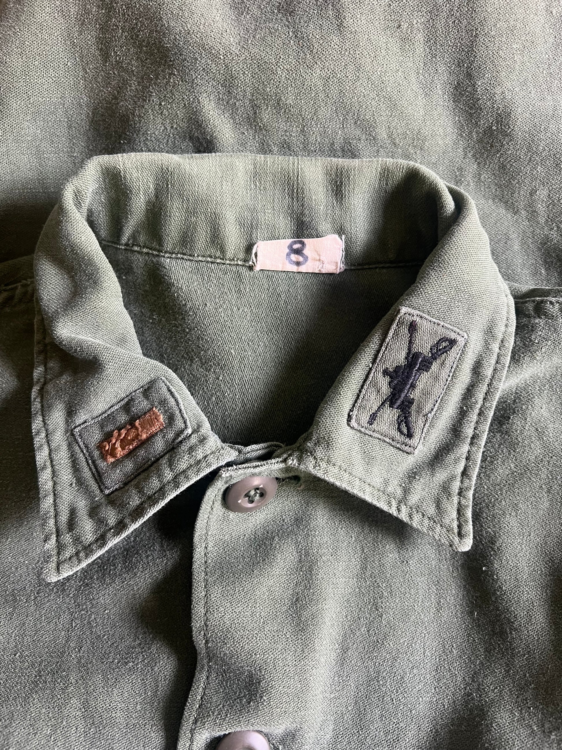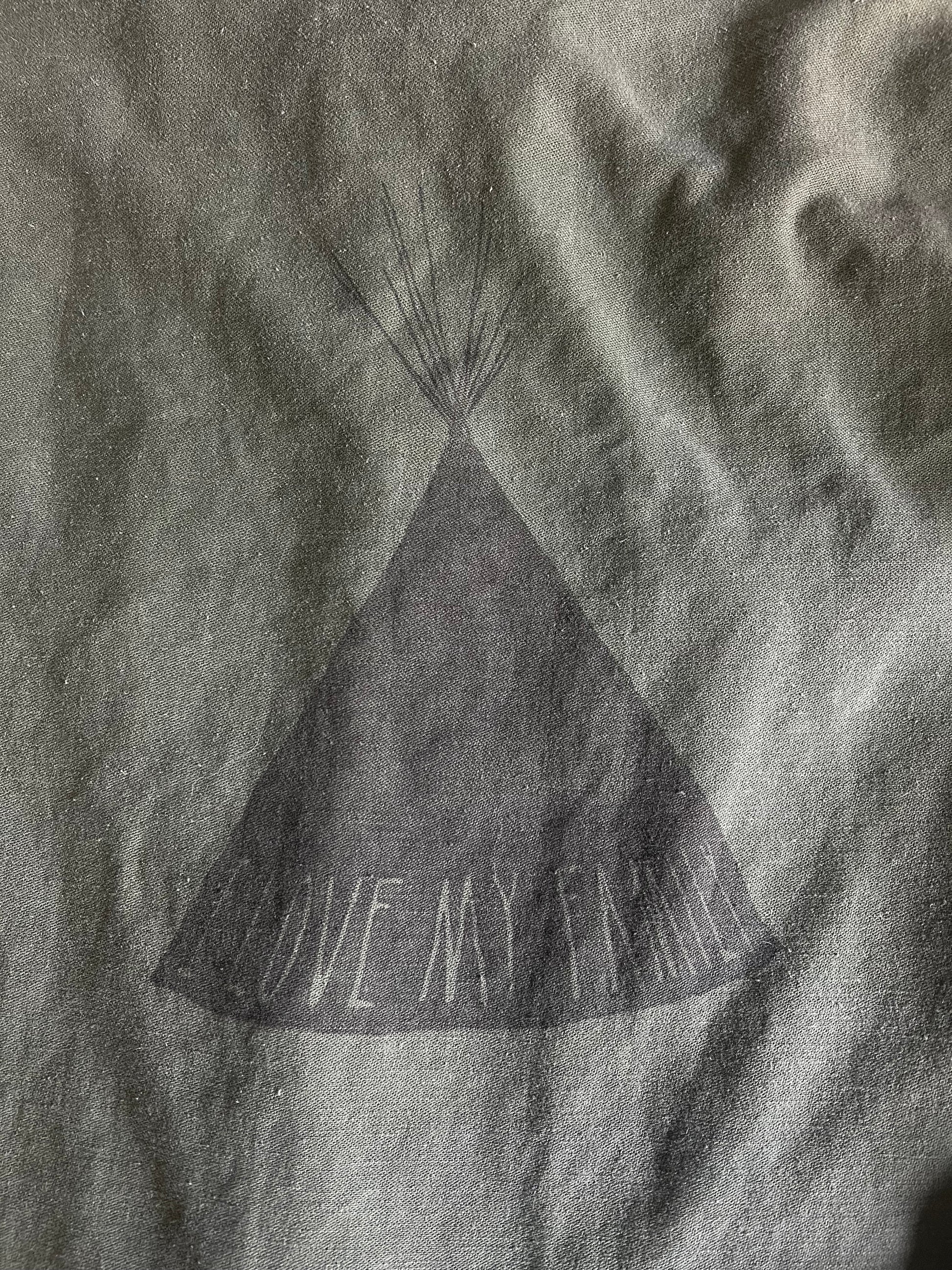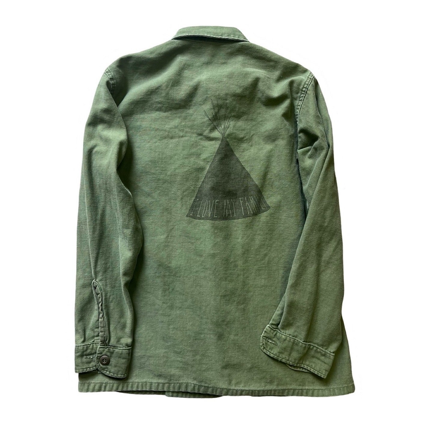 Great wear and fade on this vintage Army shirt jacket with collar patches and original @beauchamping sample “I Love My Family”/Tribe transfer on back, slightly off center. Measures 20” pit to pit and 26.5” top to bottom.