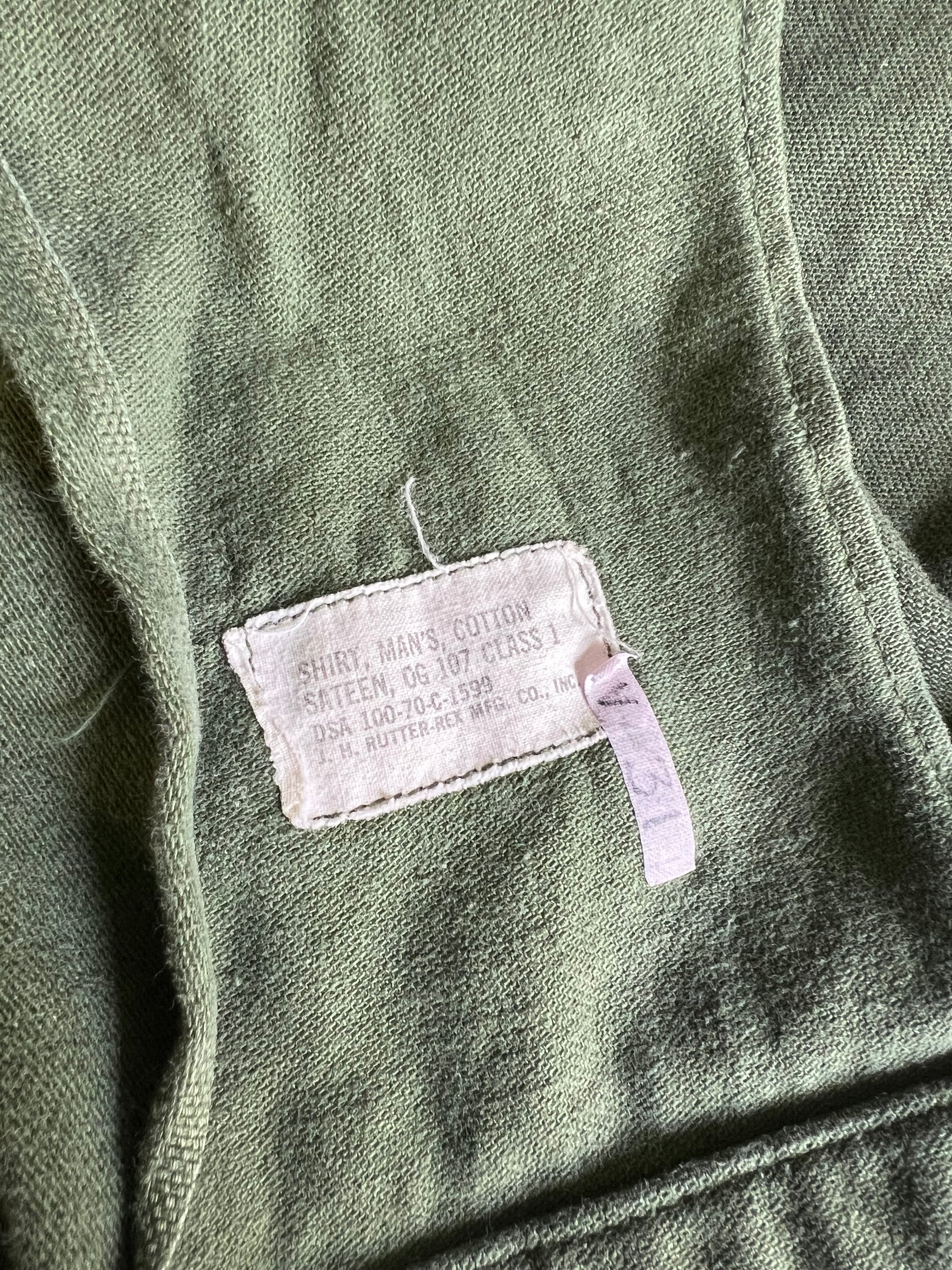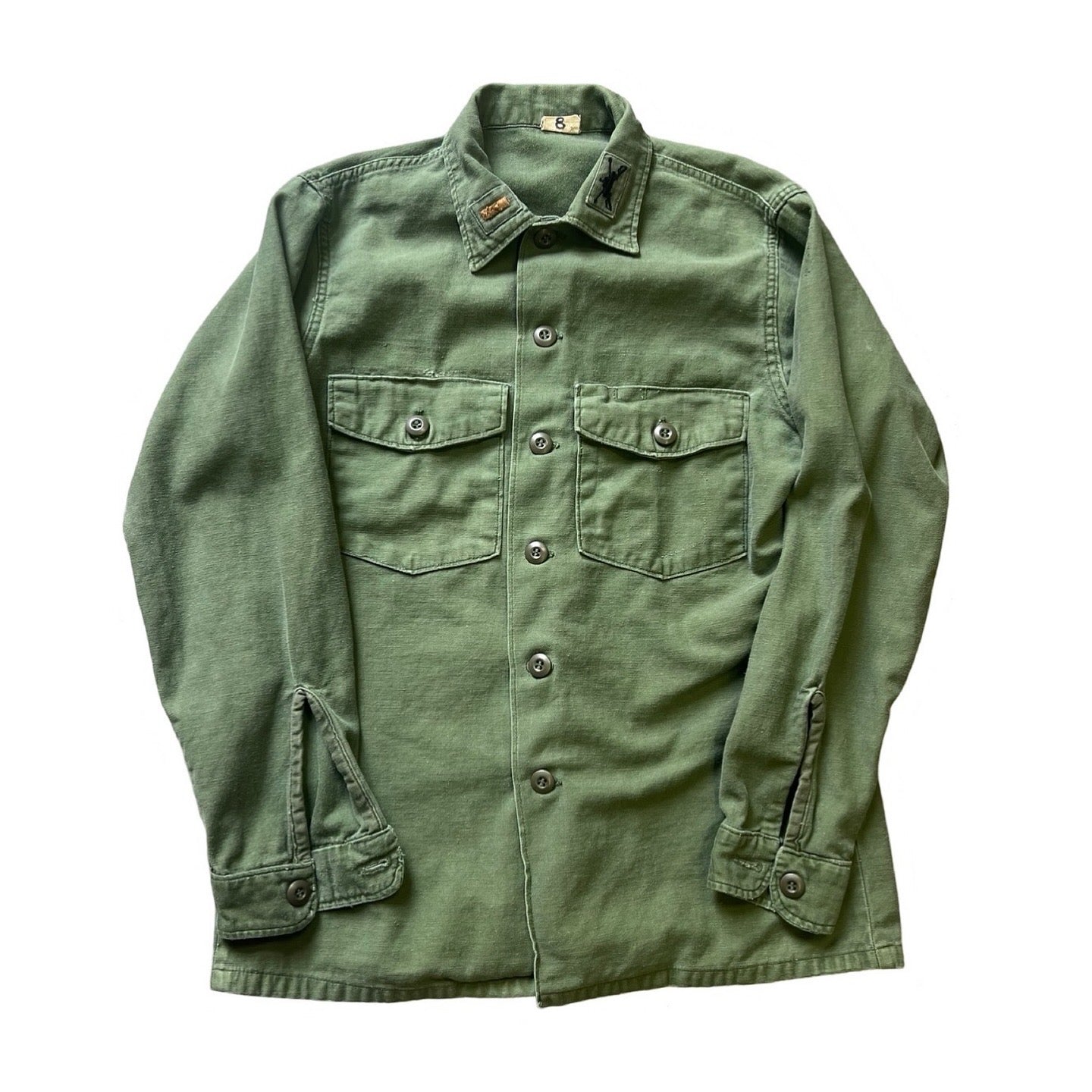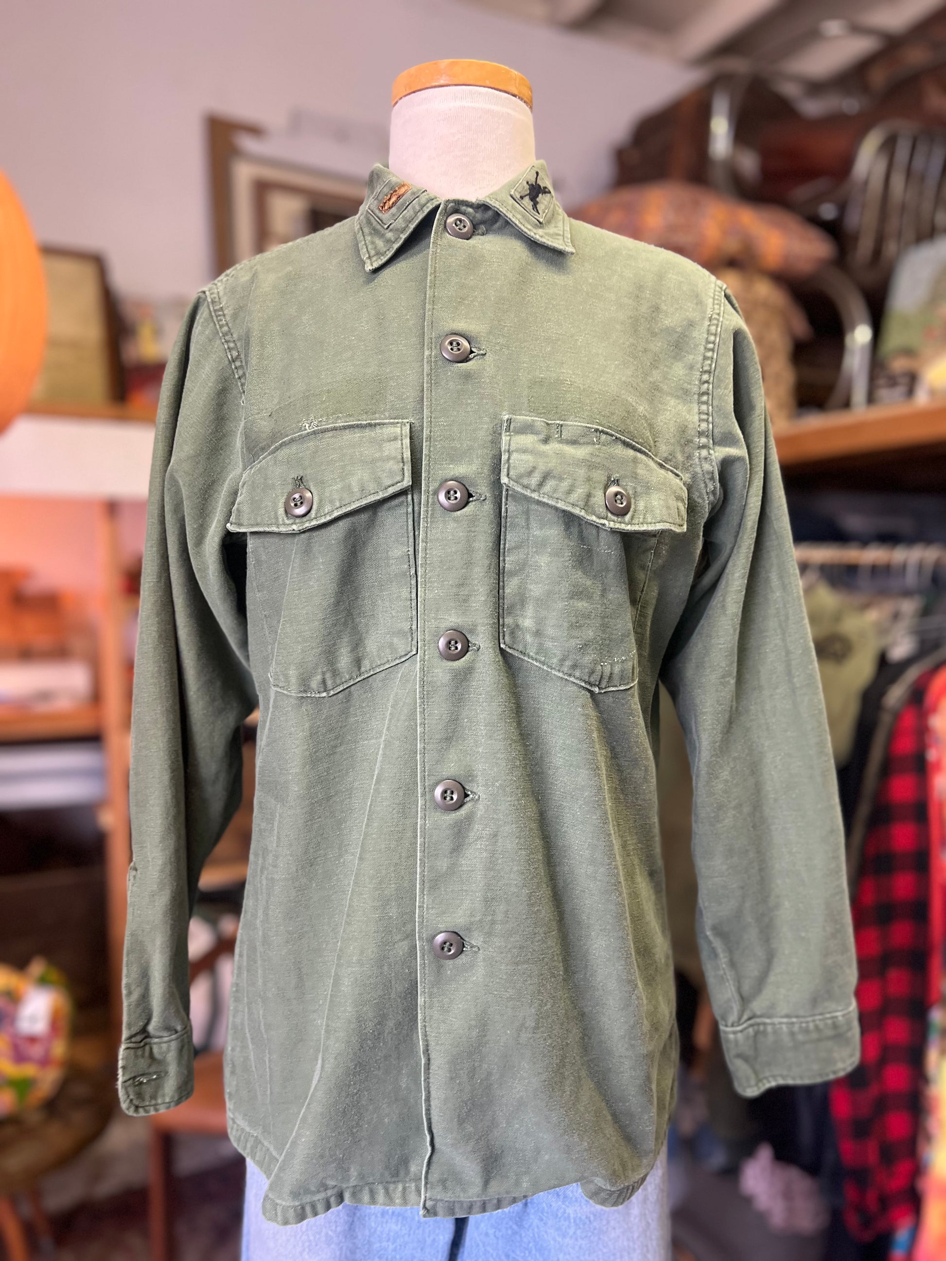 Great wear and fade on this vintage Army shirt jacket with collar patches and original @beauchamping sample “I Love My Family”/Tribe transfer on back, slightly off center. Measures 20” pit to pit and 26.5” top to bottom.