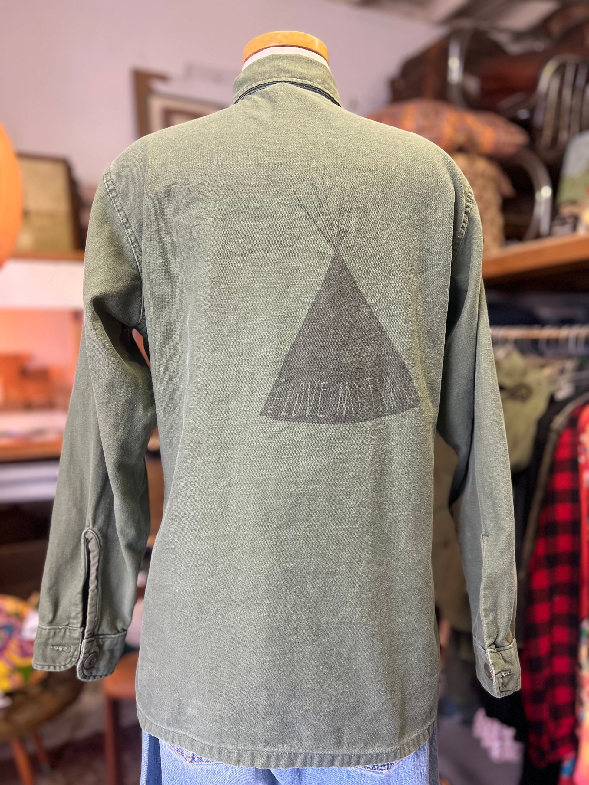 Vintage Army Jacket w/Patches and Original Beauchamping Art Sample “I Love My Family” Tribe Transfer