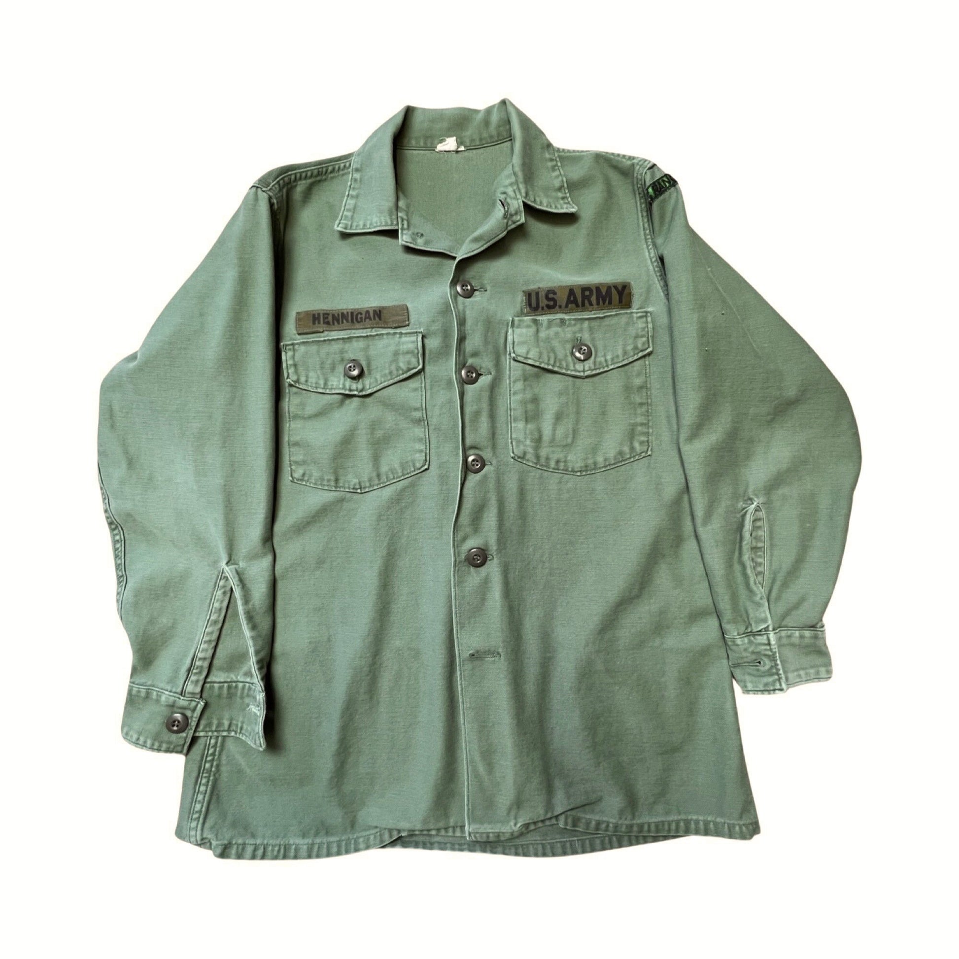 Vintage faded & distressed Army jacket with Hennigan name patch. Measures 21” pit to pit and 28” top to bottom.