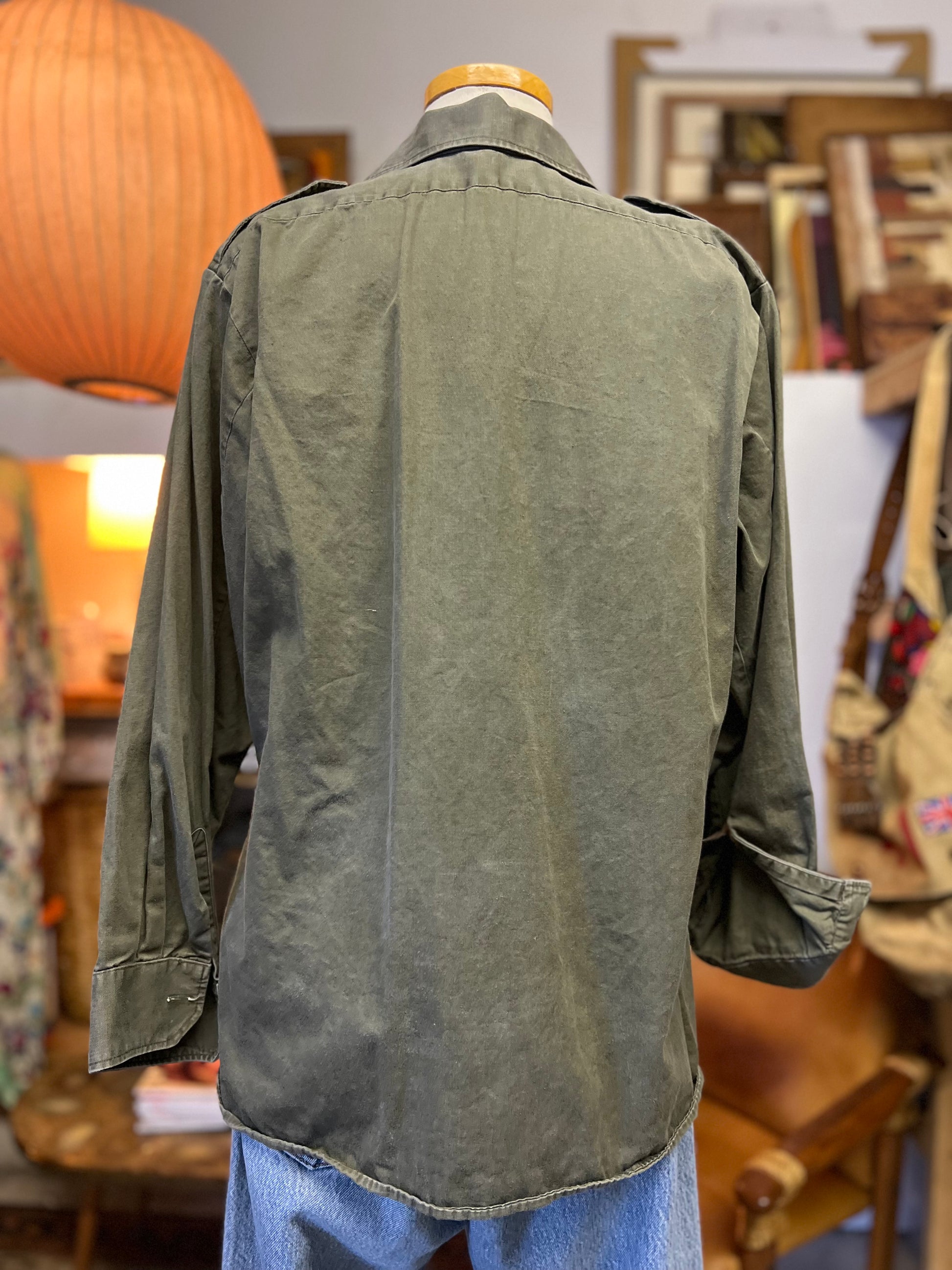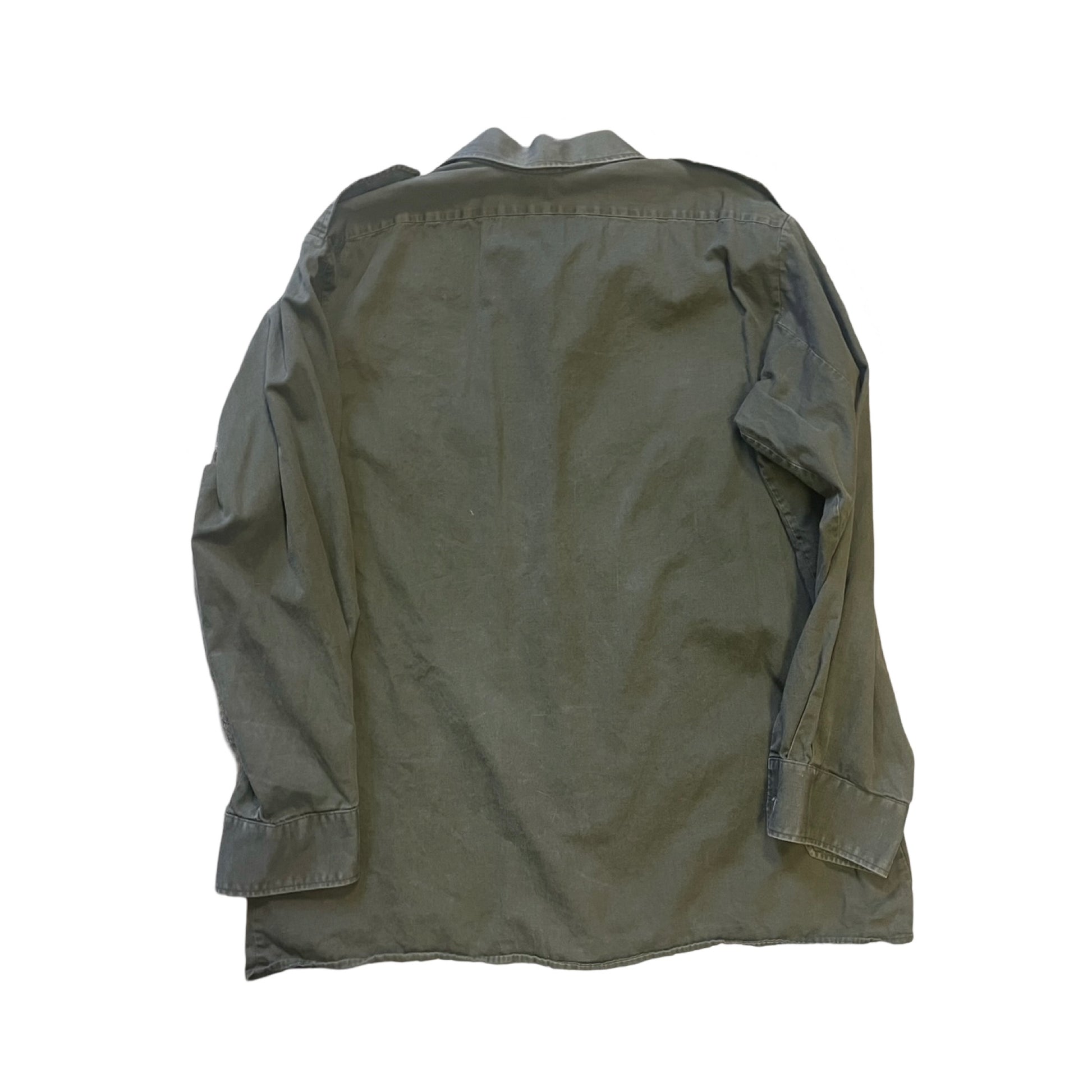Beautiful wear and fade on this vintage Austrian military shirt jacket. Button front with pointed collar and epaulettes. Tag inside reads Heerseigentum. Measures 22” pit to pit 28.5” top to bottom.