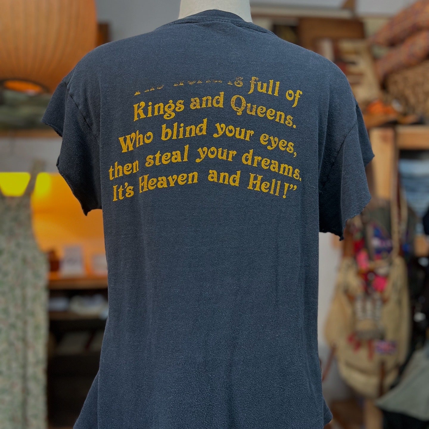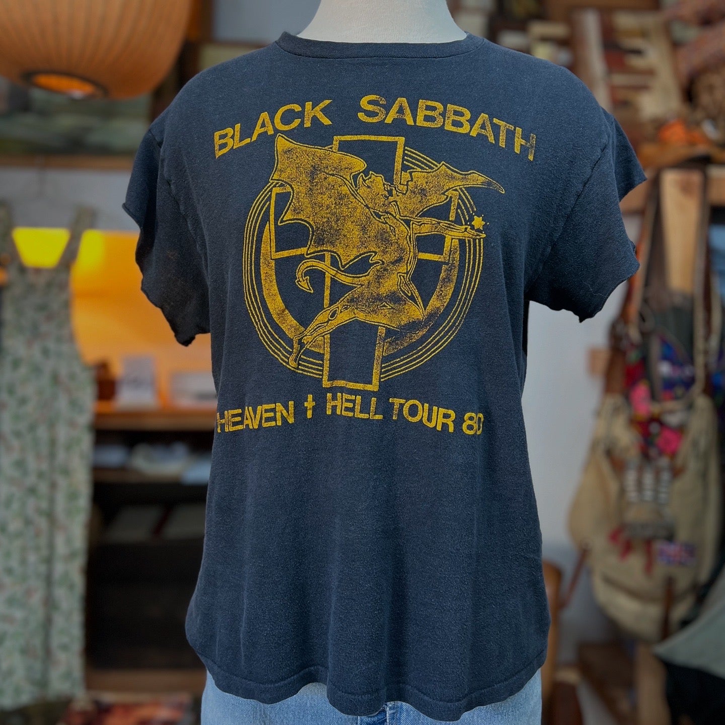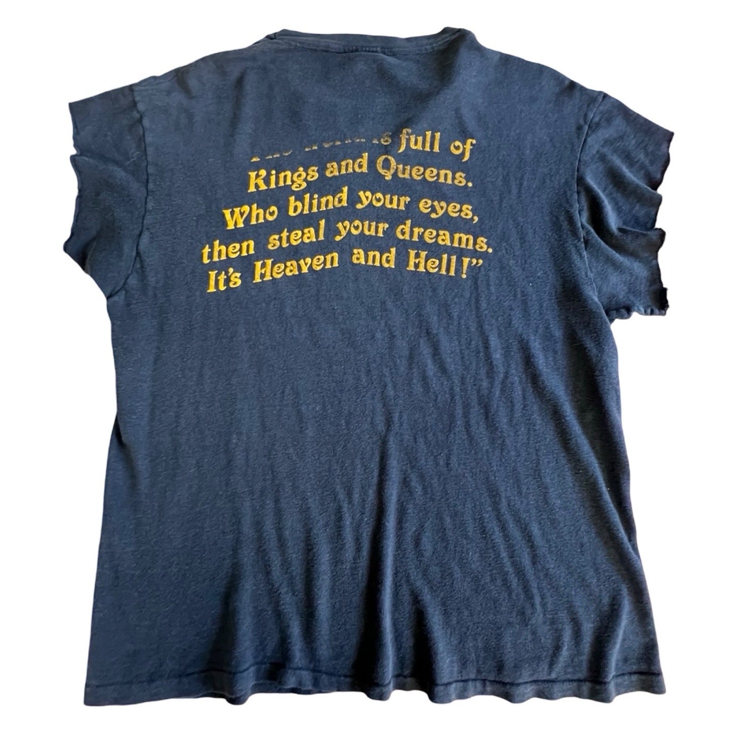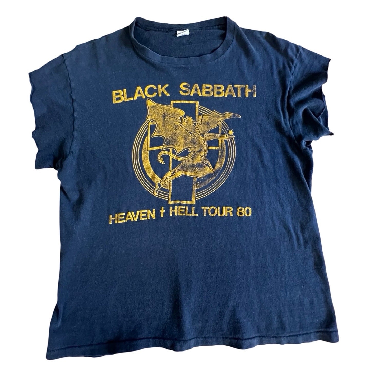 Vintage original Black Sabbath 1980 Heaven & Hell Tour single stitch double sided t-shirt. Very soft, thin, and worn. Sleeves have been cut. Hanes tag says L, actual measurements 19” pit to pit and 24.5” top to bottom. Prince reflects cut sleeves.