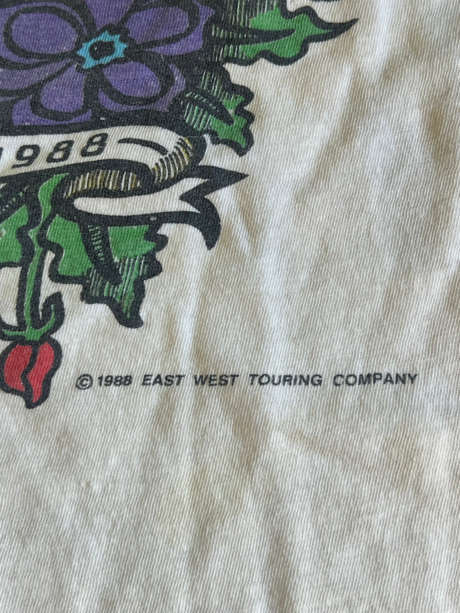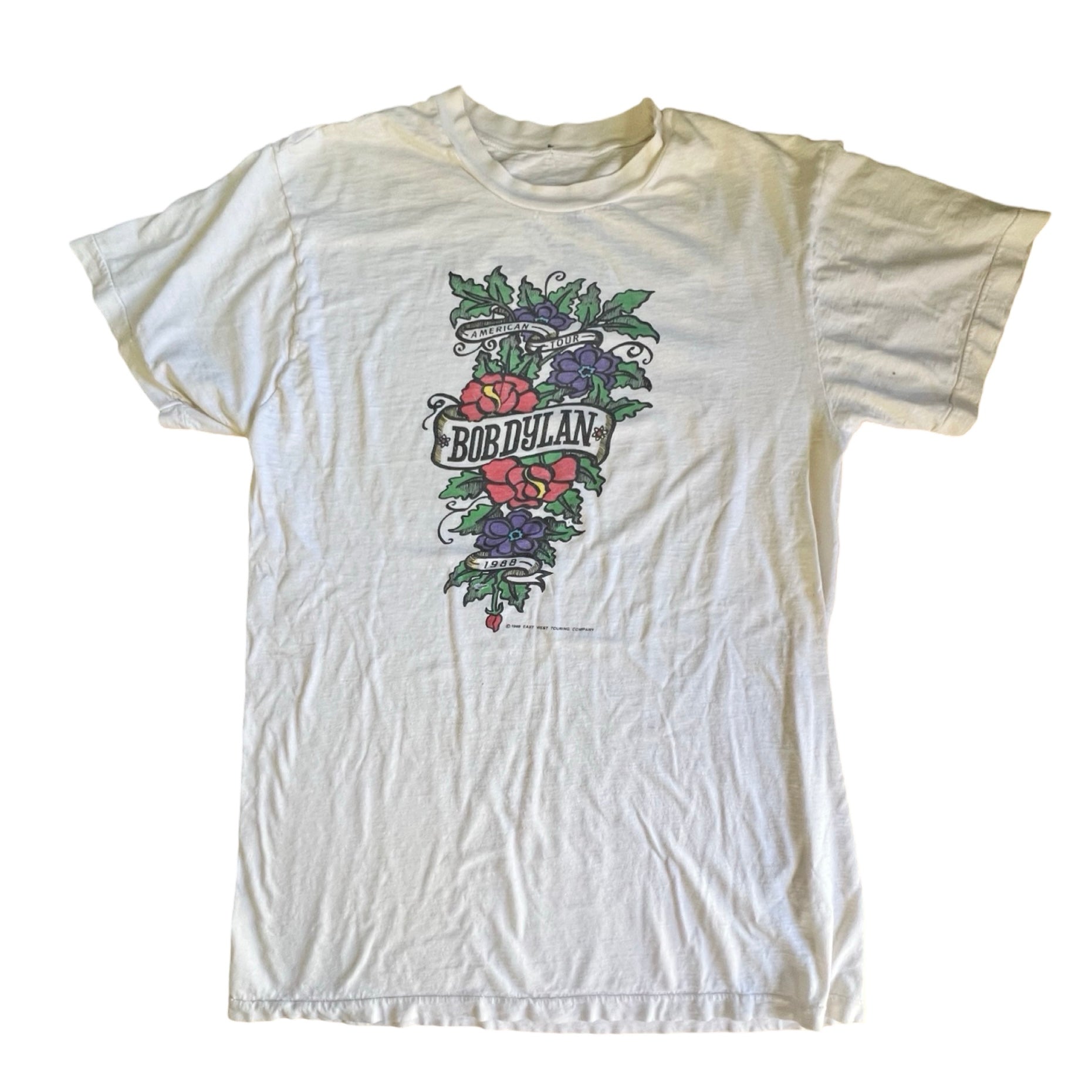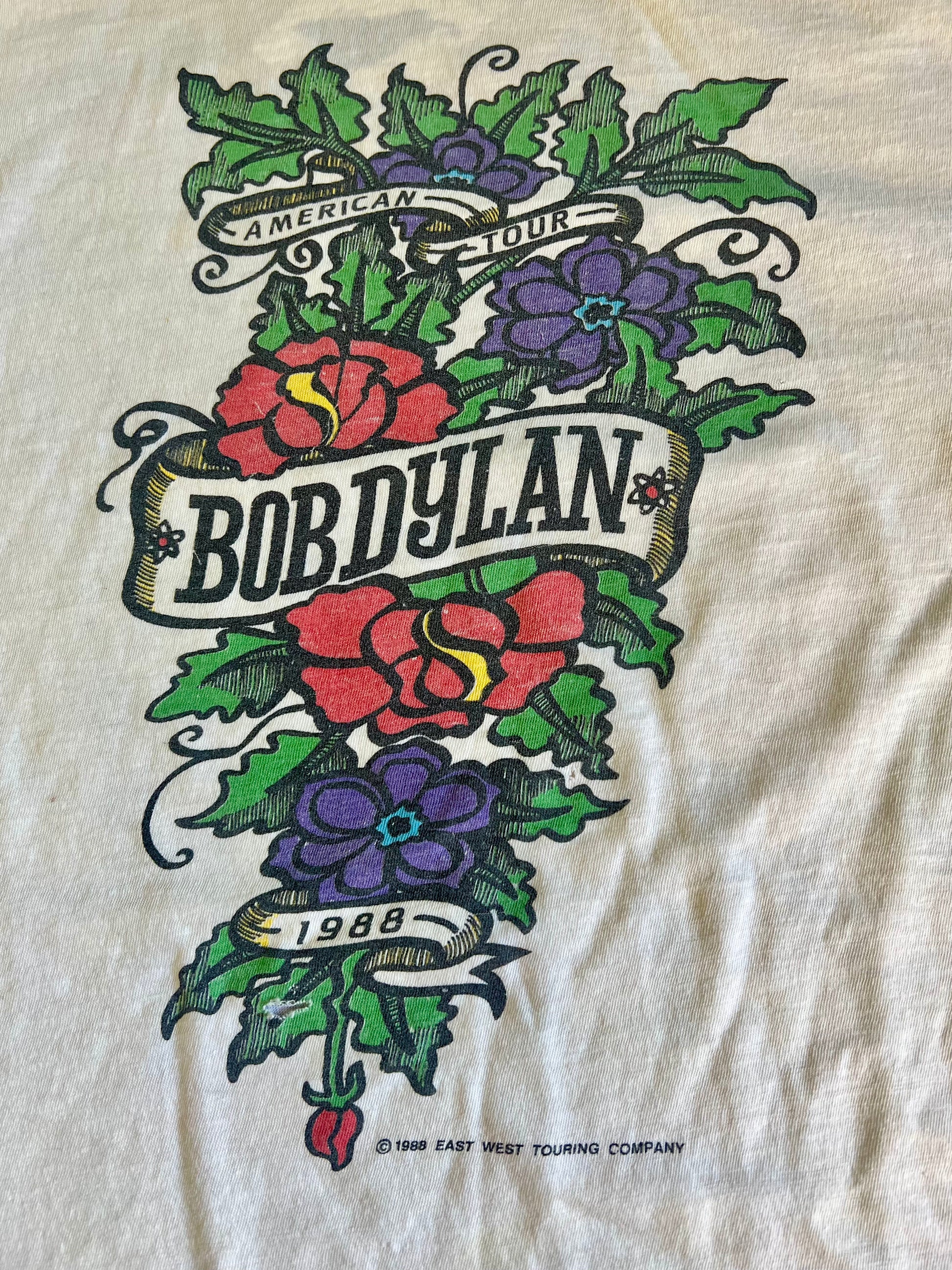 Vintage 1988 Bob Dylan American Tour t-shirt. Single stitch, front and back graphics, soft & thin with great patina and a few small spots. Copyright 1988 East West Touring Company. Measures 19' pit to pit and 27.5" top to bottom.