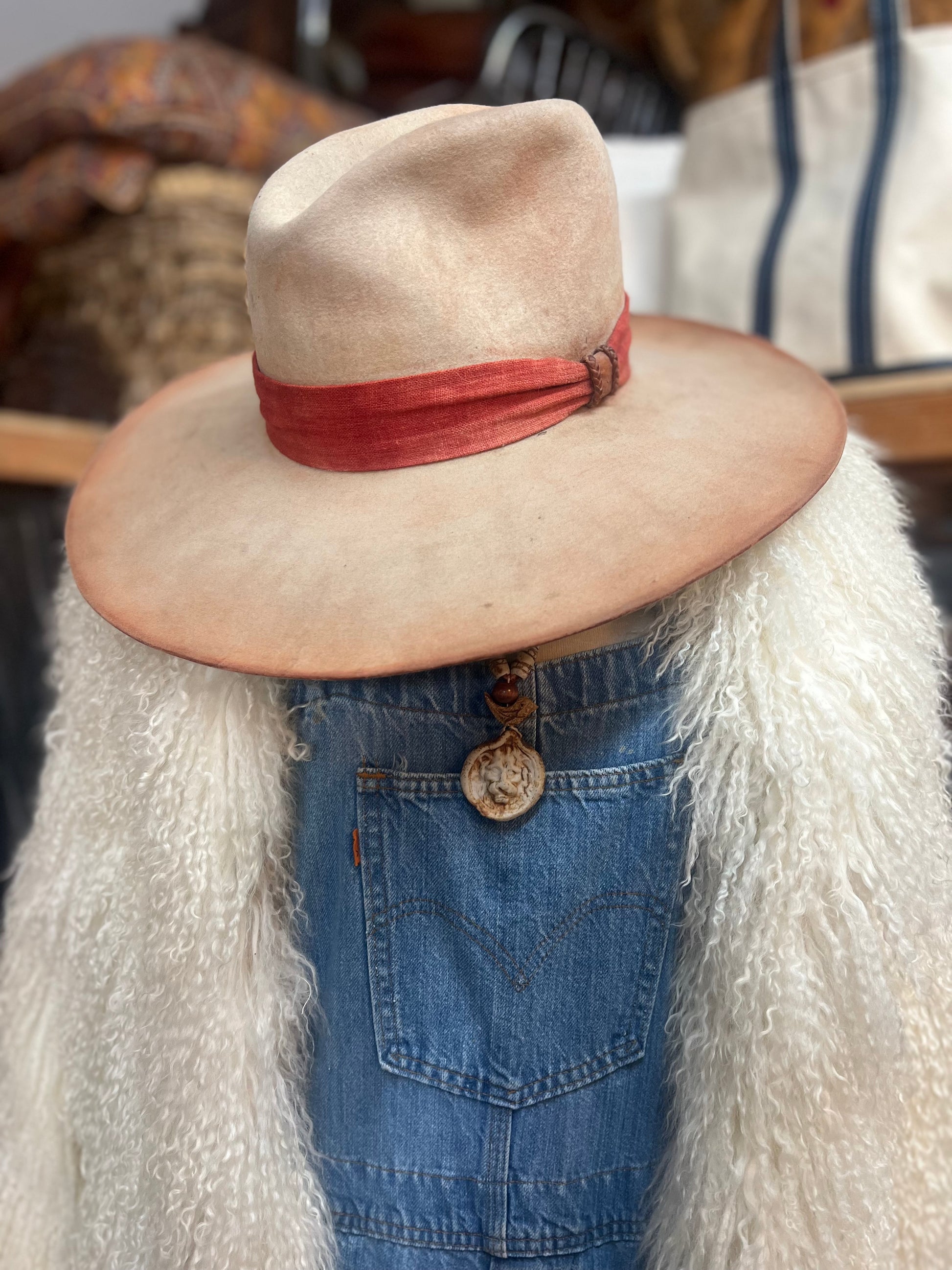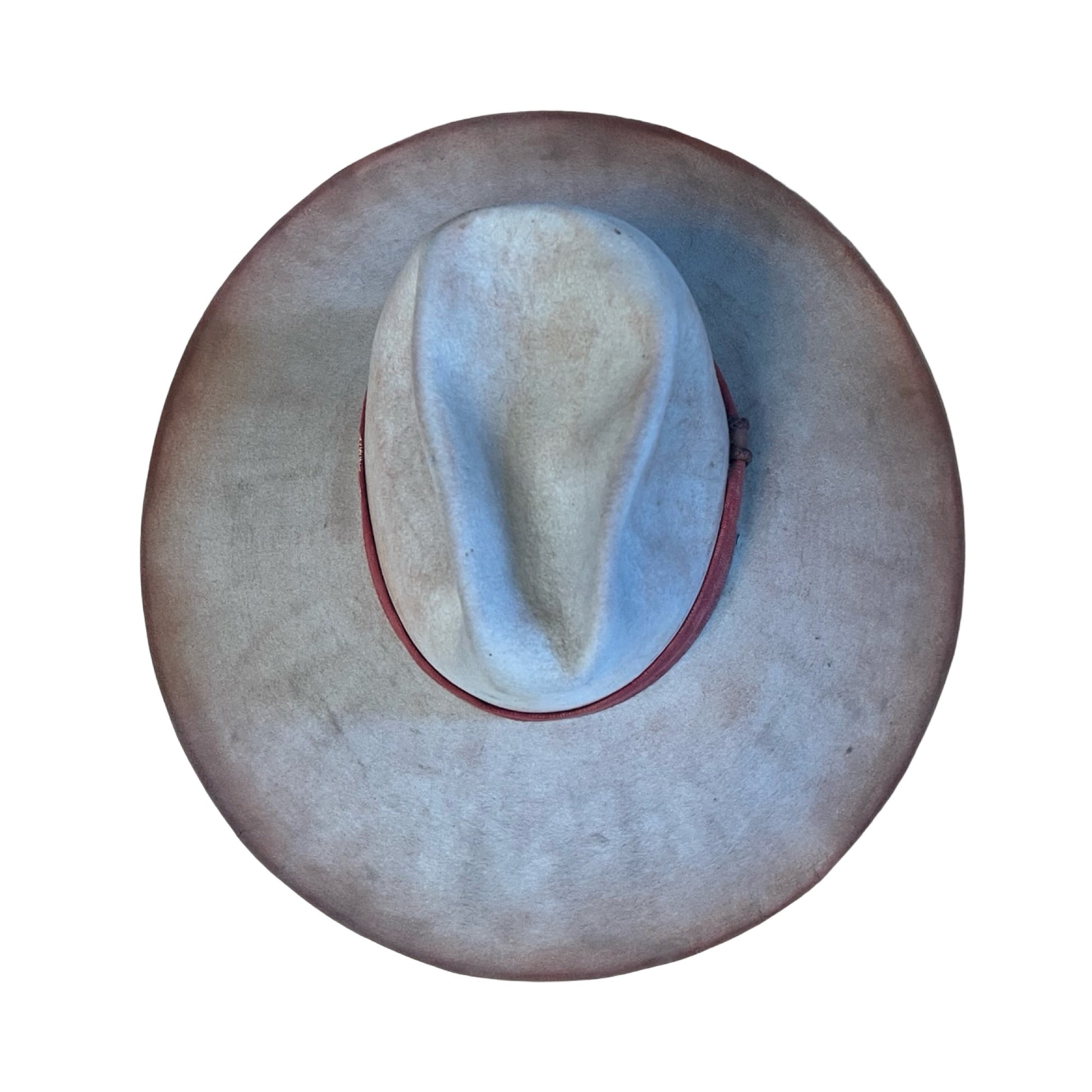 This gorgeous vintage customized Stetson hat features vintage fabric hat band and tipped reddish tint to brim. Measures approximately 22.75” circumference, a bit on the bigger side, but can be adjusted to a perfect fit with hat sizing foam strip. A real showstopper of a hat, originally from San Roberts LA and one of a kind.