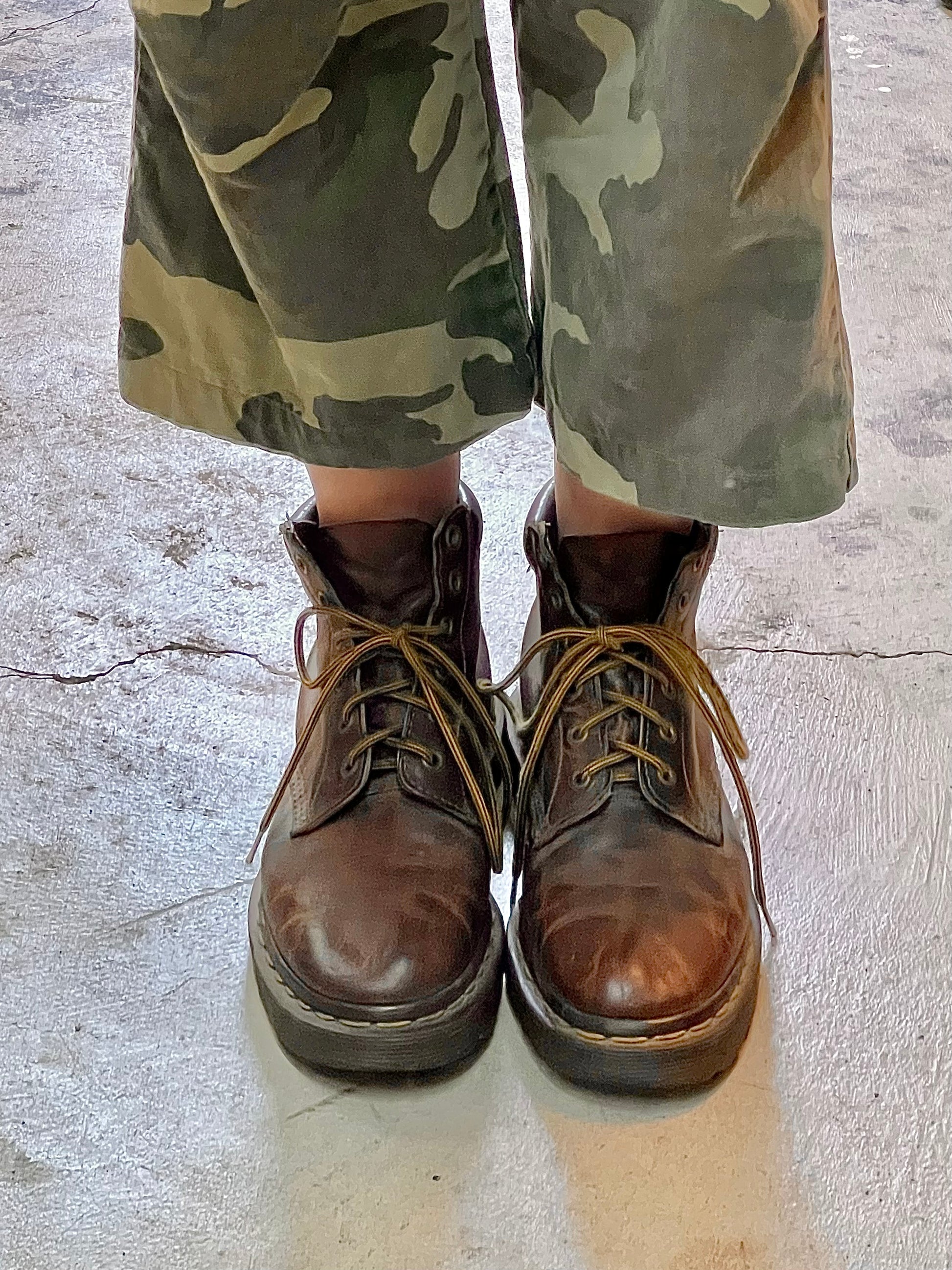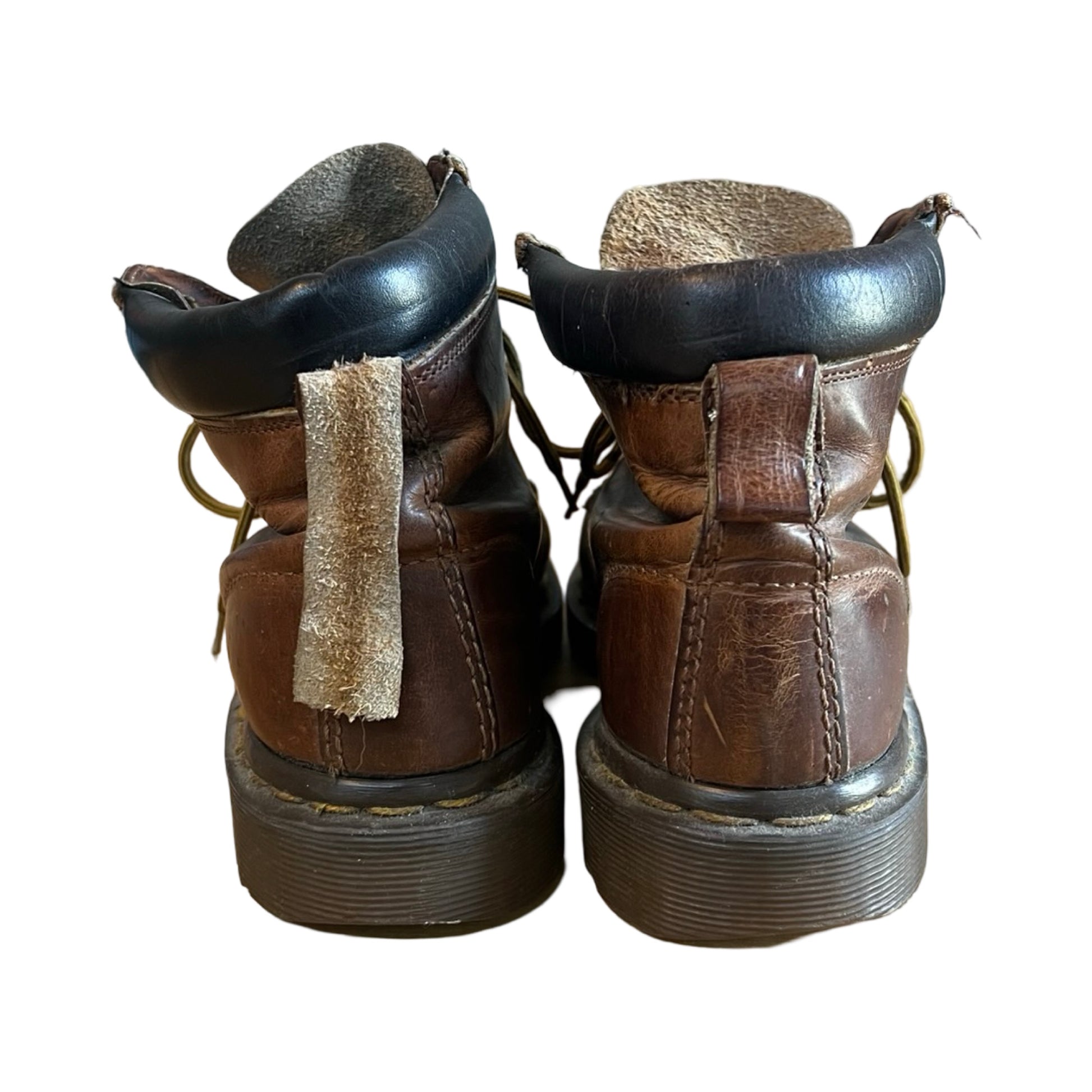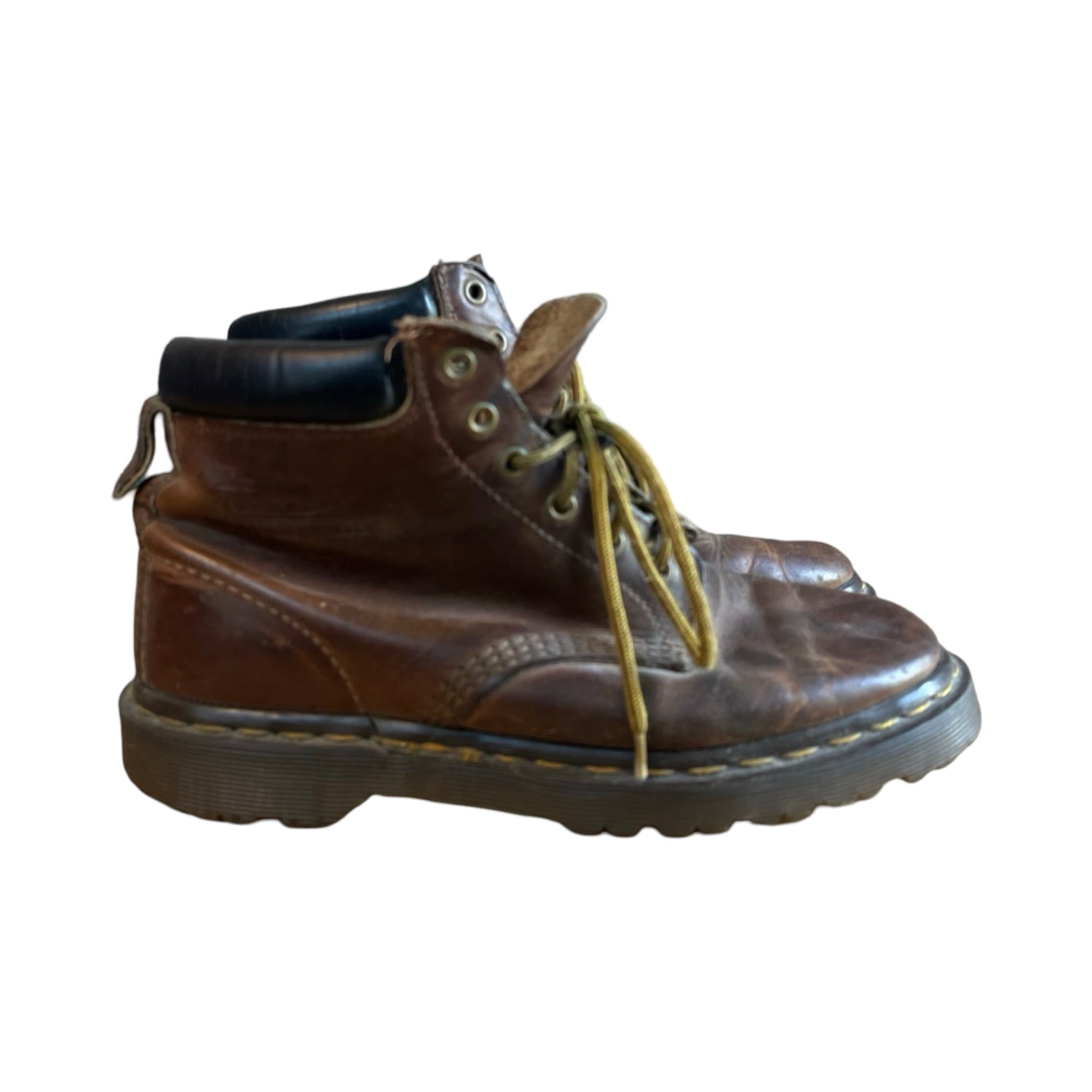 Vintage worn and distressed Dr. Martens Saxon boots. Scuffed, worn, and already broken in (the hardest part with docs), aftermarket hiking boot laces, padded back, good condition, back tab unattached on left boot, tons of life left in these beauties. Size worn off, fits womens 8/8.5 men’s 7.