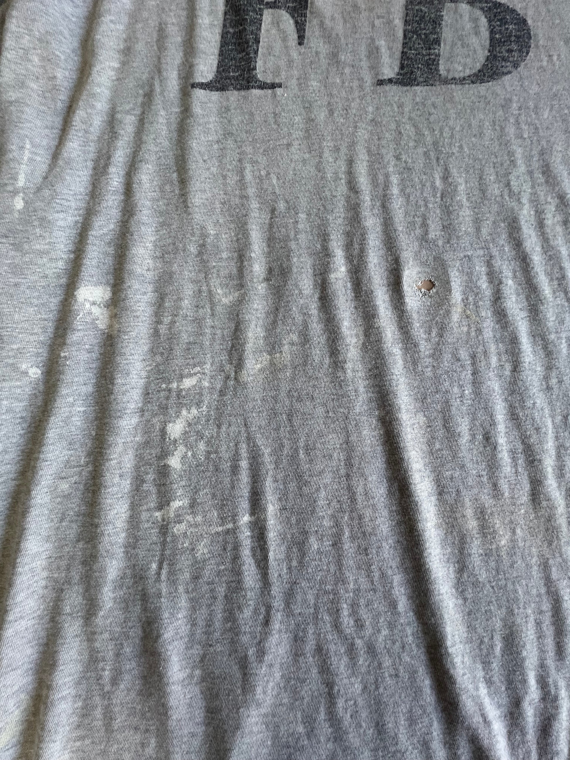 Ok this was supposed to be in the last drop but I couldn’t bring myself to part with it. So here we go again. Super soft and faded and worn to perfection FBI tee with allover distressing…paint, holes, repairs. Hangs like an oversized dream, love the fit of this tee! Delta tag size XXL, measures 25” pit to pit and 29” top to bottom.