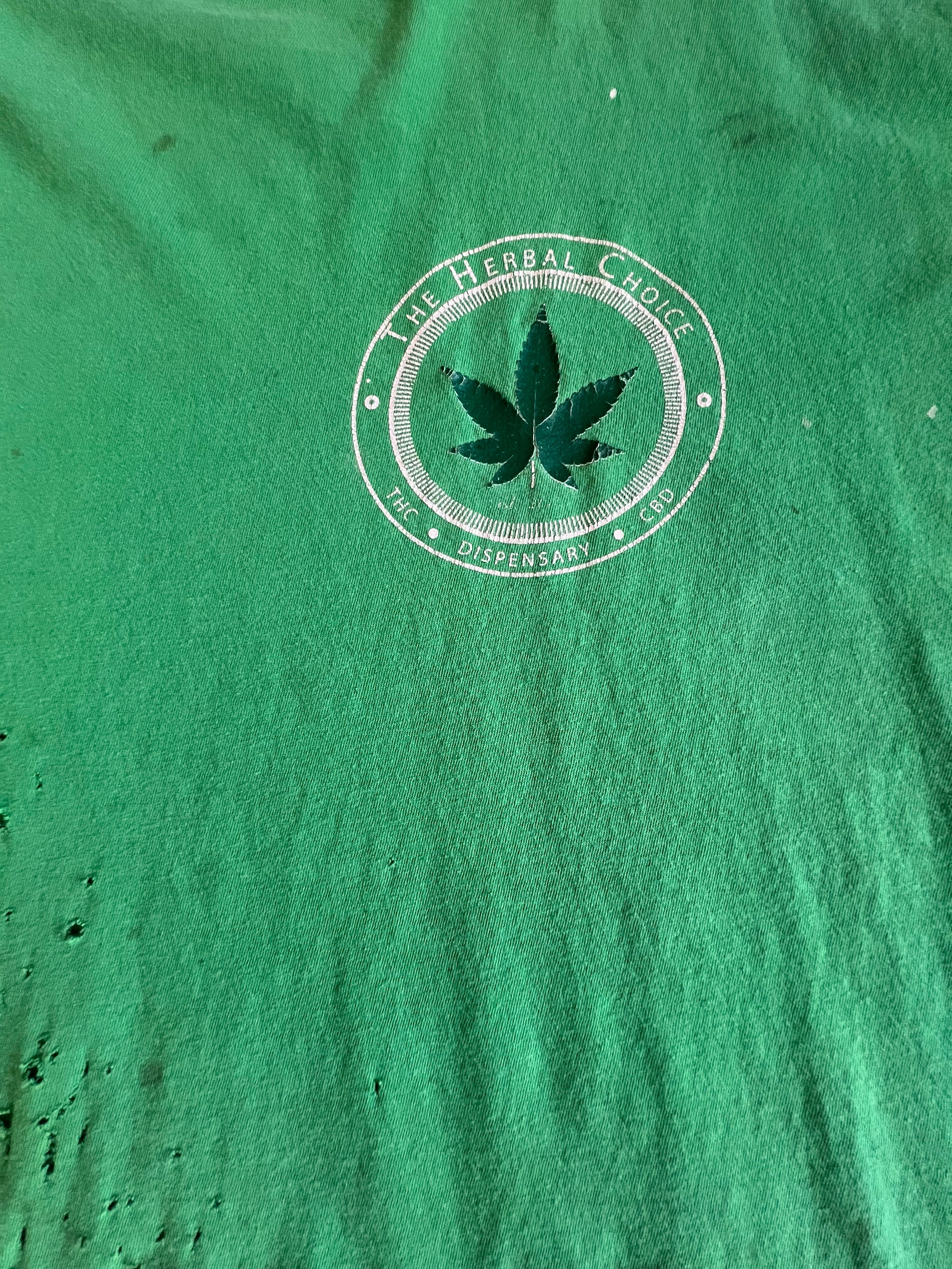 This tee is incredible!! Super distressed, soft, and worn to perfection with amazing graphics. “Sativa in the streets, Indica in the sheets” on back, The Herbal Choice Dispensary on front. Holes, paint, and spots throughout with cut off sleeves. Fits oversized, measuring 28” pit to pit by 29” top to bottom. This shirt is really something.