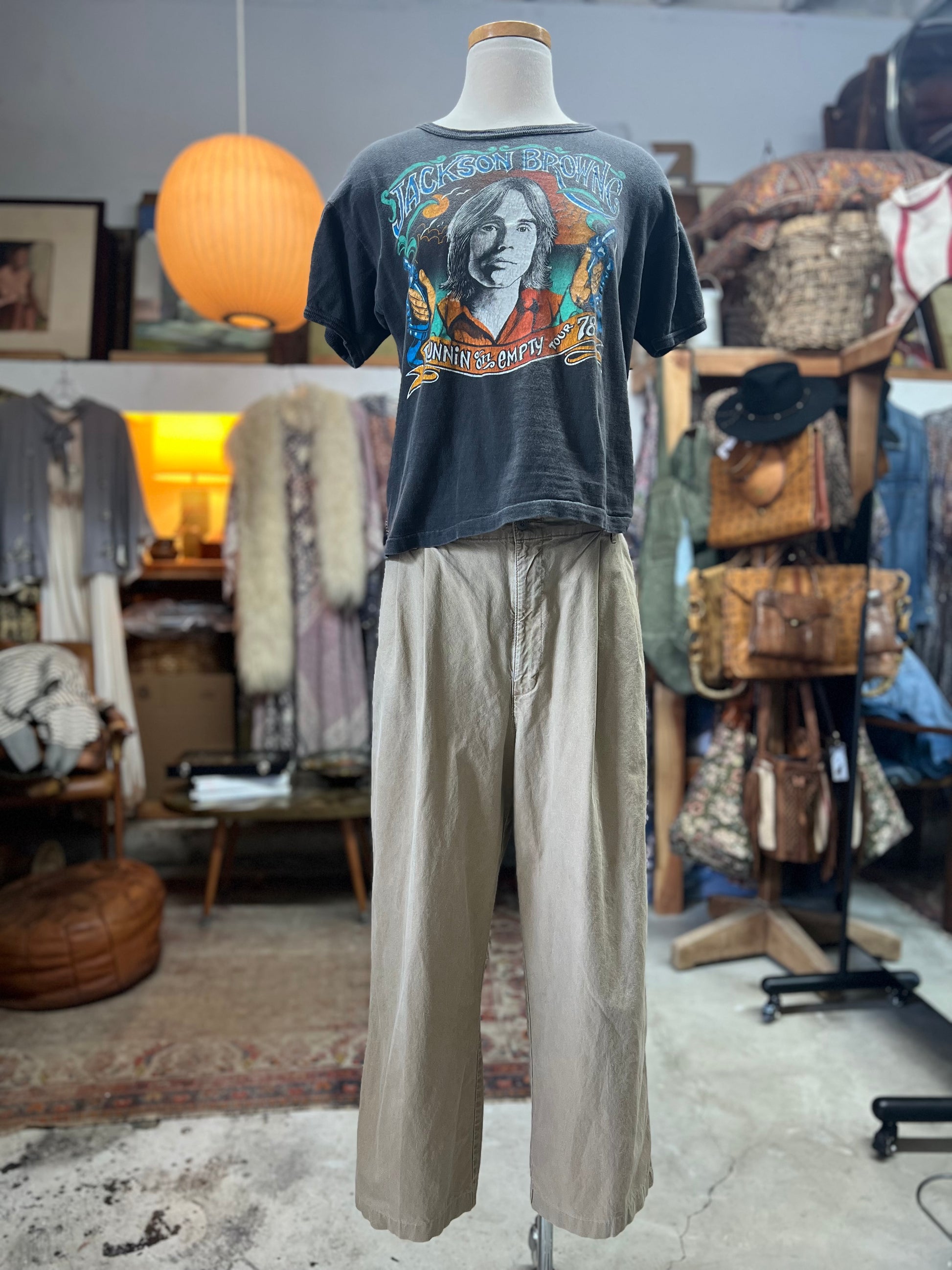 Vintage worn, soft, and thin Dockers featuring pleated front and adjustable button waist. Tag reads 38 x 34, but they’ve been altered so actual measurements are 36” waist and 25” inseam. Super cute pair of 80’s classic khakis. *pinned on mannequin