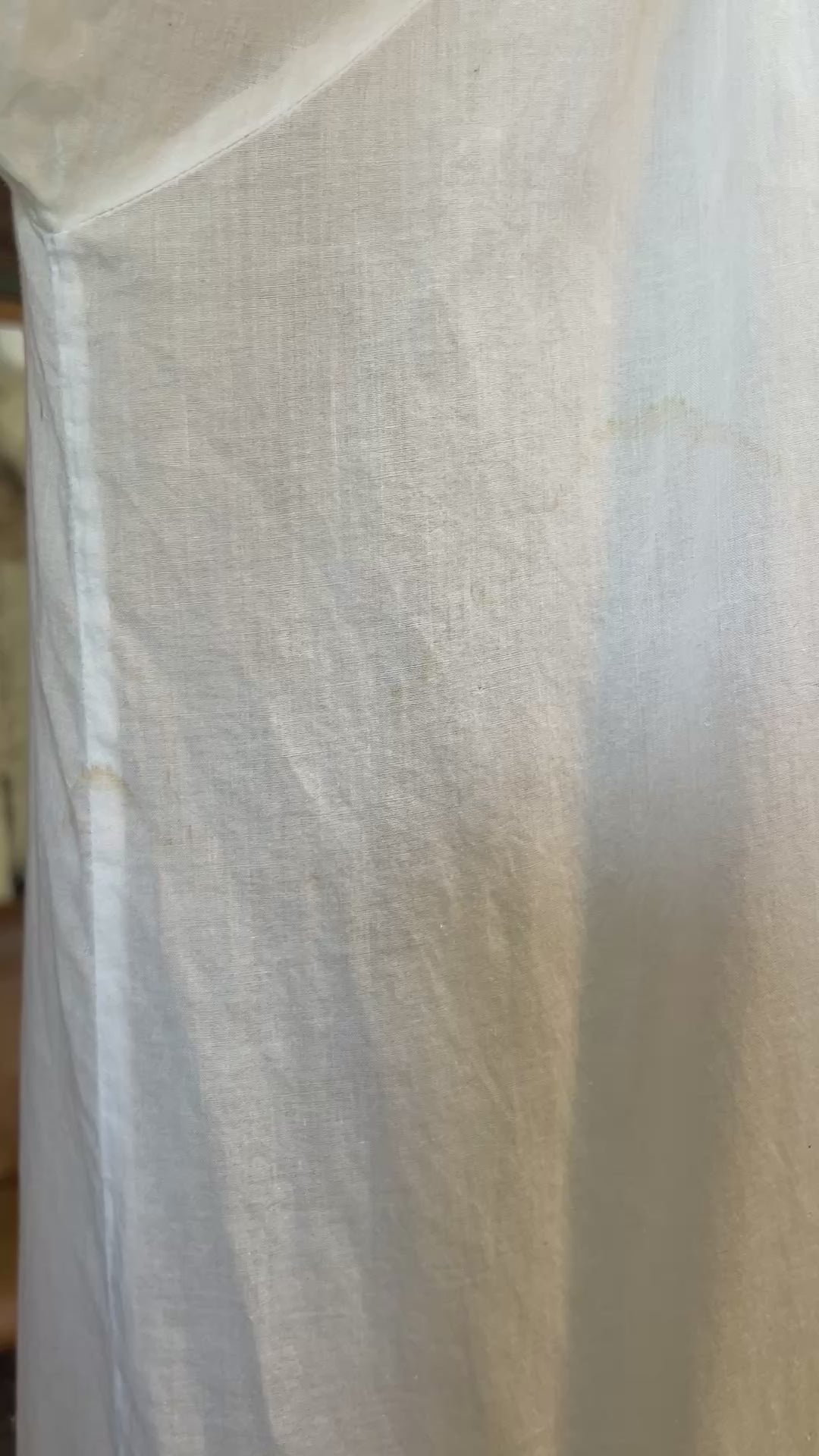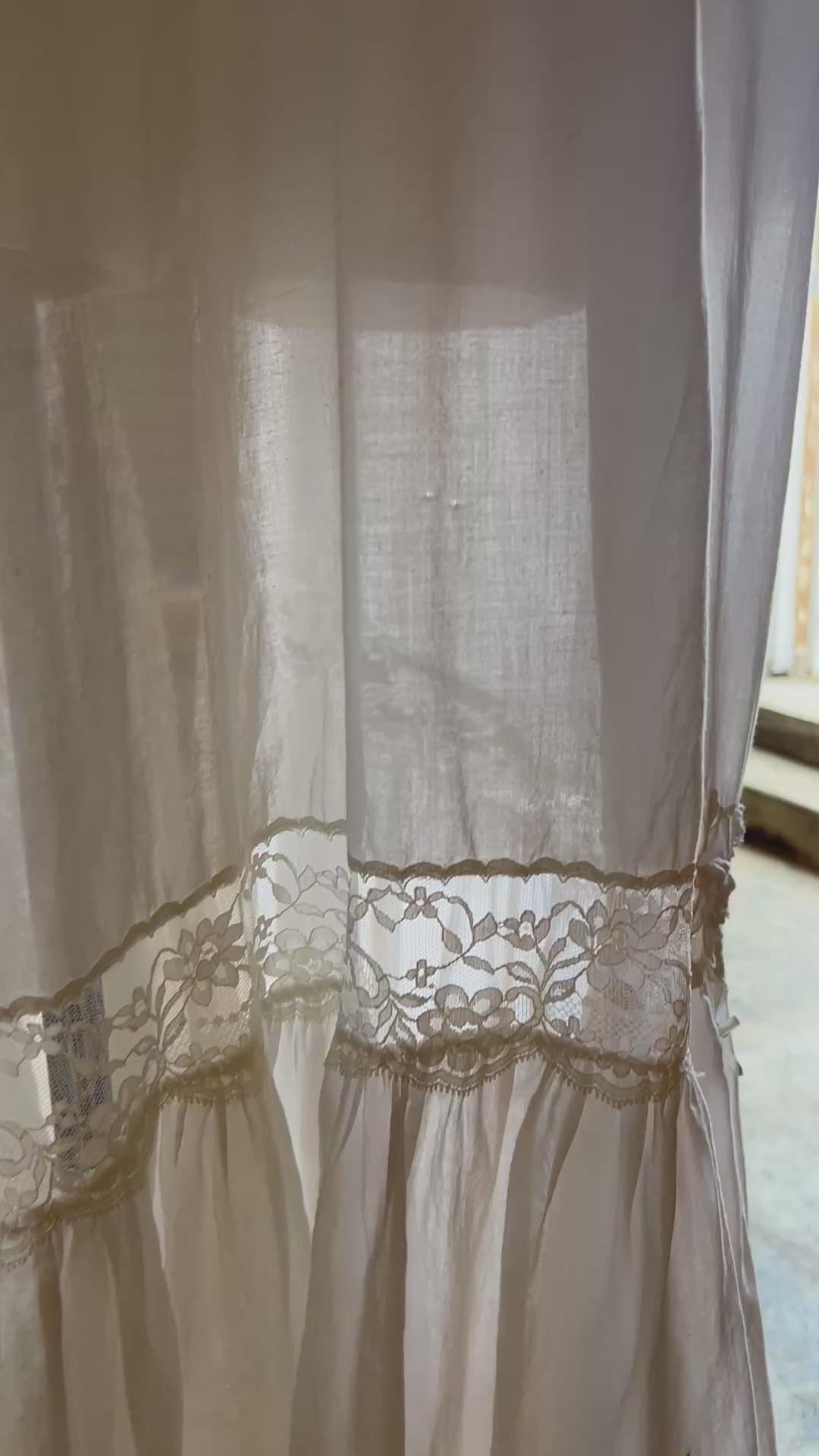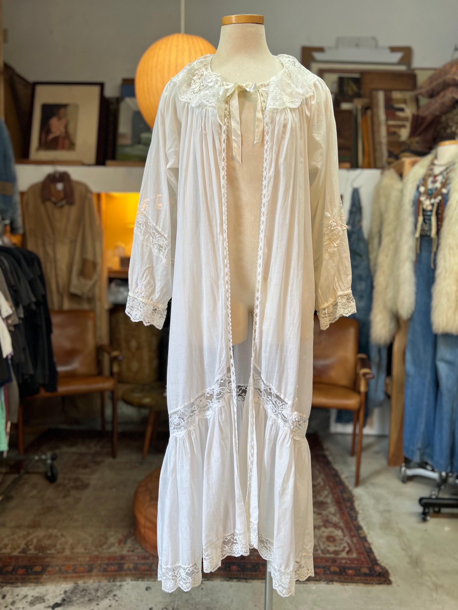 This dreamy vintage sheer cotton peignoir is the sweetest! Adorned with flowers & pearls and trimmed with lace, it features a ruffled lace collar and ties at the neck with a silk ribbon. There are some stains and small gold throughout (see pics) but are barely noticeable while floating along in this beautiful bohemian layering piece. Tag reads Cinzia P/S.