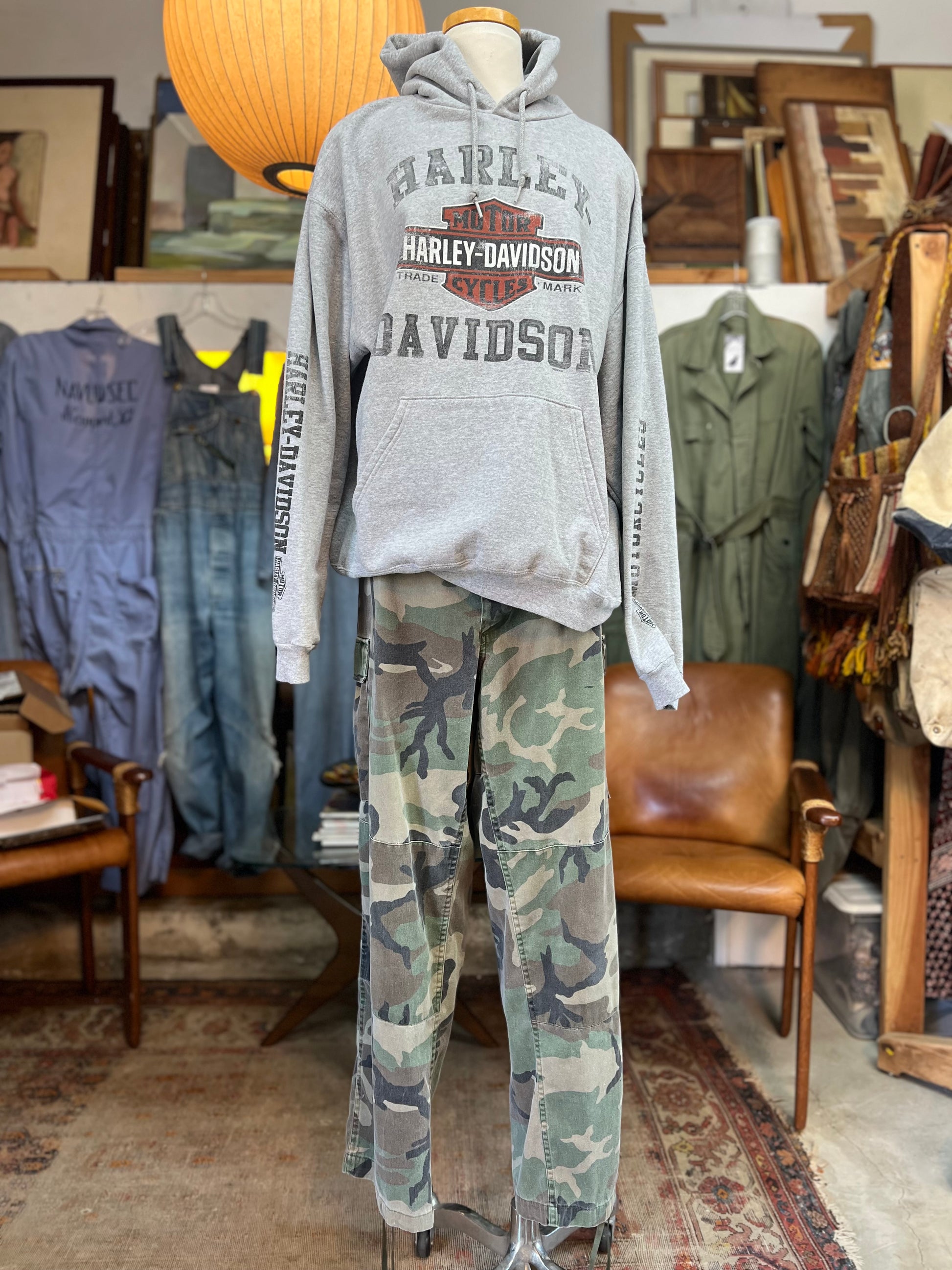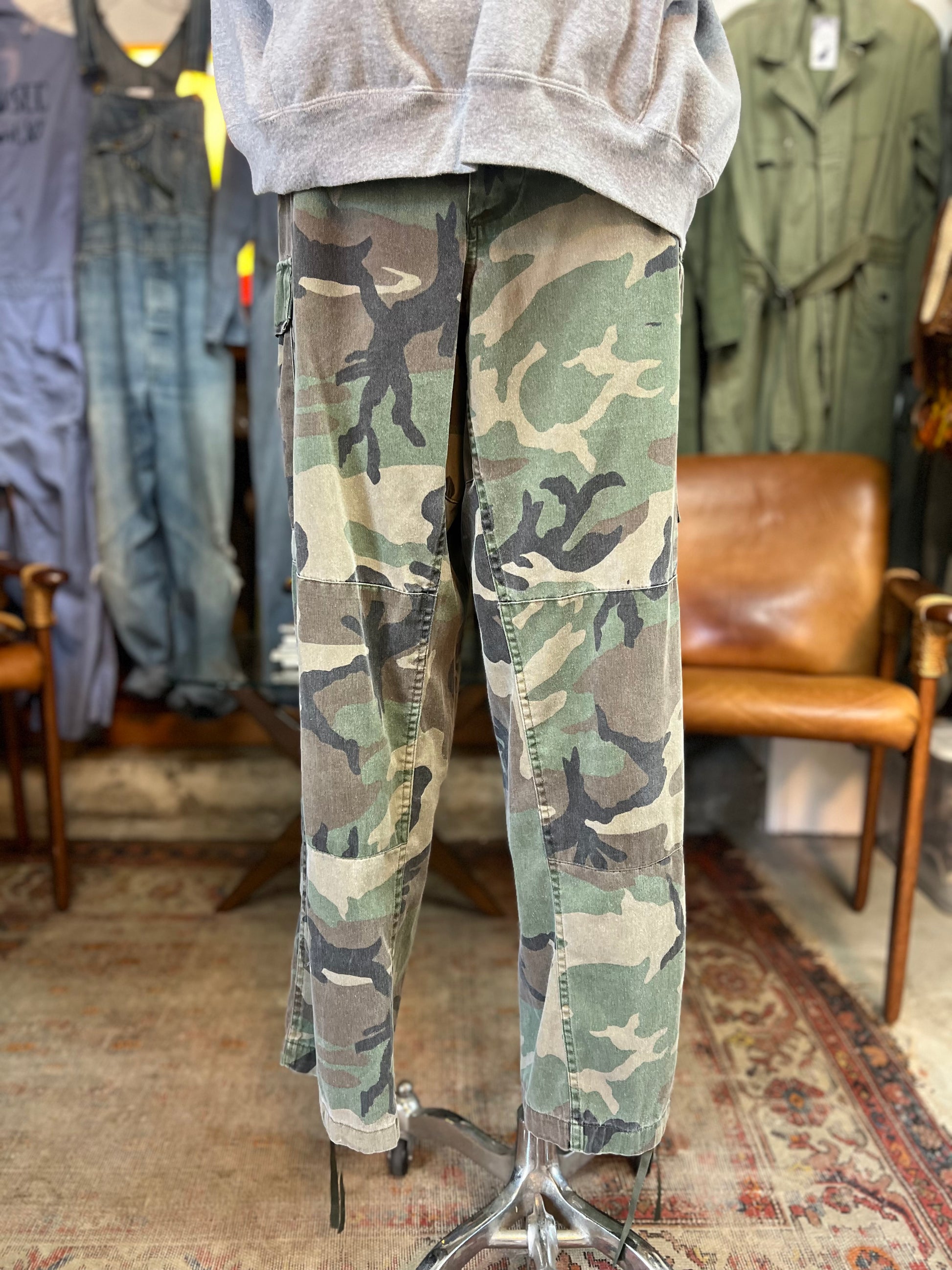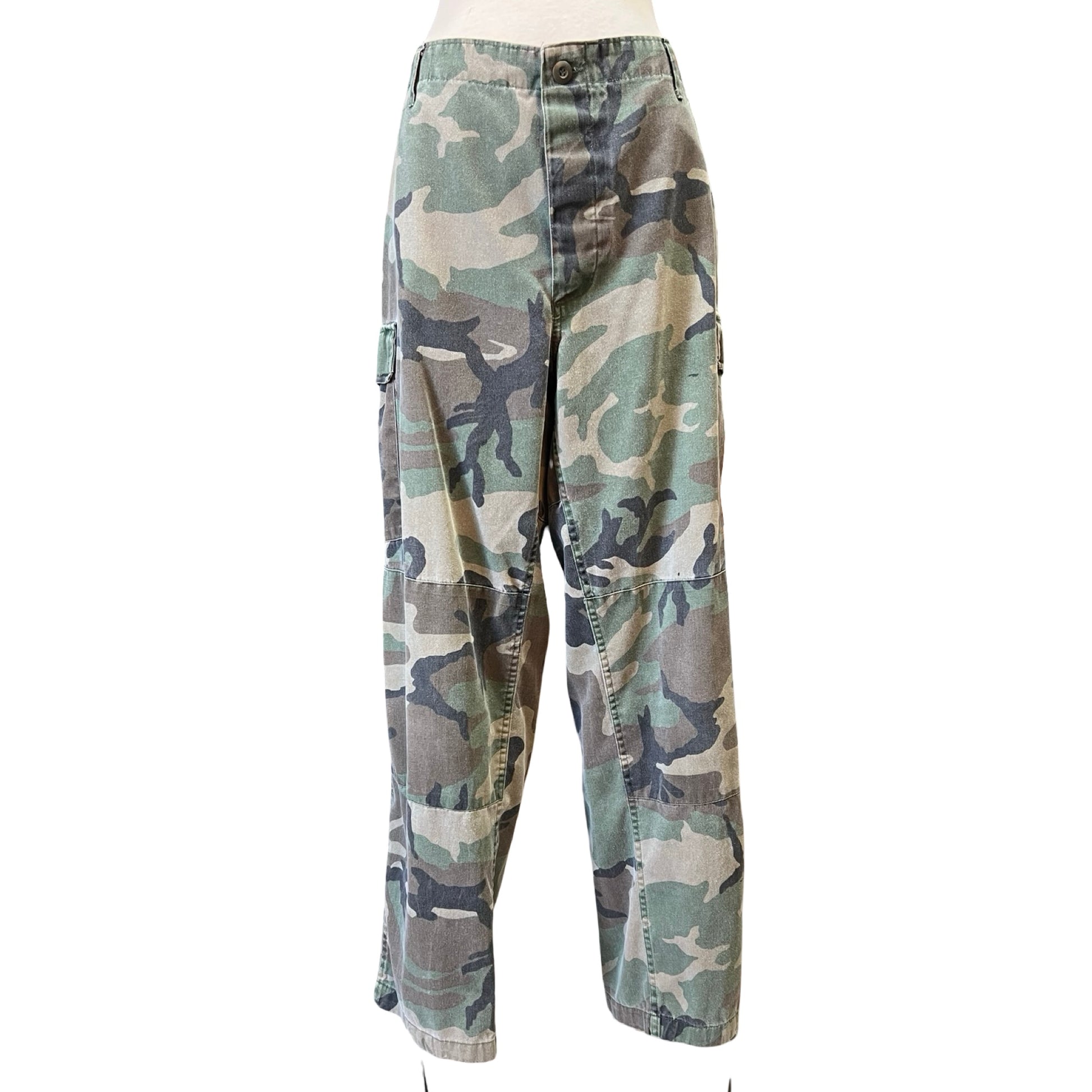Vintage double knee cargo camouflage pants. Great fade and softness on these with minor wear and distressing throughout (paint, loose threads, couple small holes). Button fly with adjustable waist buckles and drawstring hems. Tag size waist 35” to 39” and inseam 29” to 32”. This is a great pair of vintage camo pants.