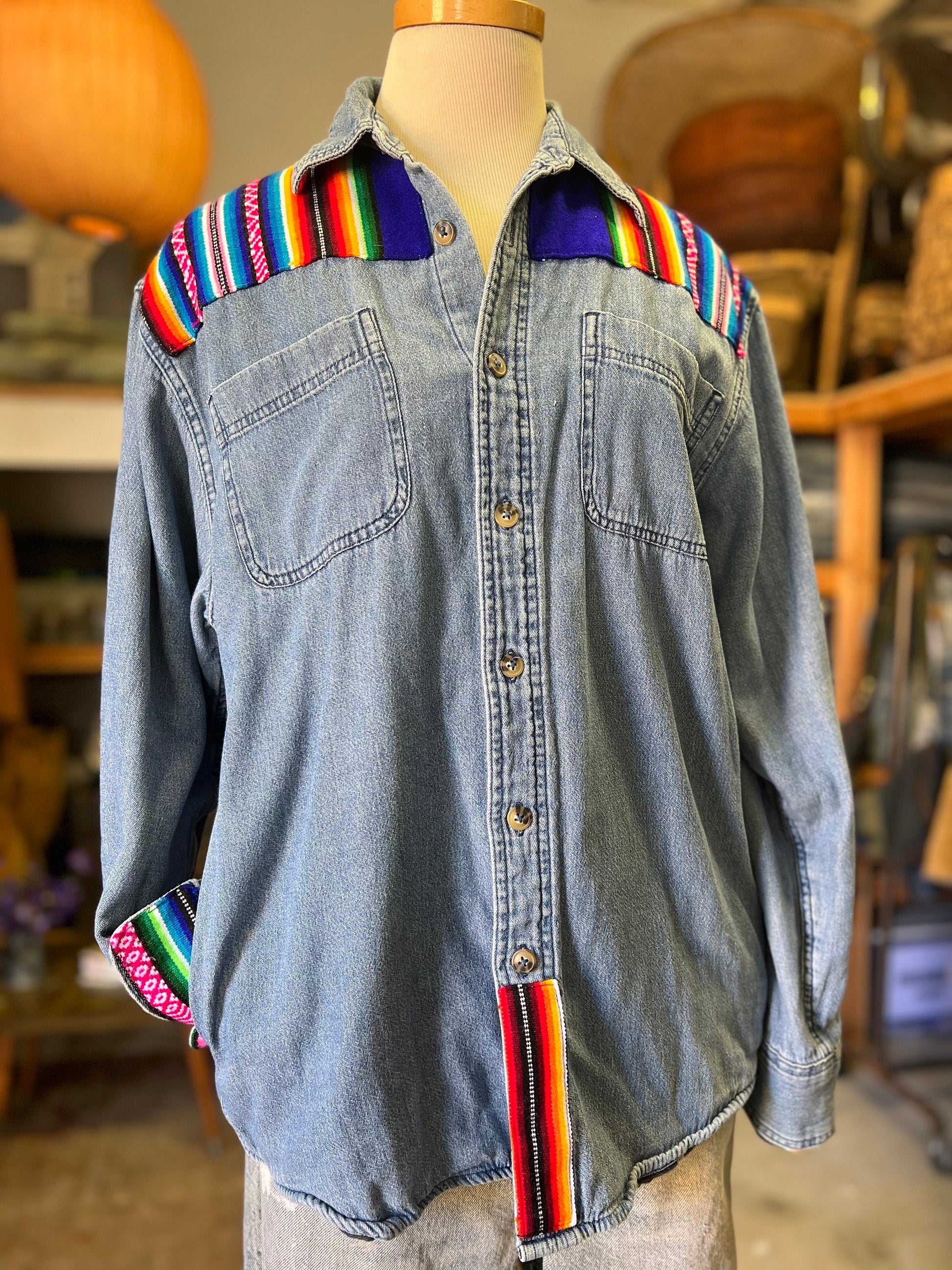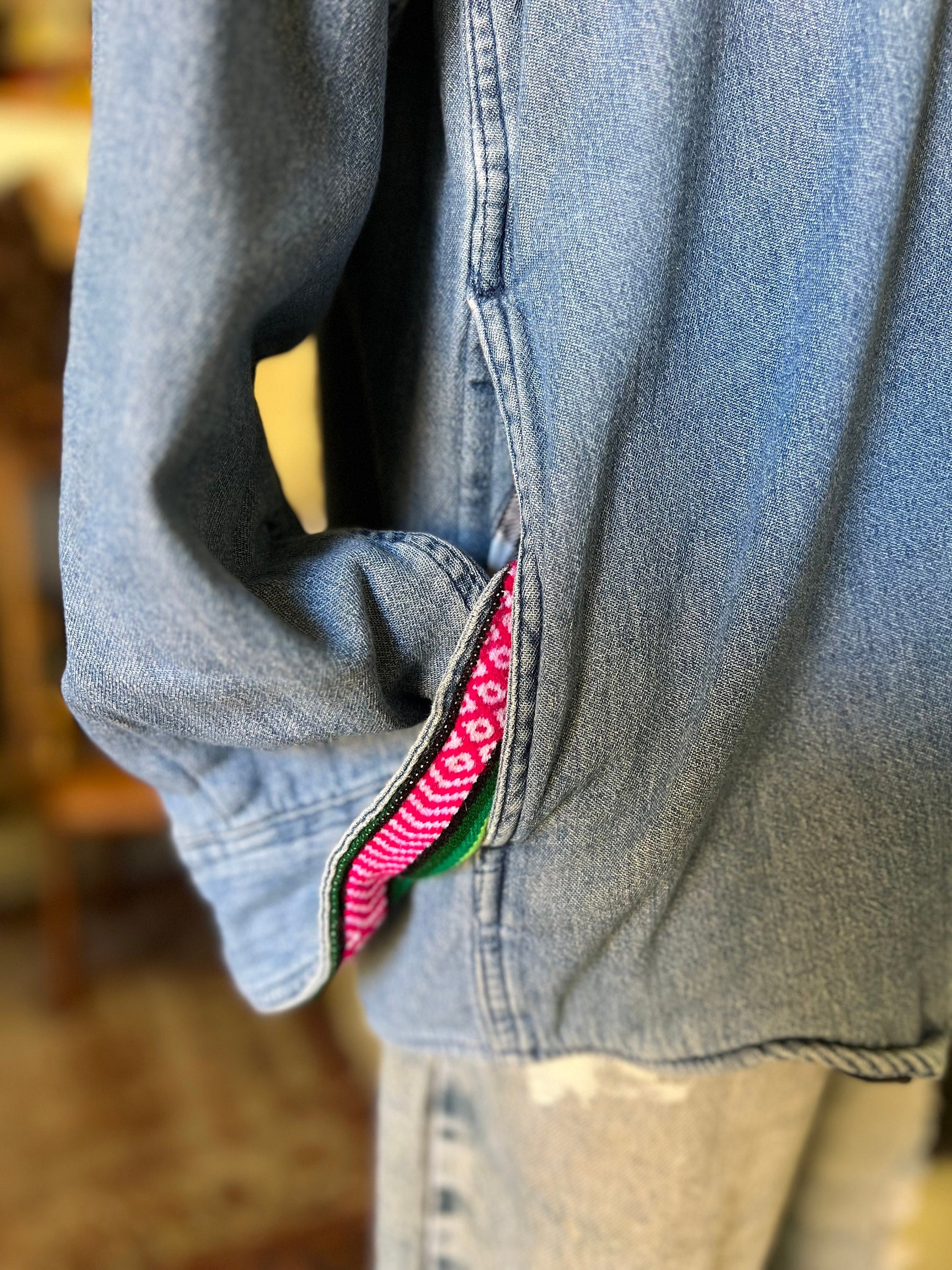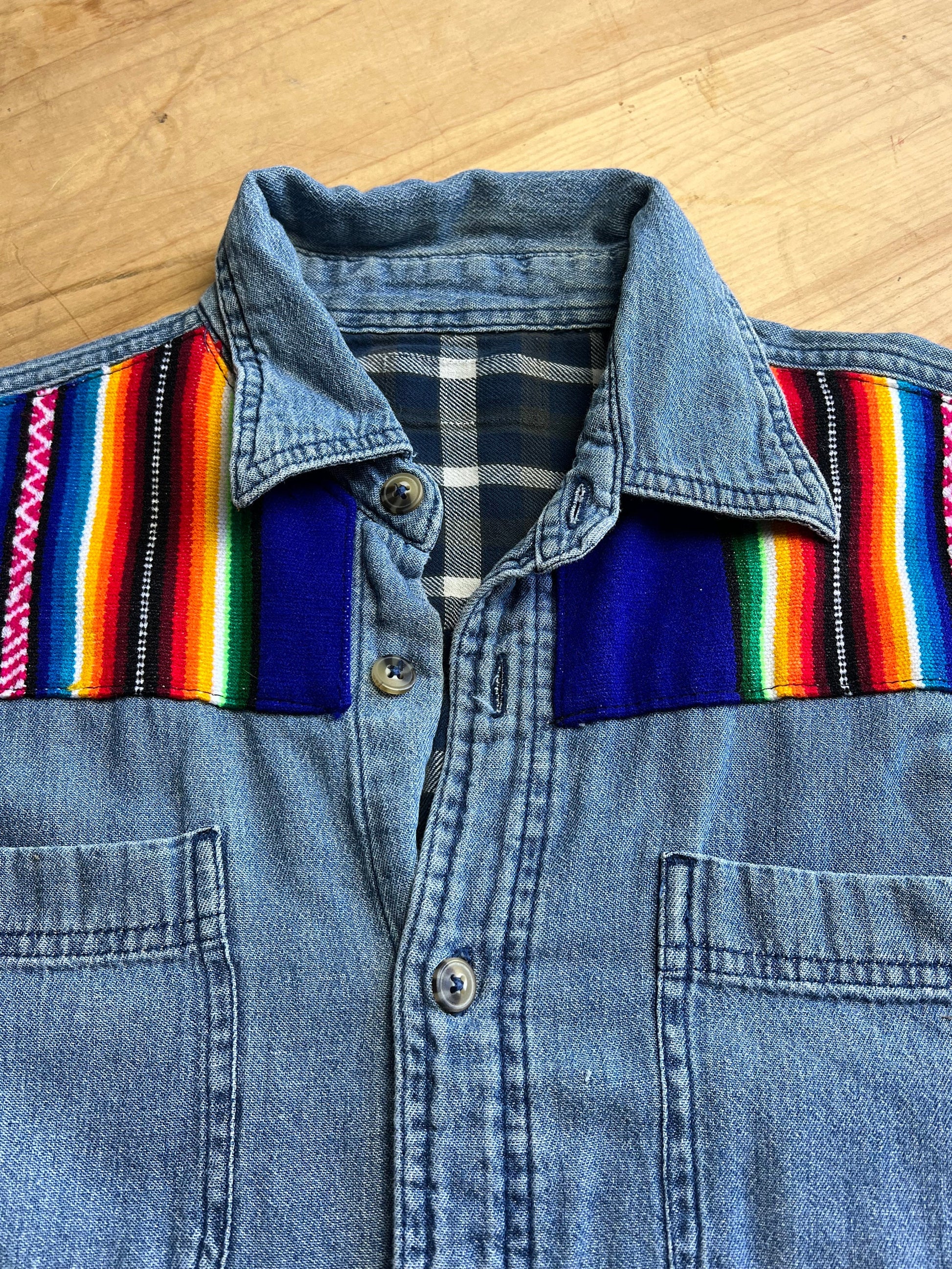 Vintage Flannel Lined Denim Shirt Serape Textile Accents w/ Pockets S
