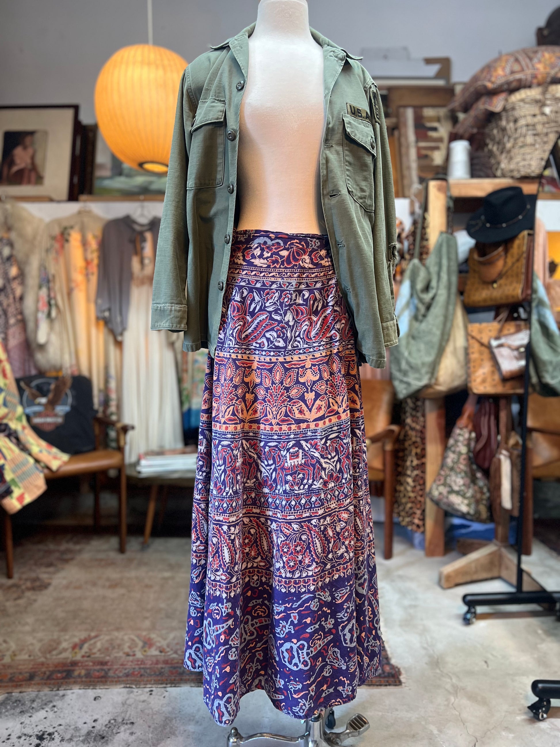Beautiful and dramatic vintage 70’s batik print maxi wrap skirt. Soft flowy cotton with a lovely fade. Tag reads Geeta Free Size and measures 39” long.
