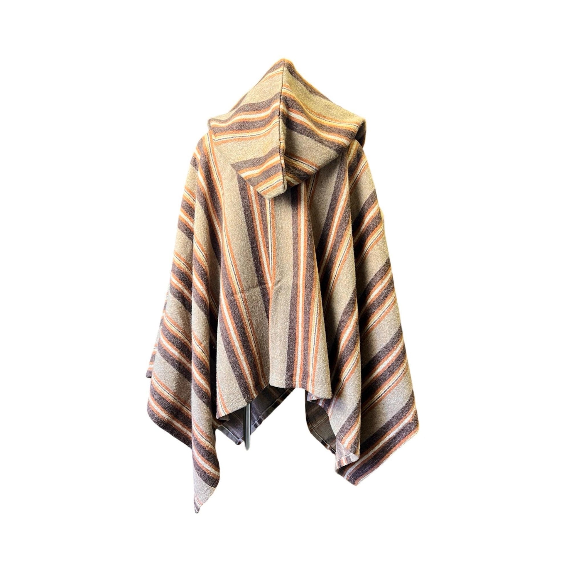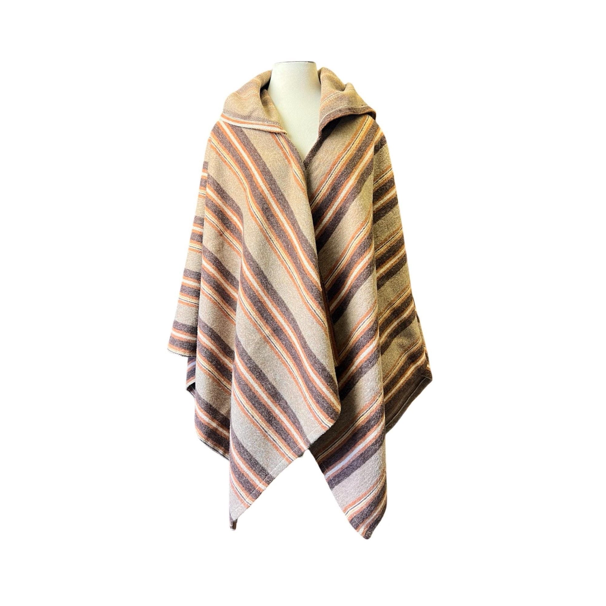 Another bohemain dream of a sweater, this 70’s handmade wrap open front poncho features an exaggerated hood and a beautiful warm earthy colorway with stripes of brown, tan, gold, and orange. One of a kind and one size fits all. Excellent vintage condition.