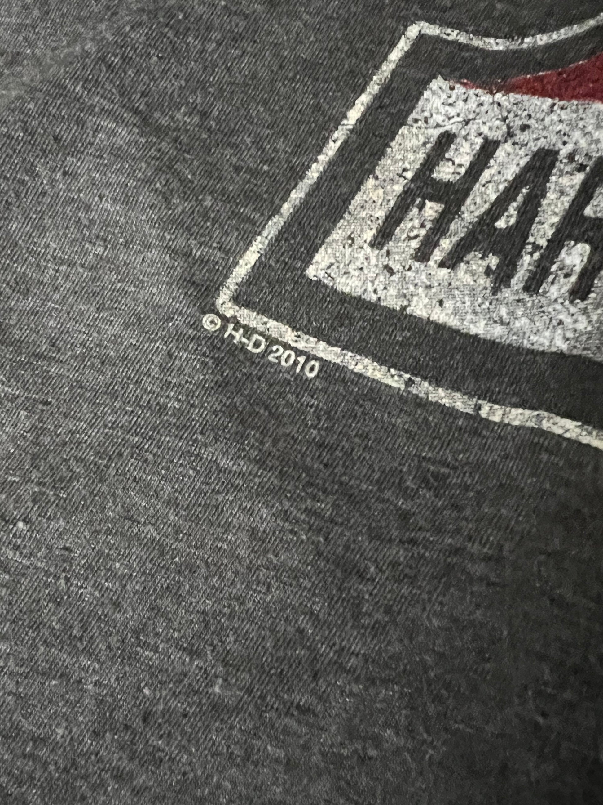 Vintage Harley Davidson USA muscle tee. Super soft and thin, altered to be a muscle tee, cut at neck and sleeves. Double sided graphics…Amercian flag number one on front, Windy City Chicago on back. Copyright HD 2010. Measures 18” across widest part, 28” top to bottom.