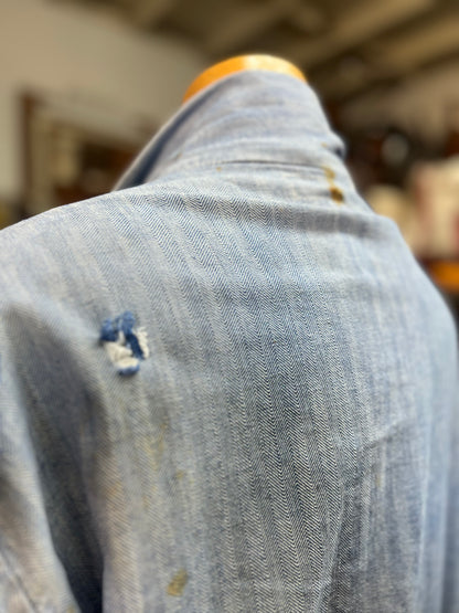 Vintage 1950’s heavily distressed herringbone twill denim jumpsuit size 46. This one is the softest and longest in the lot. Tons of allover distressing consistent with age including spots, stains, holes, patches, dirt, and rust spots. Large holes in forearms of both sleeves. This one buttons up the front and has two open “through pockets”. THE softest den jumpsuit ever!! This one is great. Measures 21.5”’across waist with a 31” inseam.