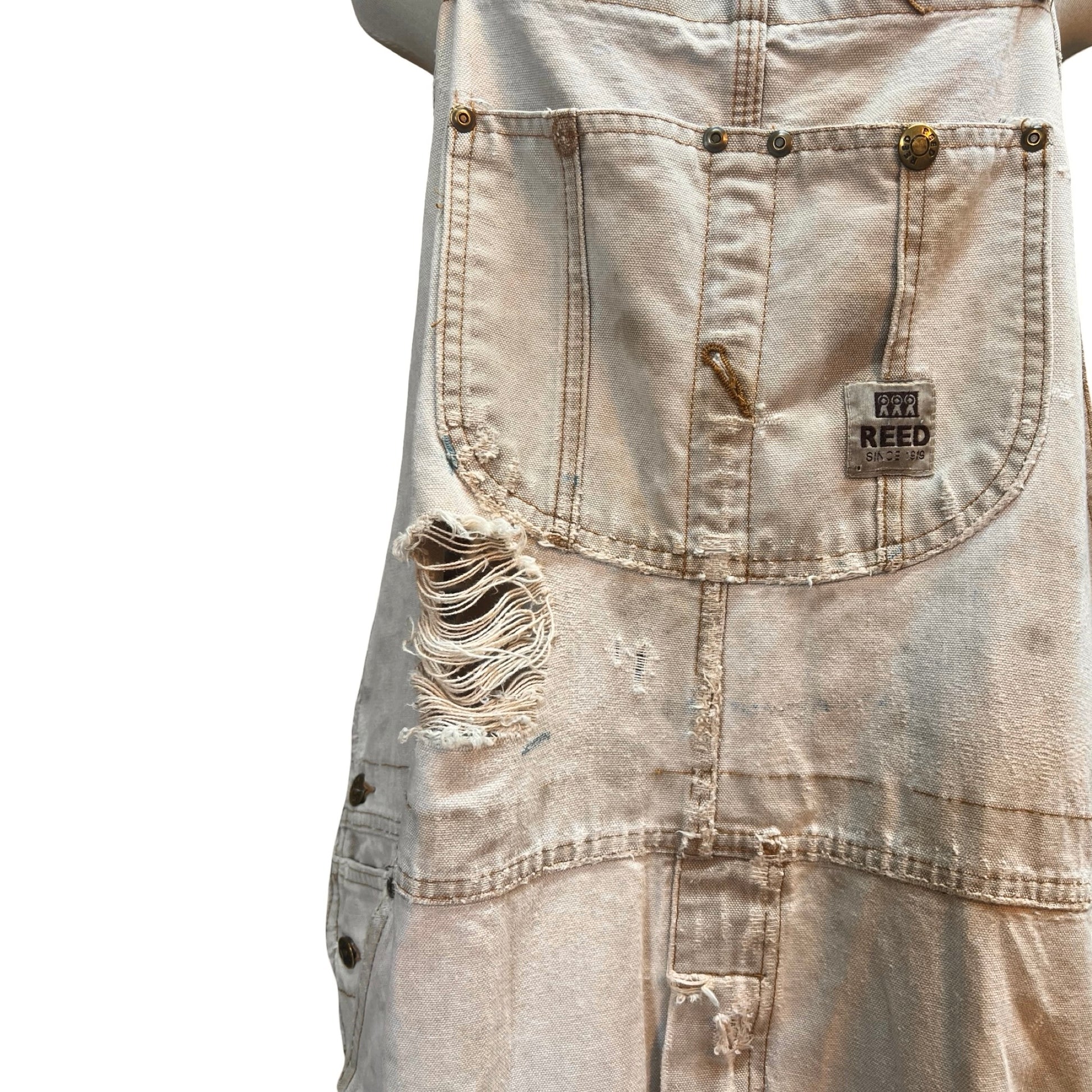 Vintage HEAVILY distressed and super oversized Reed canvas double knee overalls. Stains, spots, and holes throughout. These are giant!! Size 52. They’ve been cut at the bottom and hems left raw. See pics for how I style them. These are not your body-con slimming overalls by any means, but they’re cool and I love them and I think you will too.