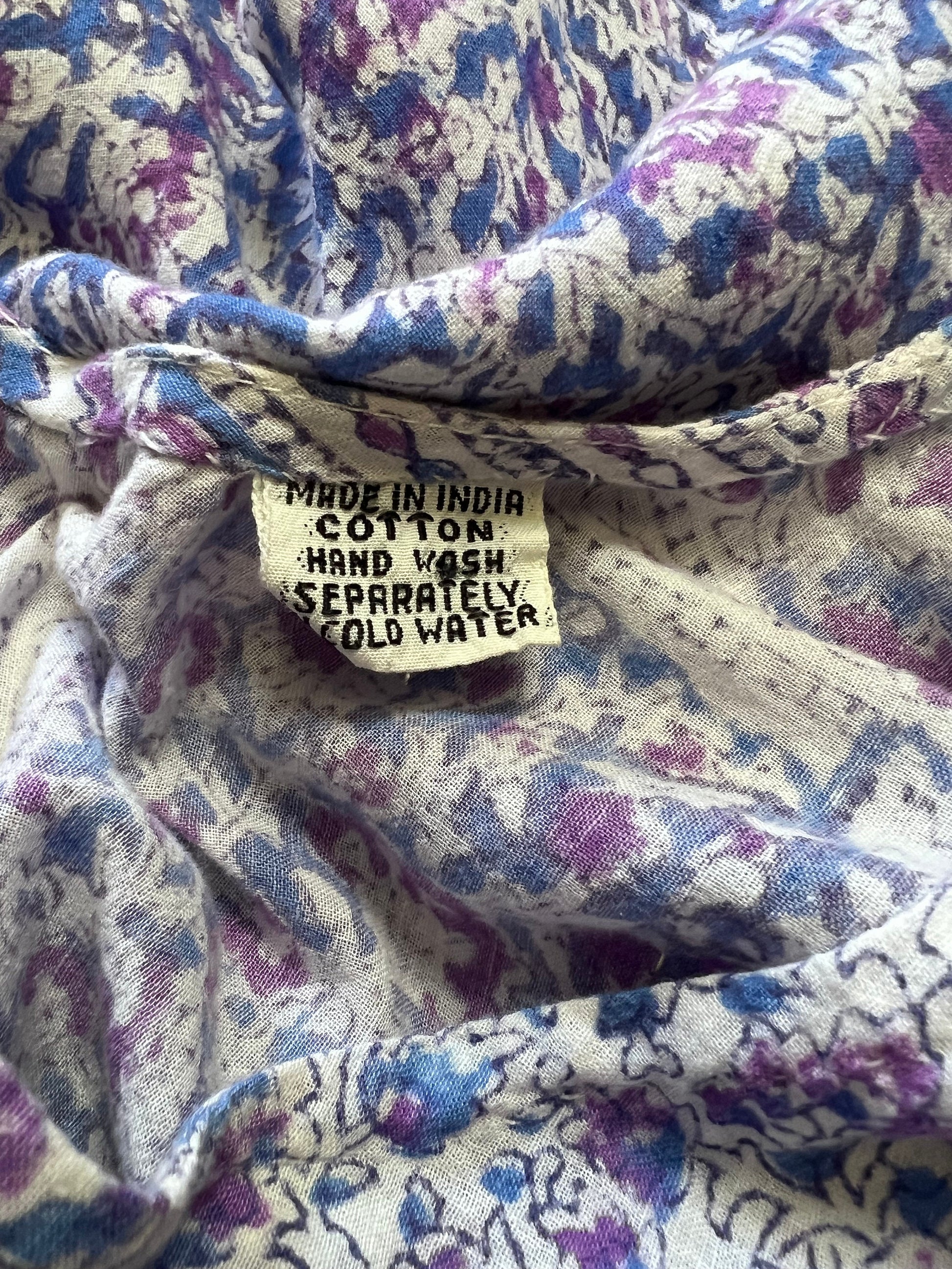 Vintage 100% cotton Made in India block print dress features 3/4 angel sleeves, scoop neck, and a rare beautiful lavender & blue colorway. Great vintage condition, thin drapey cotton.