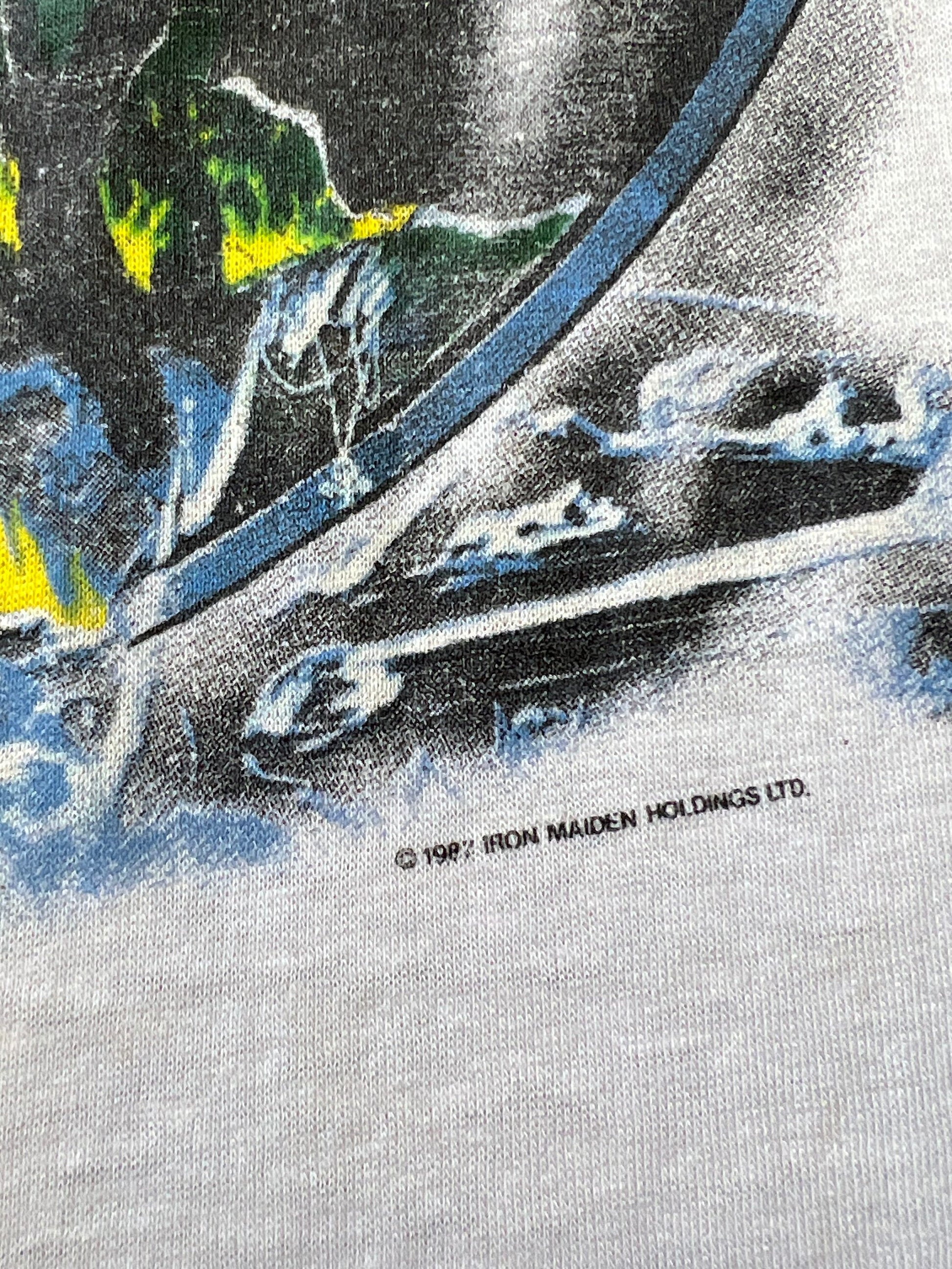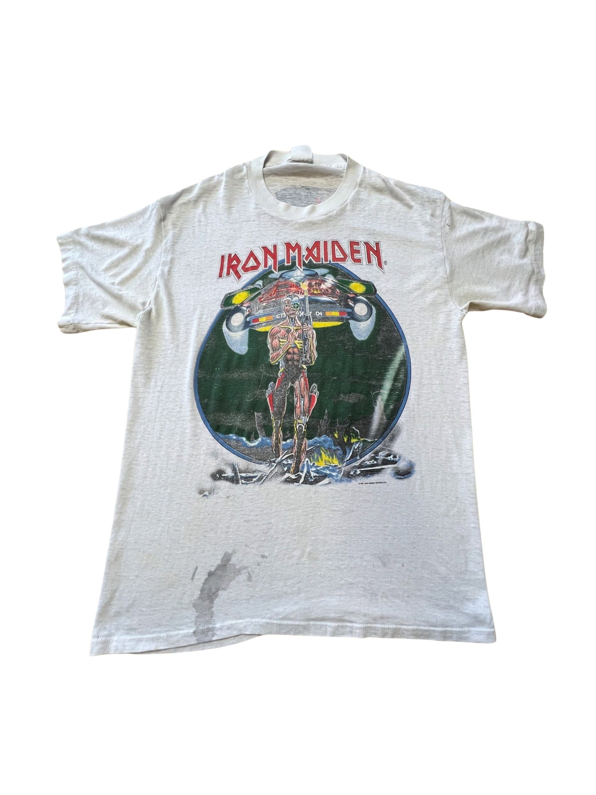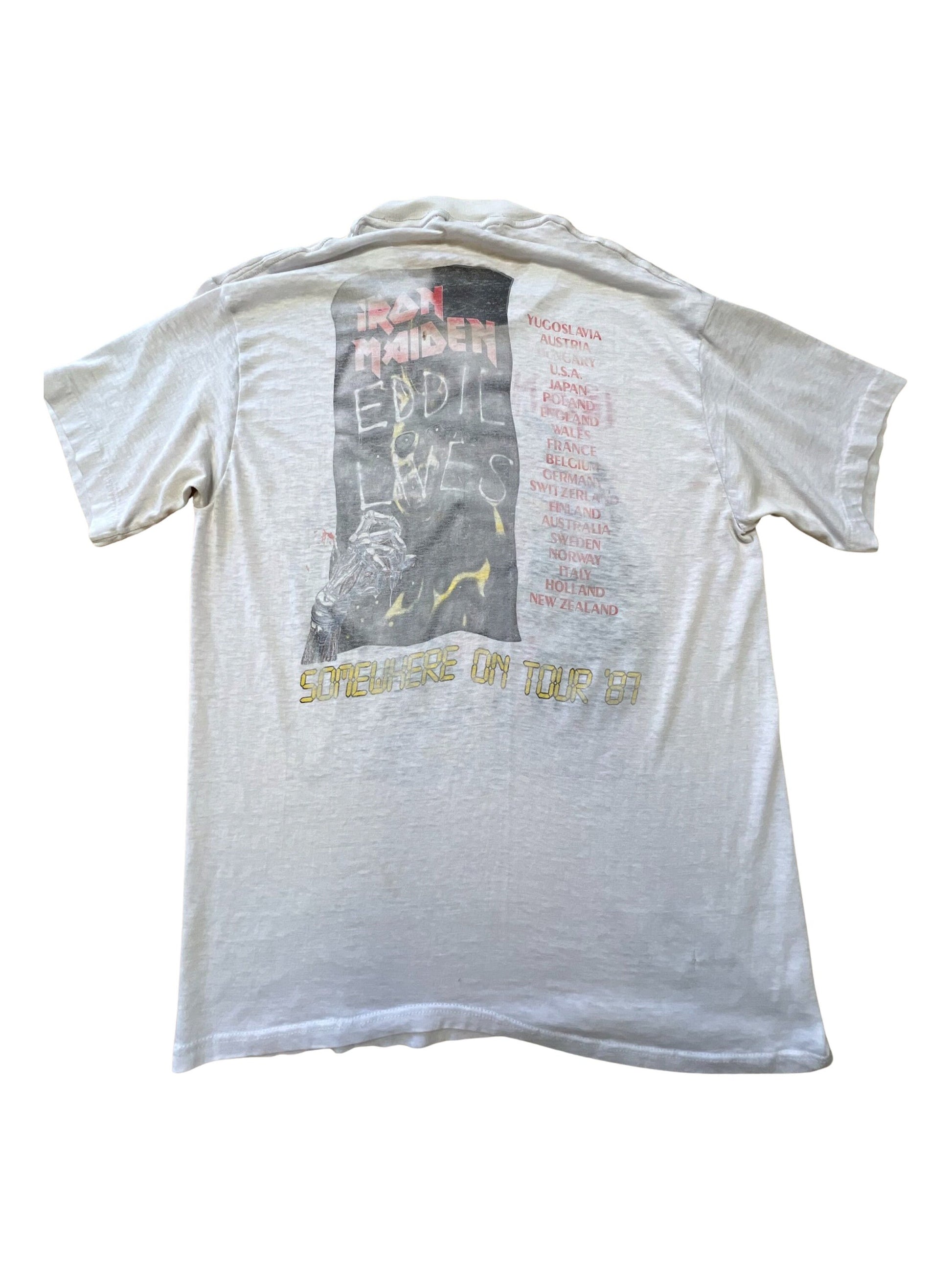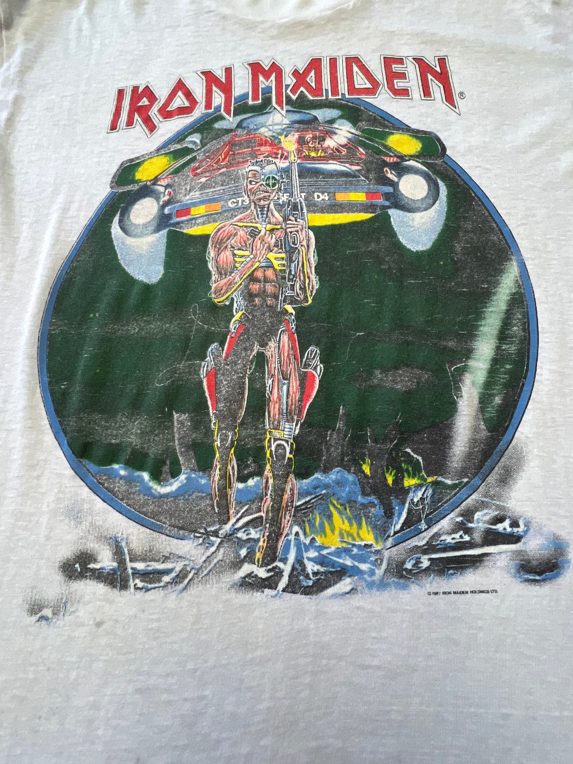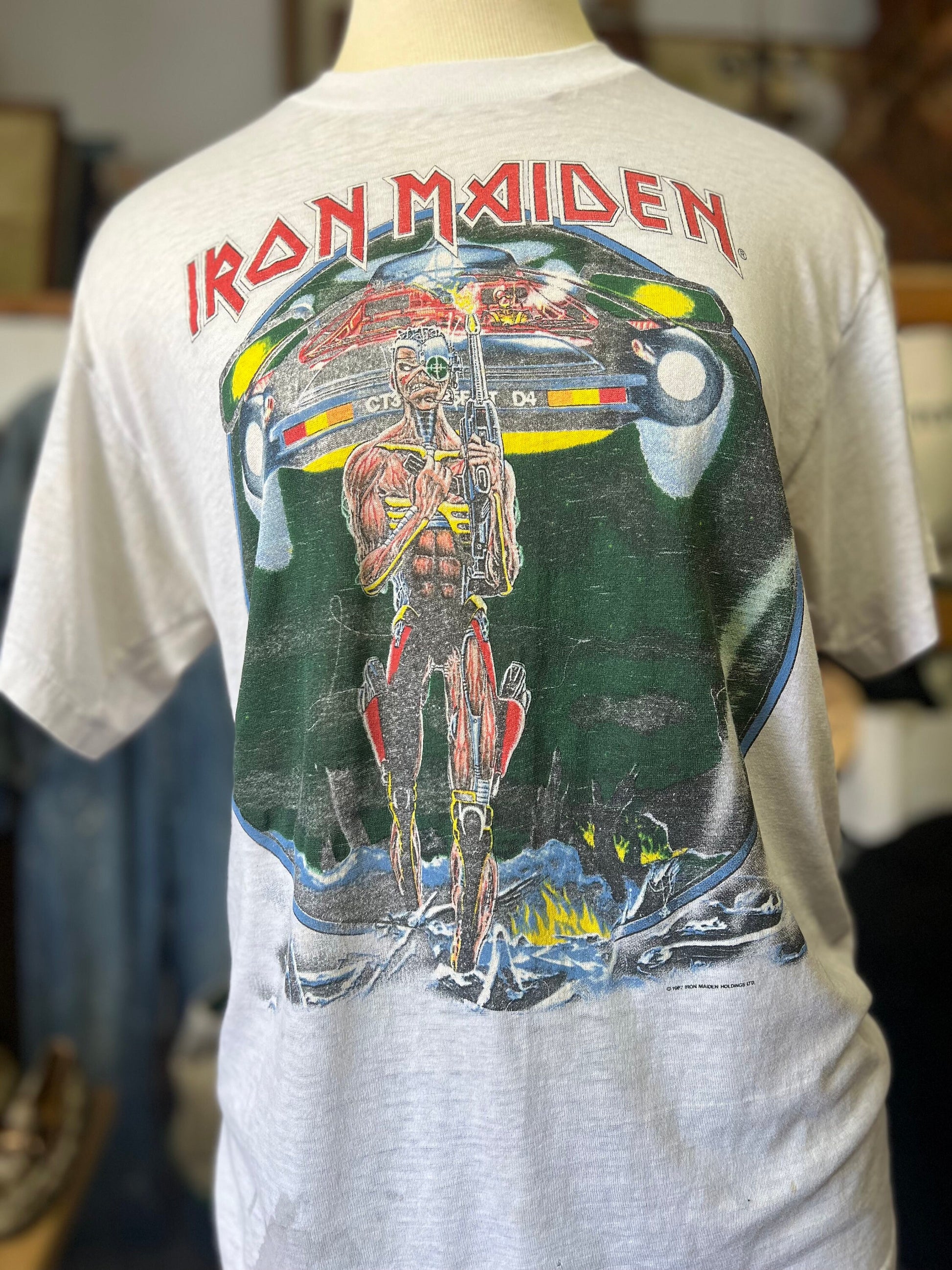 Vintage single stitch Iron Maiden Somewhere On Tour ‘87 shirt with front & back graphics. This shit is very well worn, paper thin, super soft with some small holes and runs throughout and a stain in front. Copyright mark Iron Maiden Holdings Ltd. No size tag but measures 19” pit to pit and 26” top to bottom.