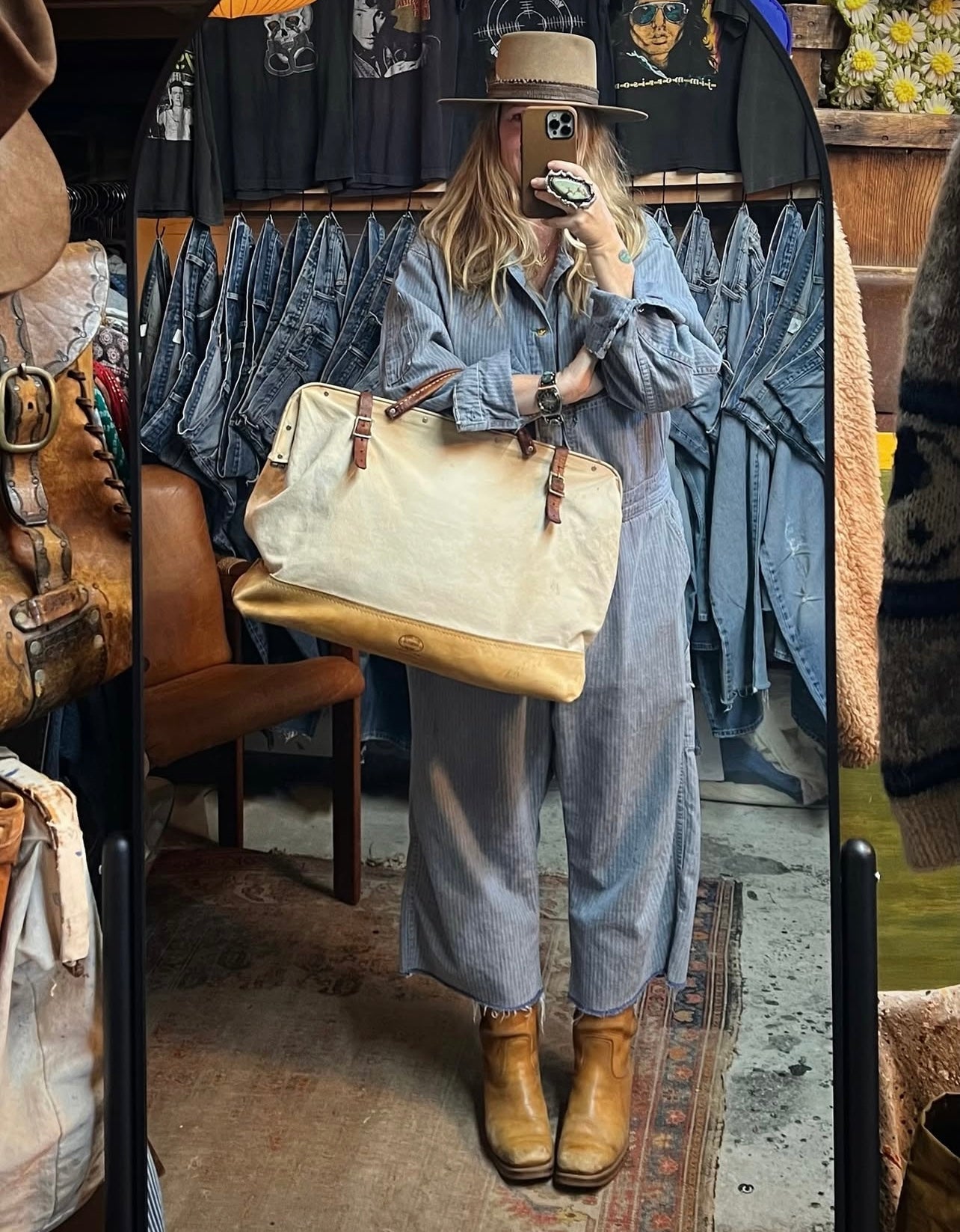 This oversized Key Imperial herringbone twill denim jumpsuit is definitely my favorite in the lot, and the biggest & shortest. Cut off raw hems, zipper front, open through pockets on side, small hole in back, and drop crotch oversized fit. Measures 21.5” across waist and 20” inseam (but sits longer since it’s drop crotch). I definitely wore this one the most!!