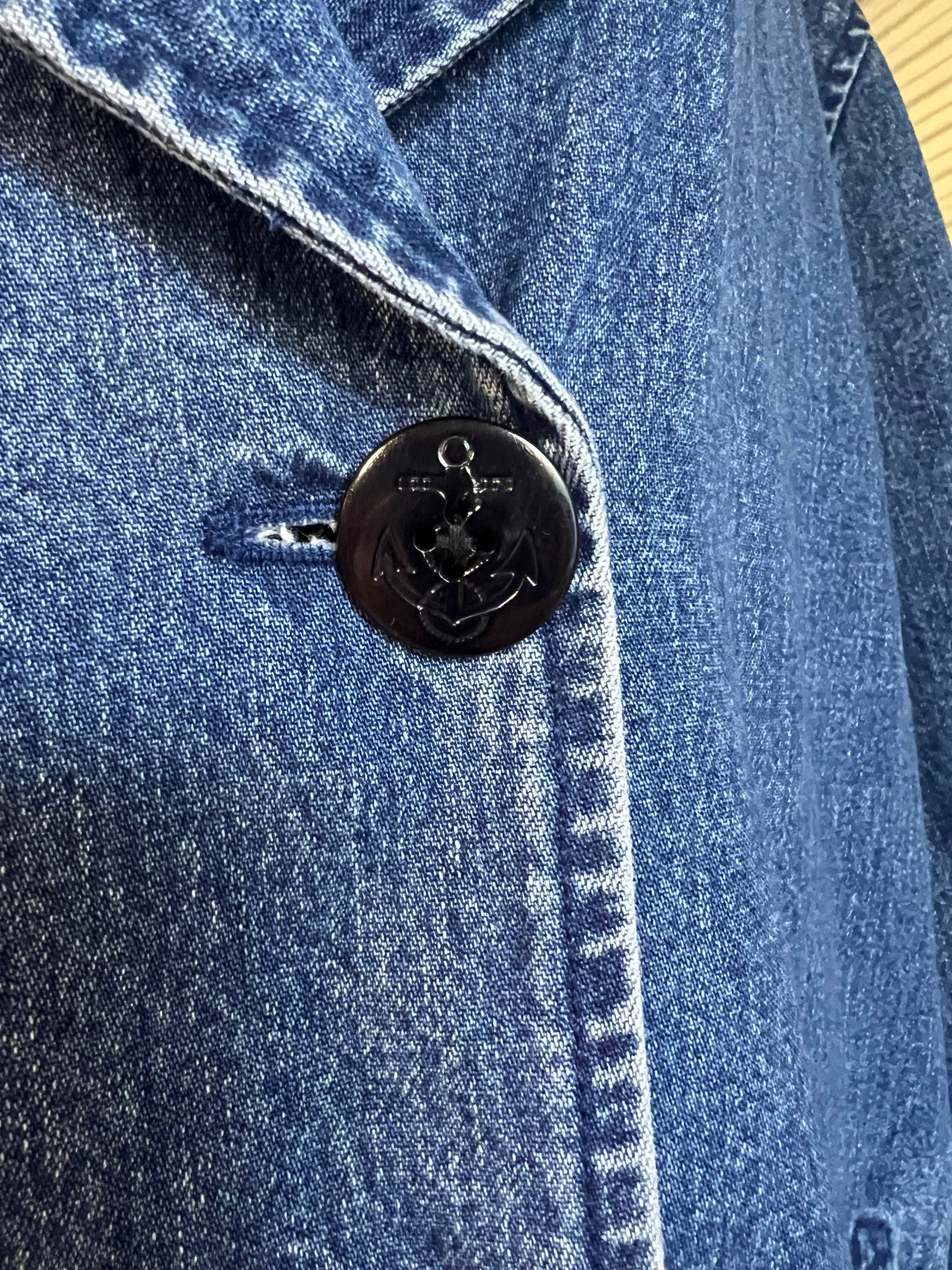 Vintage Lauren Jeans Co. Ralph Lauren denim double breasted pea coat features eight anchor motif button front, four interior buttons, and two front slash pockets. No size tag but this coat is definitely oversized, approximately a women’s XXL. Denim is medium wash, soft and worn in.