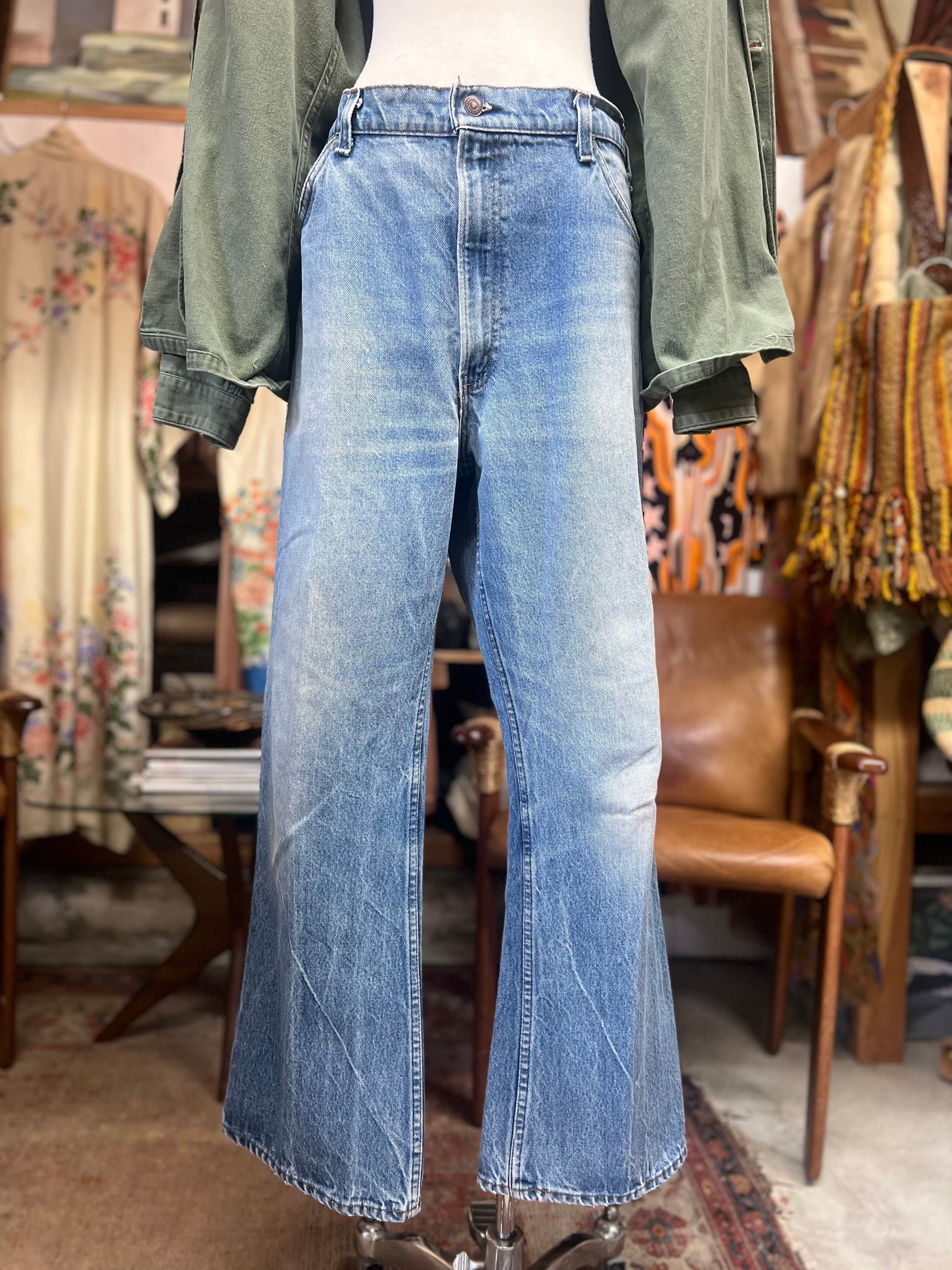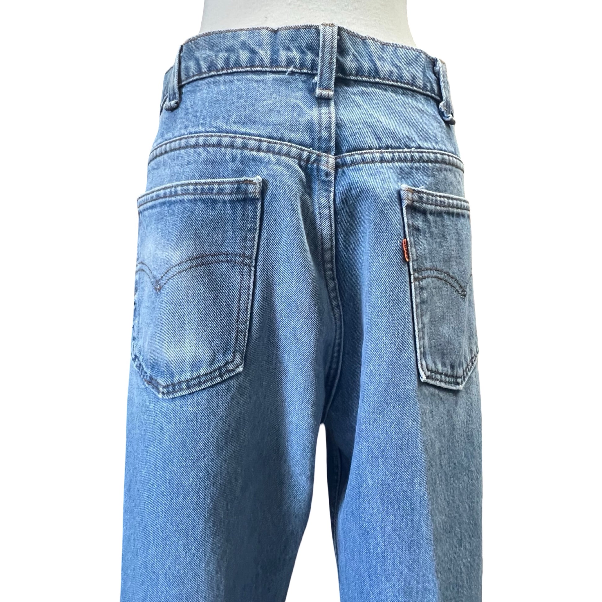The perfect pair of true vintage Levi’s 517 orange tab zip fly flare jeans in a really hard to find bigger size. No size tag, actual measurements 19.5” across the waist with a 30.5” inseam. *pinned on mannequin