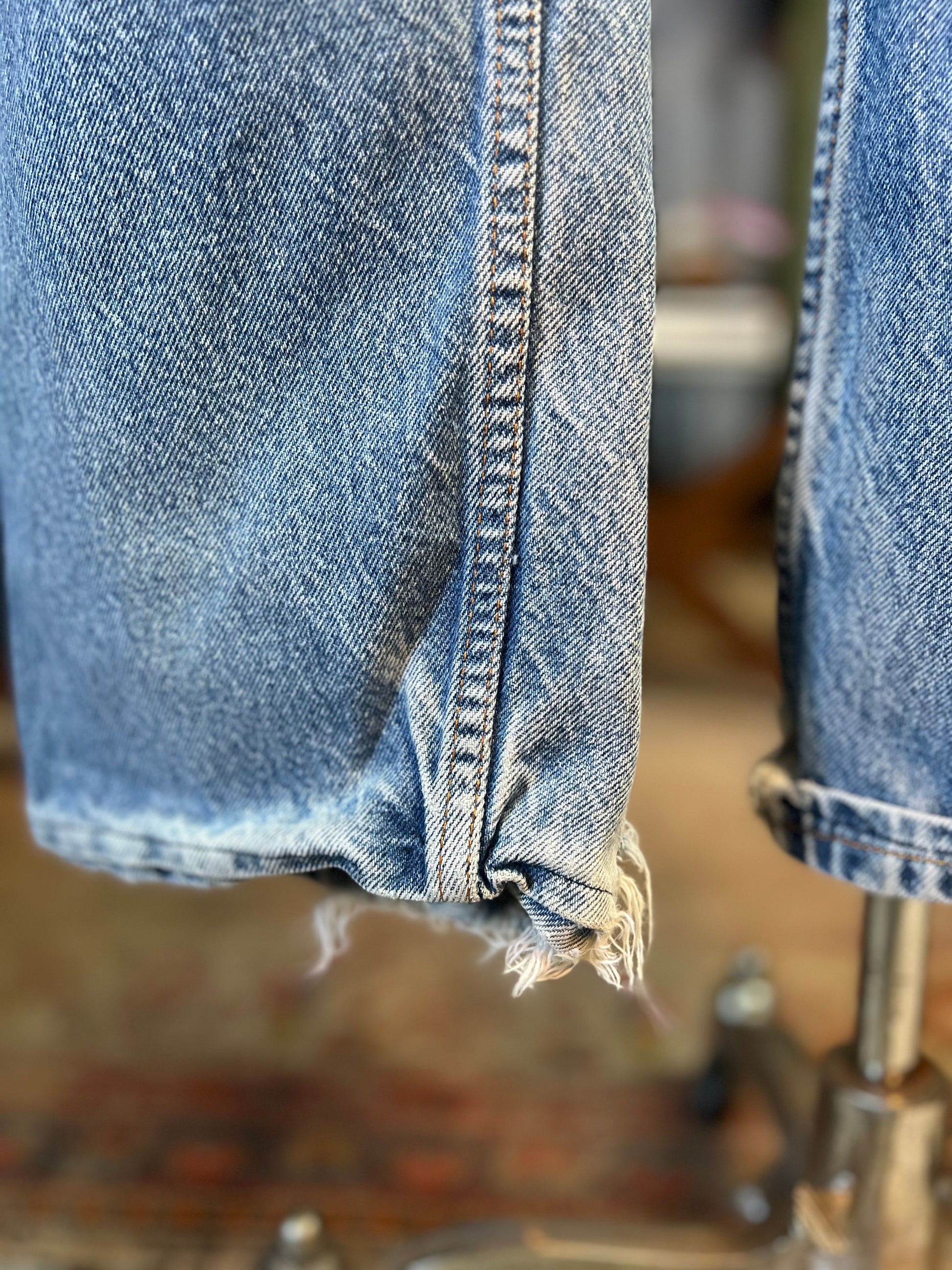 Vintage perfectly distressed Levi’s orange tab 505’s. Great overall fade and distressing to the hems, tag size is 42 x 30, actual size 40 x 28. These are loose and meant to be worn cinched with a tie through the front belt loops or paper-bag style with a belt. *pinned on mannequin