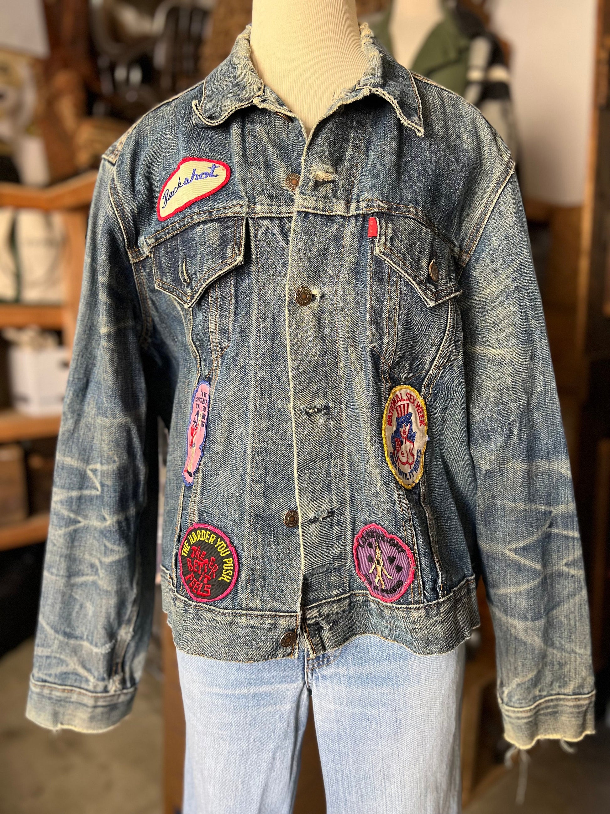 Not for the faint of heart, this heavily patched vintage Levi’s jacket features some cheeky patches full of innuendo and loaded in personality! Nice fade and patina on the jacket itself, this one’s a show-stopper for sure. No size tag, measures 22” pit to pit and 23” base of collar to bottom.