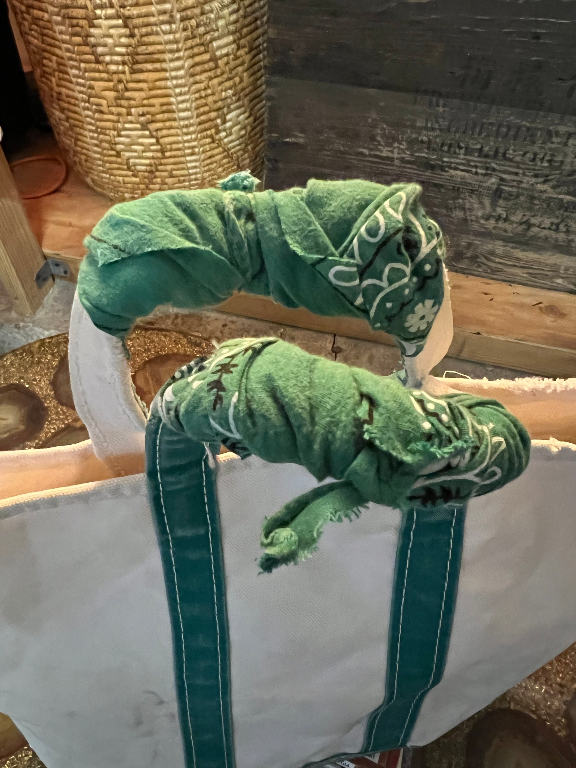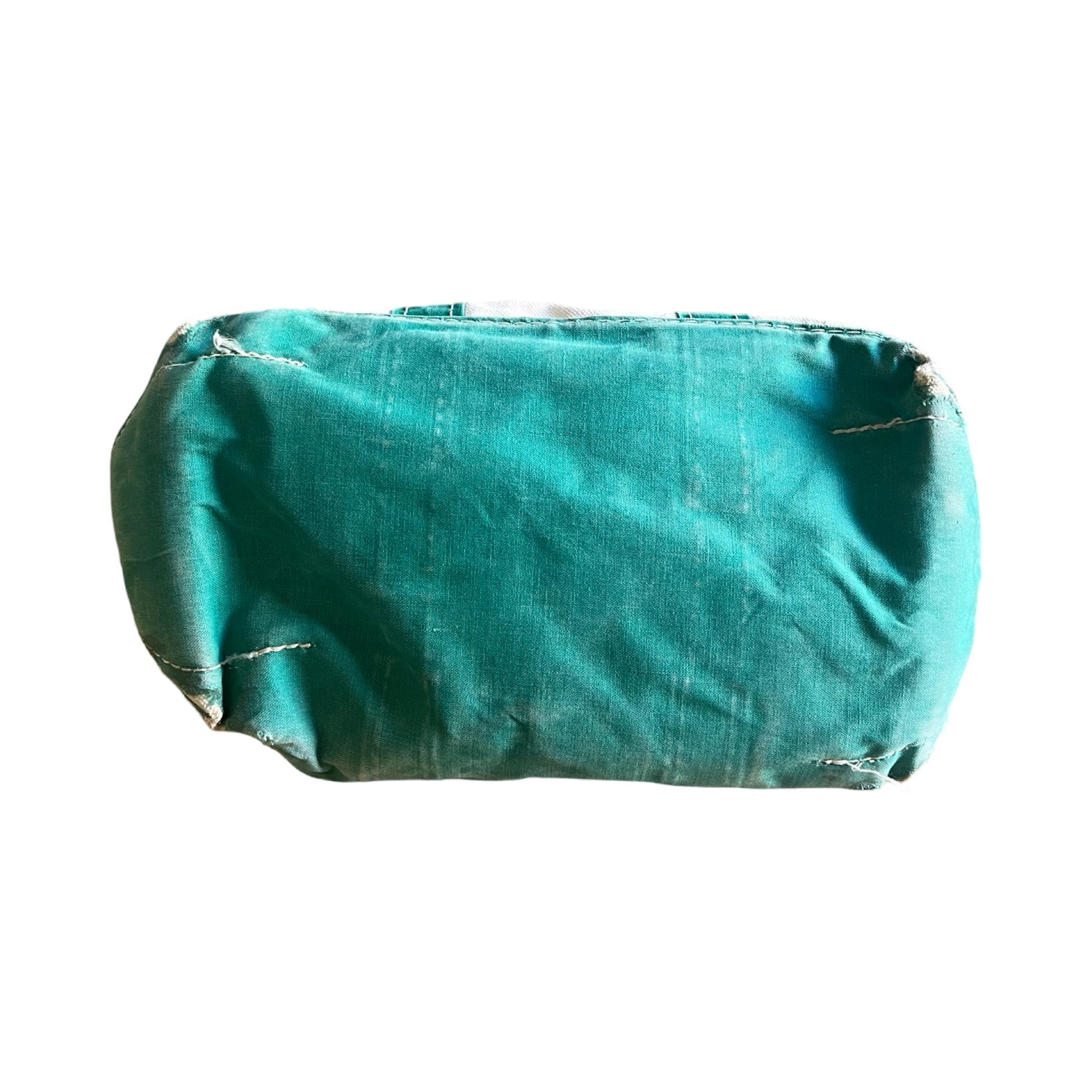 Classic vintage LL Bean canvas Boat & Tote size small. Handles are shredded but wrapped in a vintage bandana…just adds to the charm! Some stains and wear all throughout. This little one is worn to perfection and looks like you’ve had it for years. Would make the perfect lunch bag! I collect these and in my opinion, the more worn & tattered the better. Measures 15” x 11” x 9”.